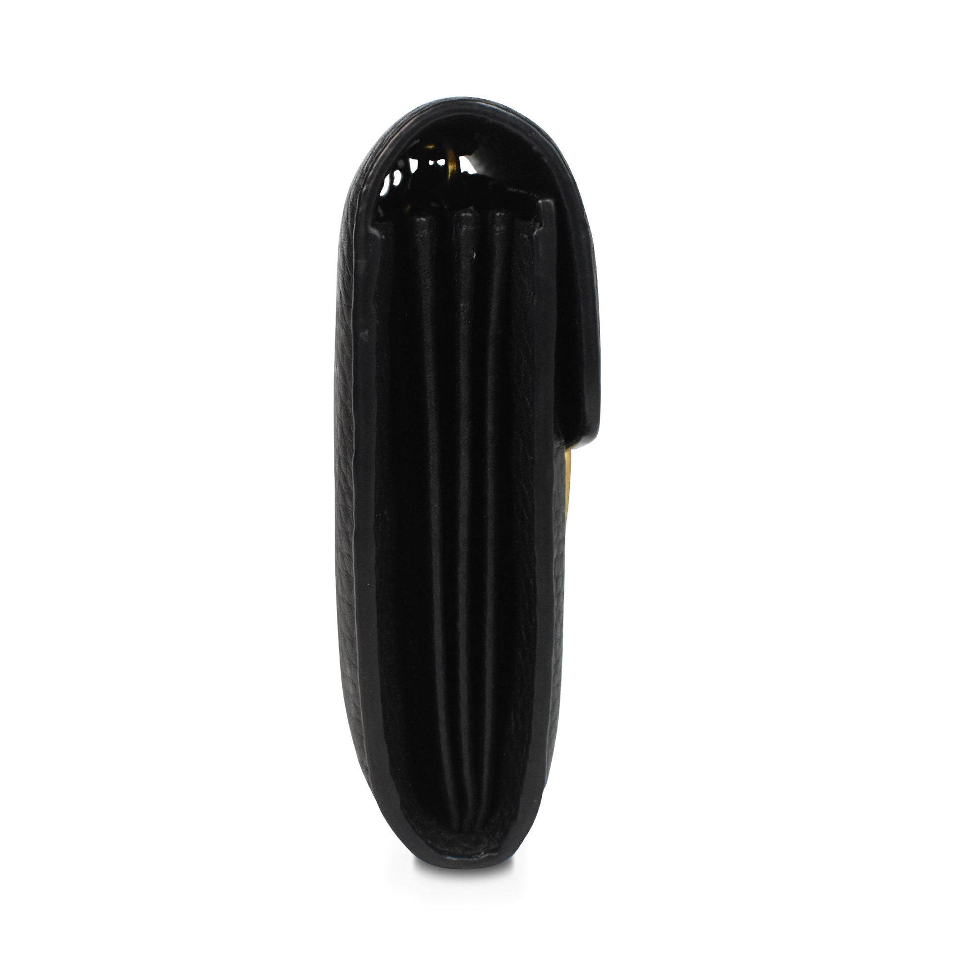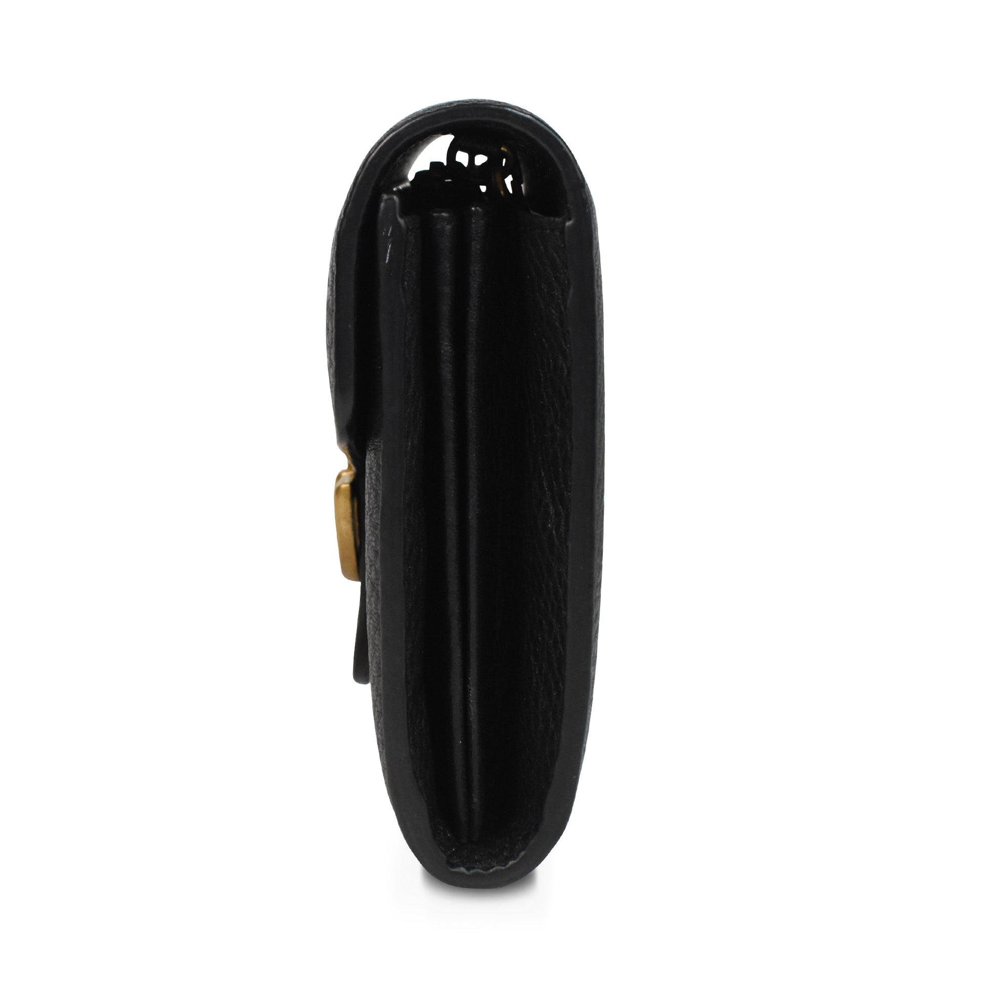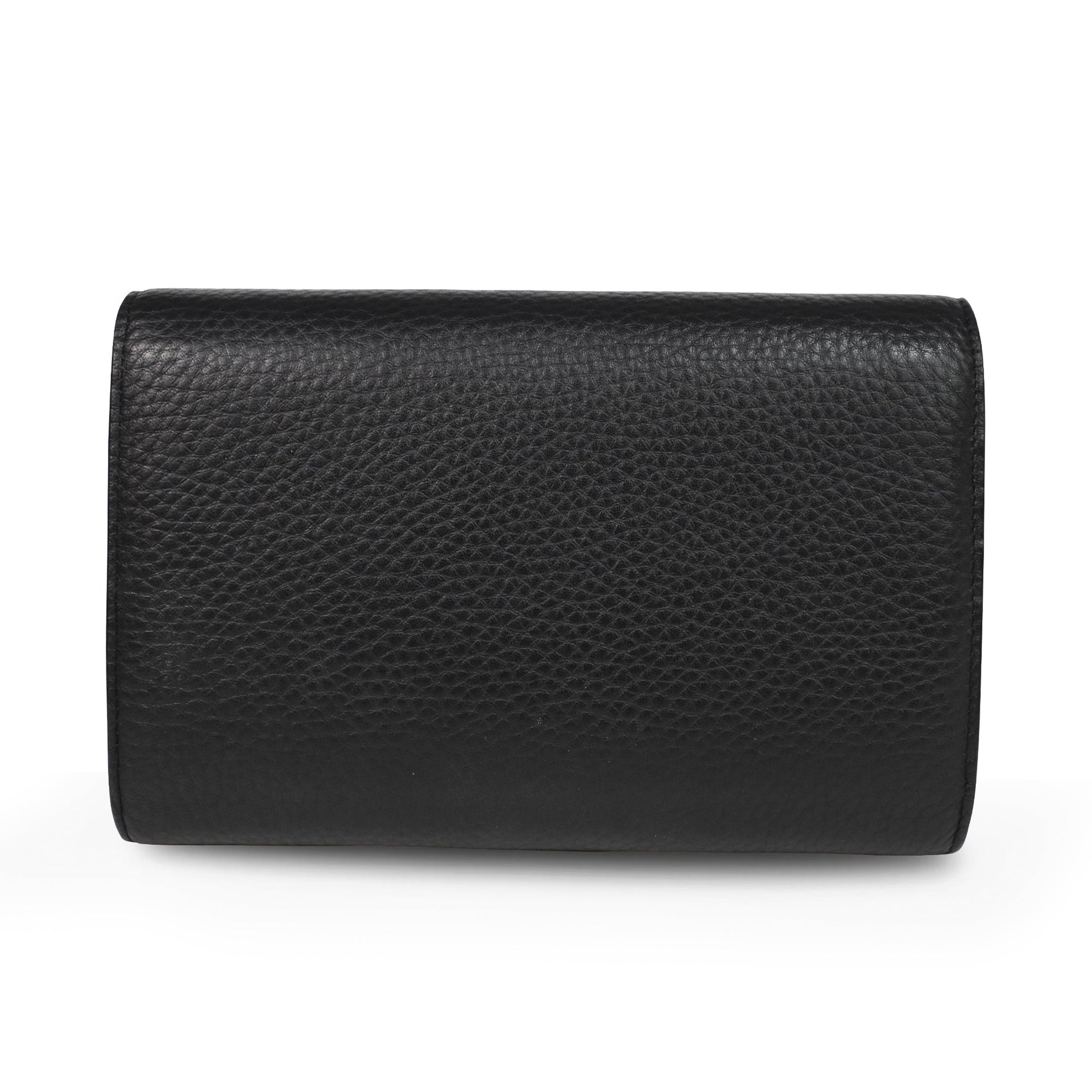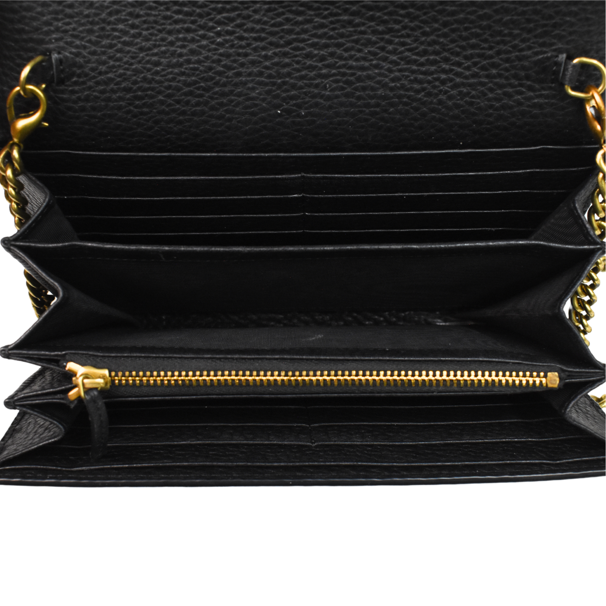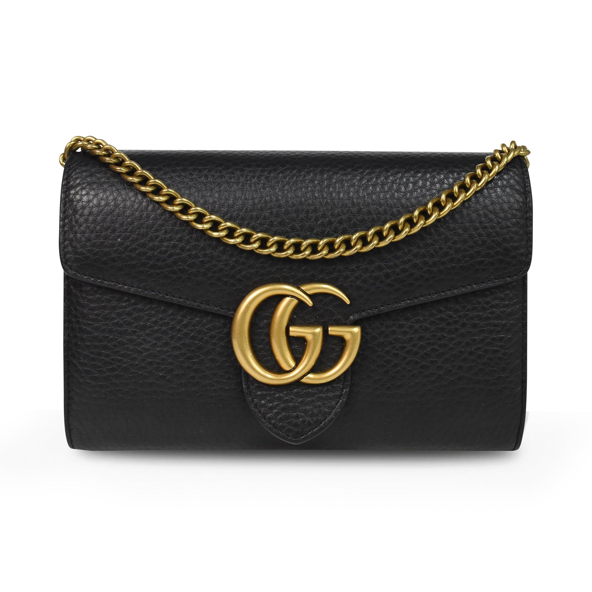 Gucci 'Marmont' wallet on chain in black pebbled leather with gold hardware 'GG' logo on the front and a removable long chain strap. Features front flap magnetic button closure and multiple card slots, 4 main compartments, and a zip pocket in the interior.