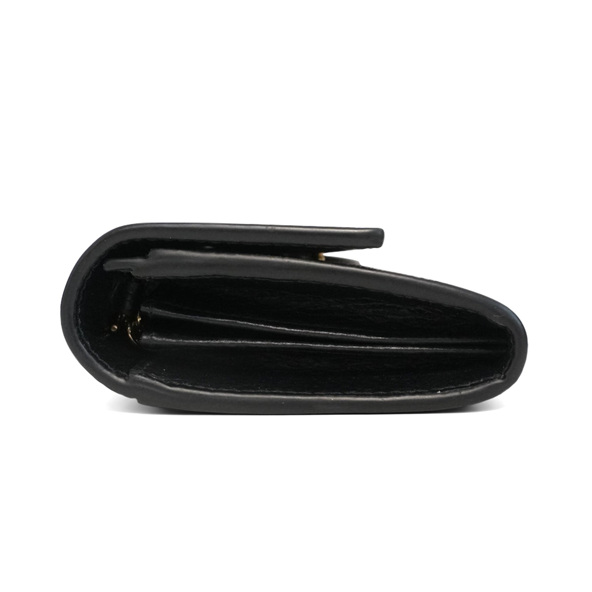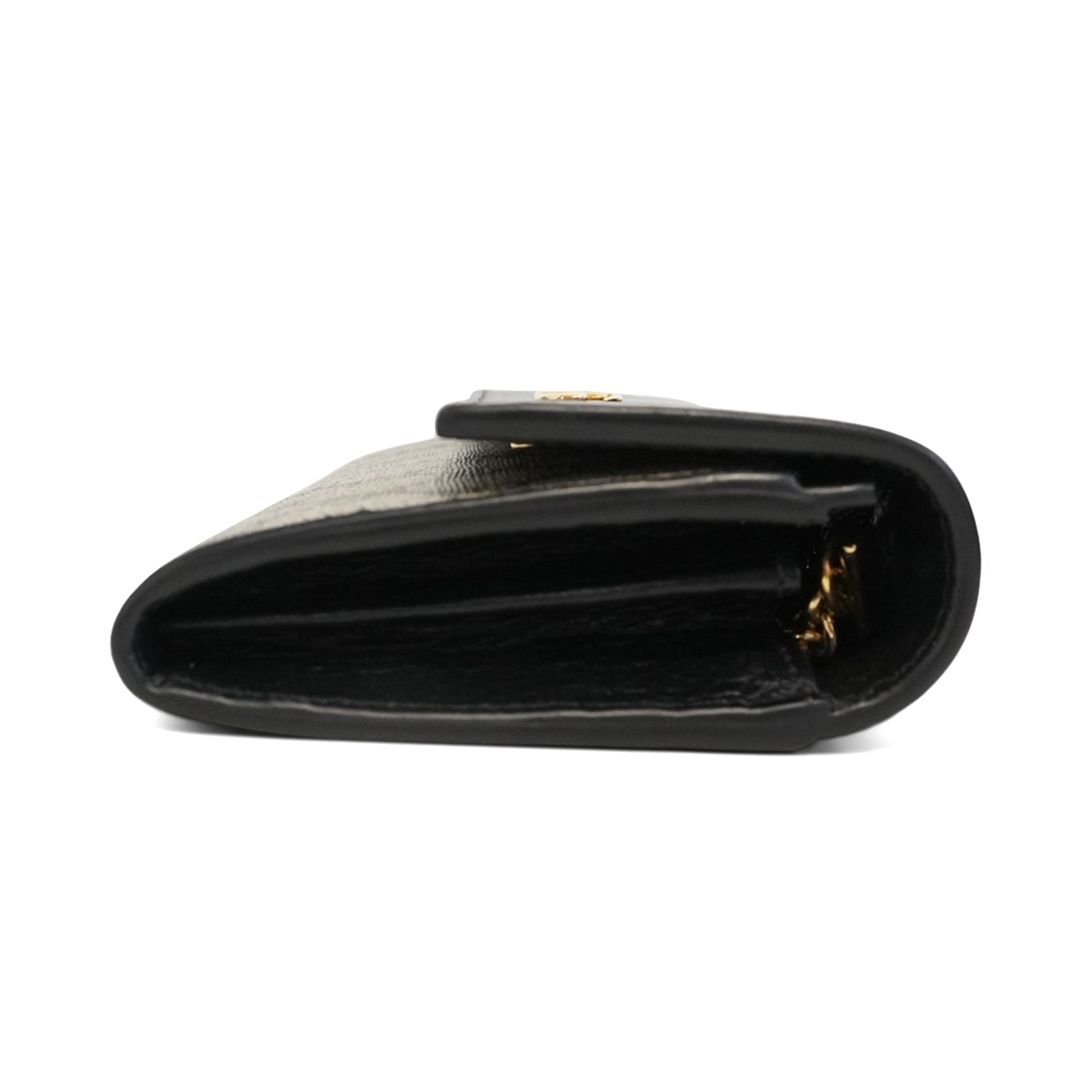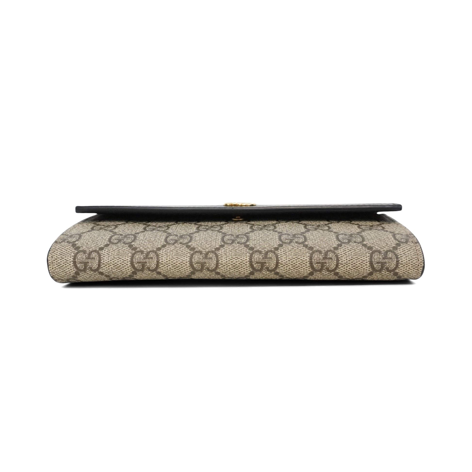 Gucci 'Marmont' wallet on chain in monogram coated canvas with a black leather flap and gold GG hardware. The interior has 12 card slots, 3 slip pockets, and a zip pocket. Features a removable gold crossbody chain.