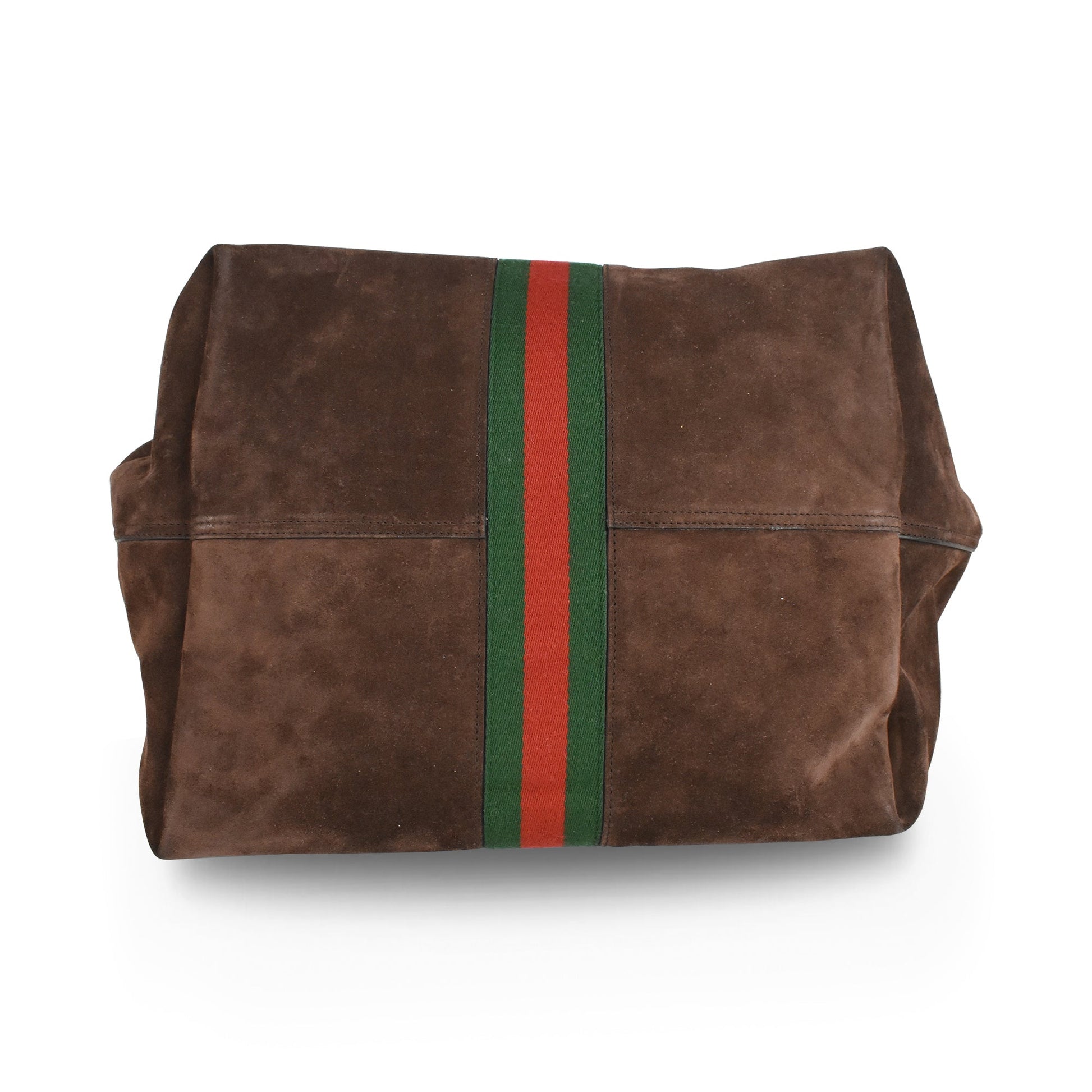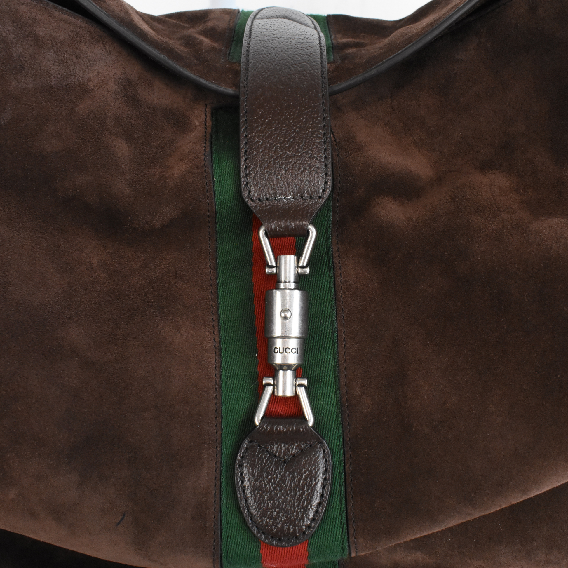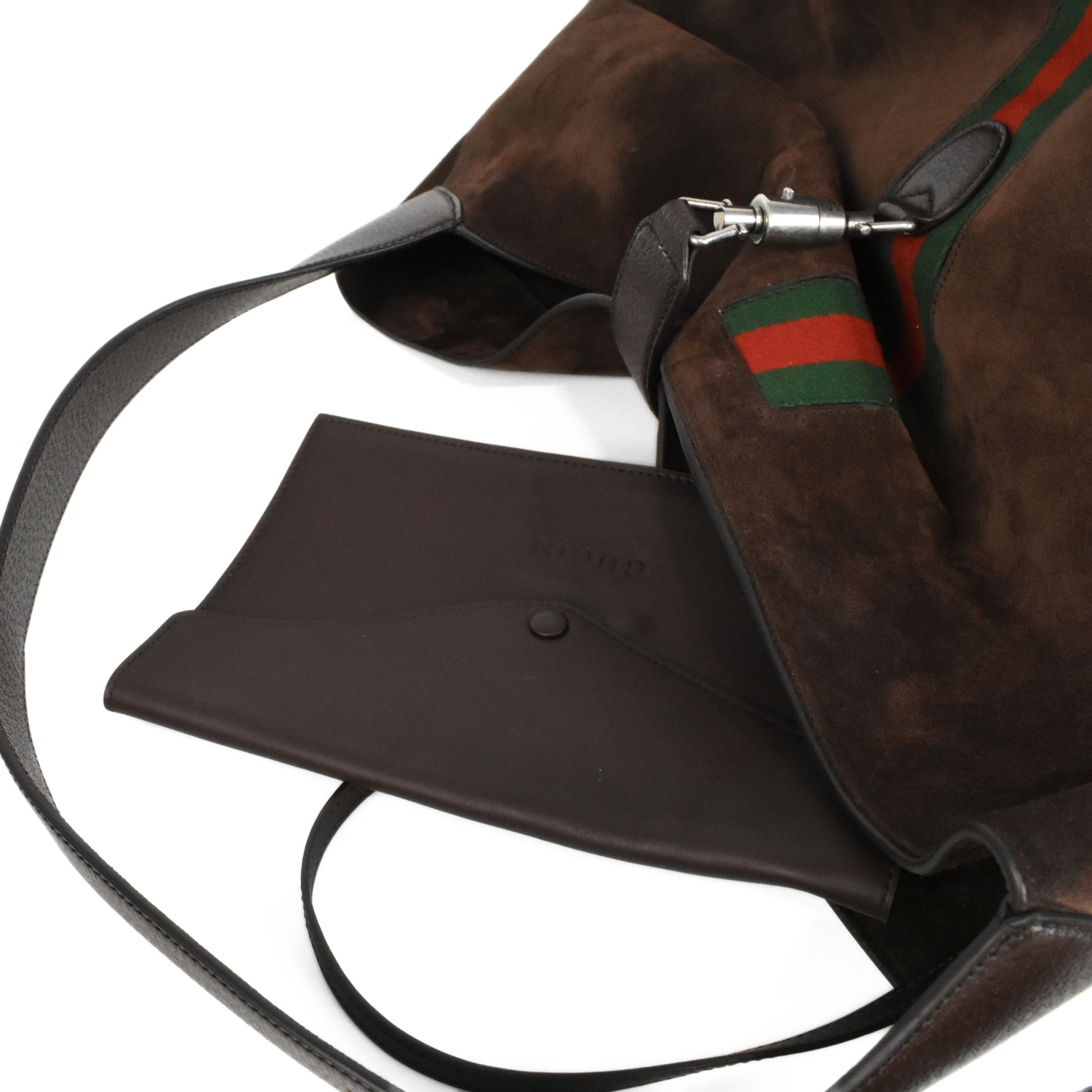 Gucci 'Medium Jackie 1961' oversized hobo style shoulder bag in dark brown suede and leather with red-green racing stripe detail and gunmetal piston push-lock closure. Features a full leather lining and leather zip pouch that clips into the bag.
