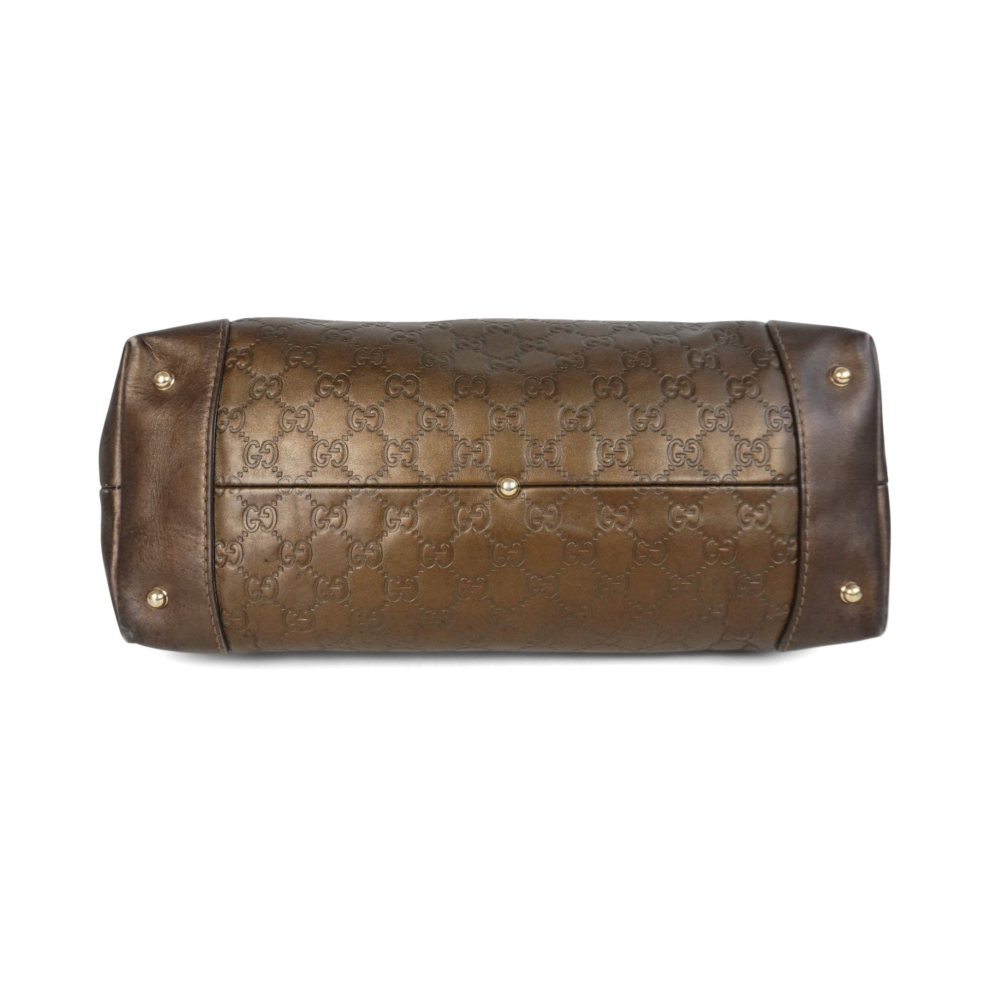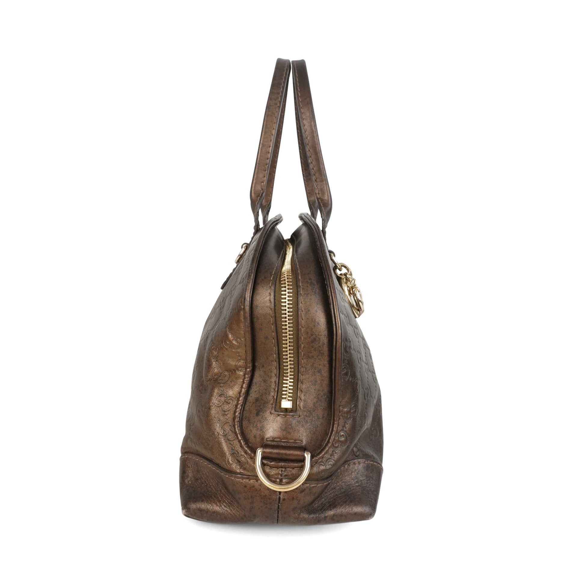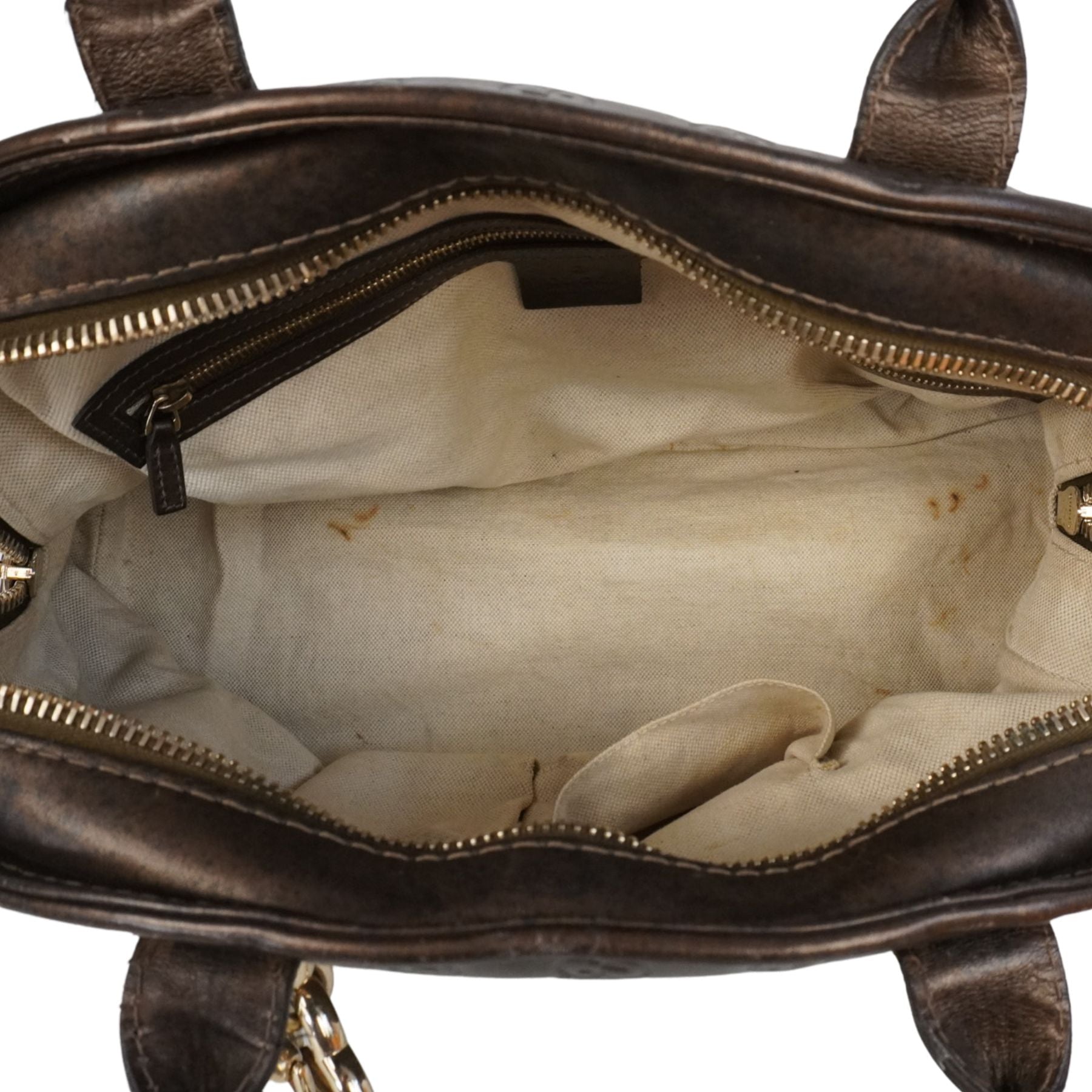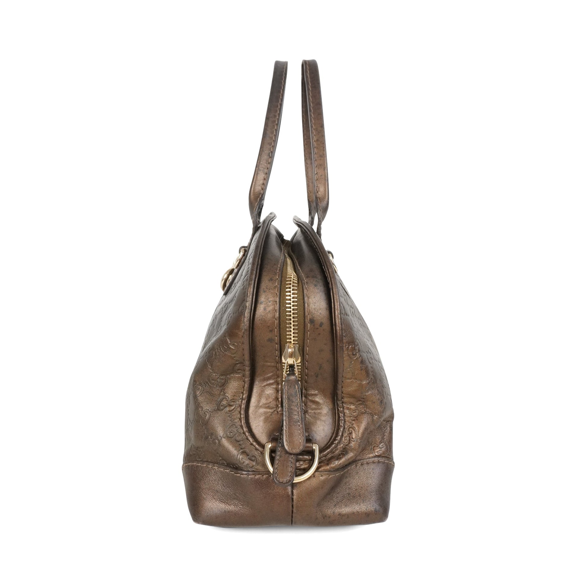 Gucci 'Metallic Guccissima' bowling bag in metallic bronze leather with dual rolled top handles, soft gold hardware, and a bamboo hear charm on the front. The bag has a top-zip opening revealing a beige canvas inner lining with inner zip and slip pockets.