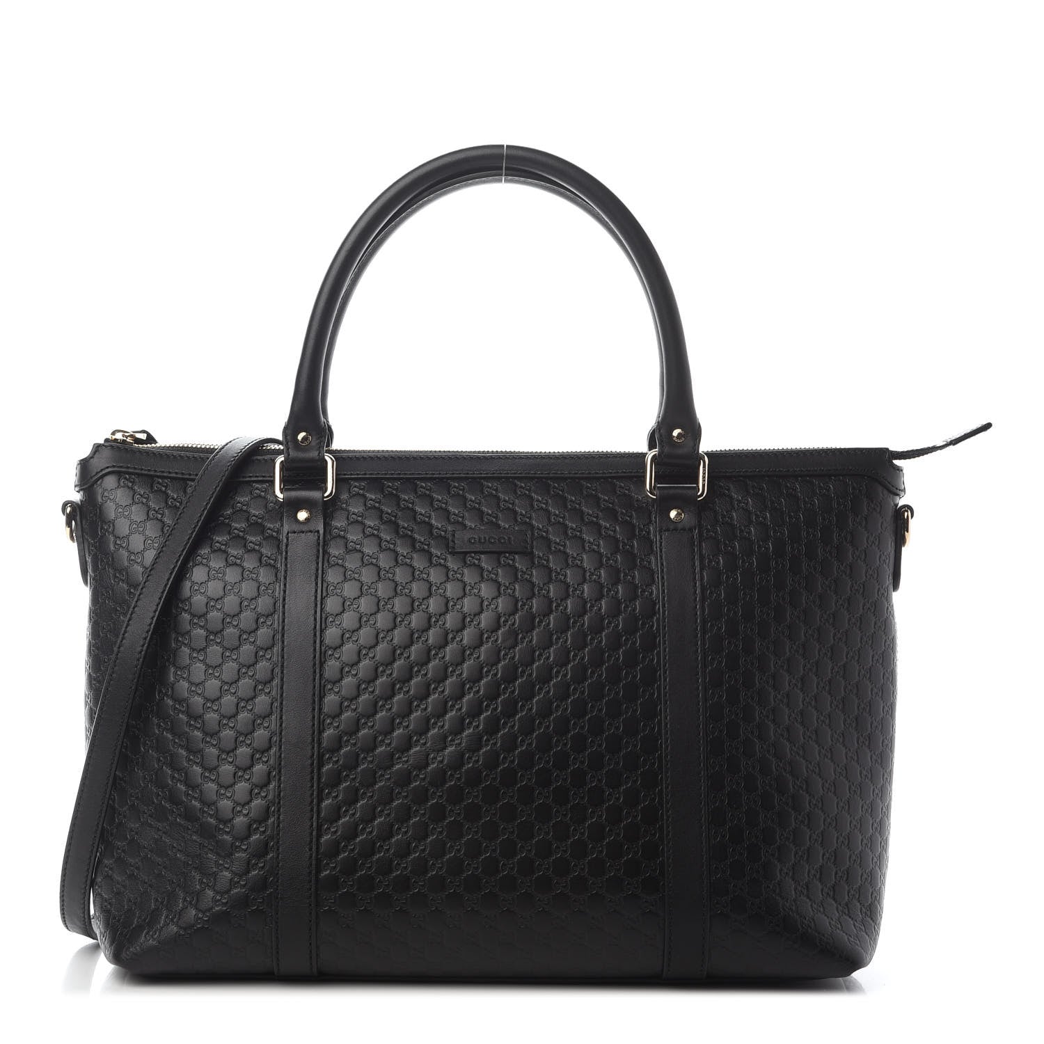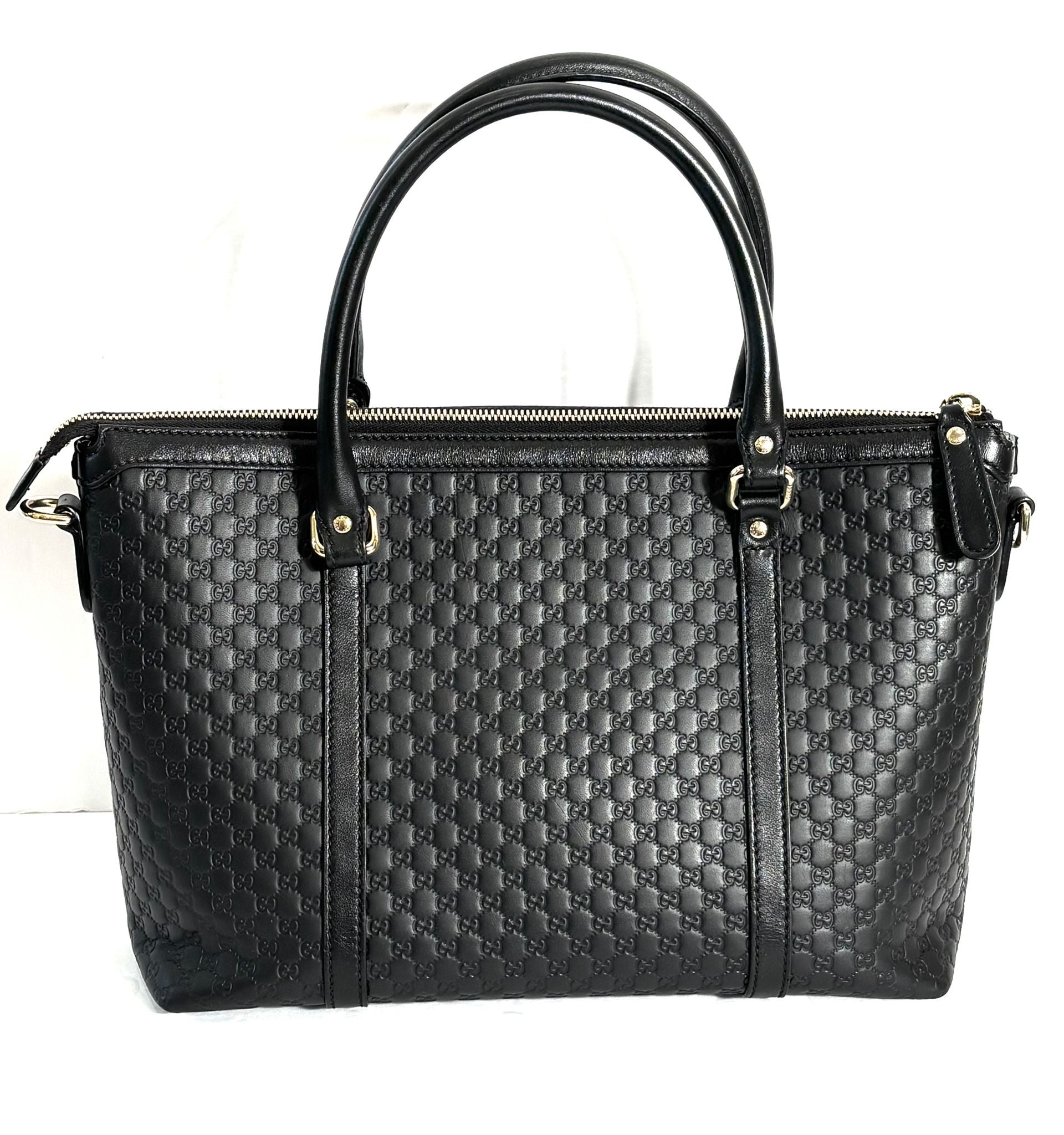 Crafted from Luxurious Black Microguccissima-Embossed leather, this sophisticated tote blends timeless style with versatile functionality. It features rolled leather top handles, an optional adjustable shoulder strap, and polished light gold-tone hardware. The dual top zippers open to a spacious beige canvas interior, complete with zipper and patch pockets for organized storage. Perfect for work, travel, or everyday elegance.