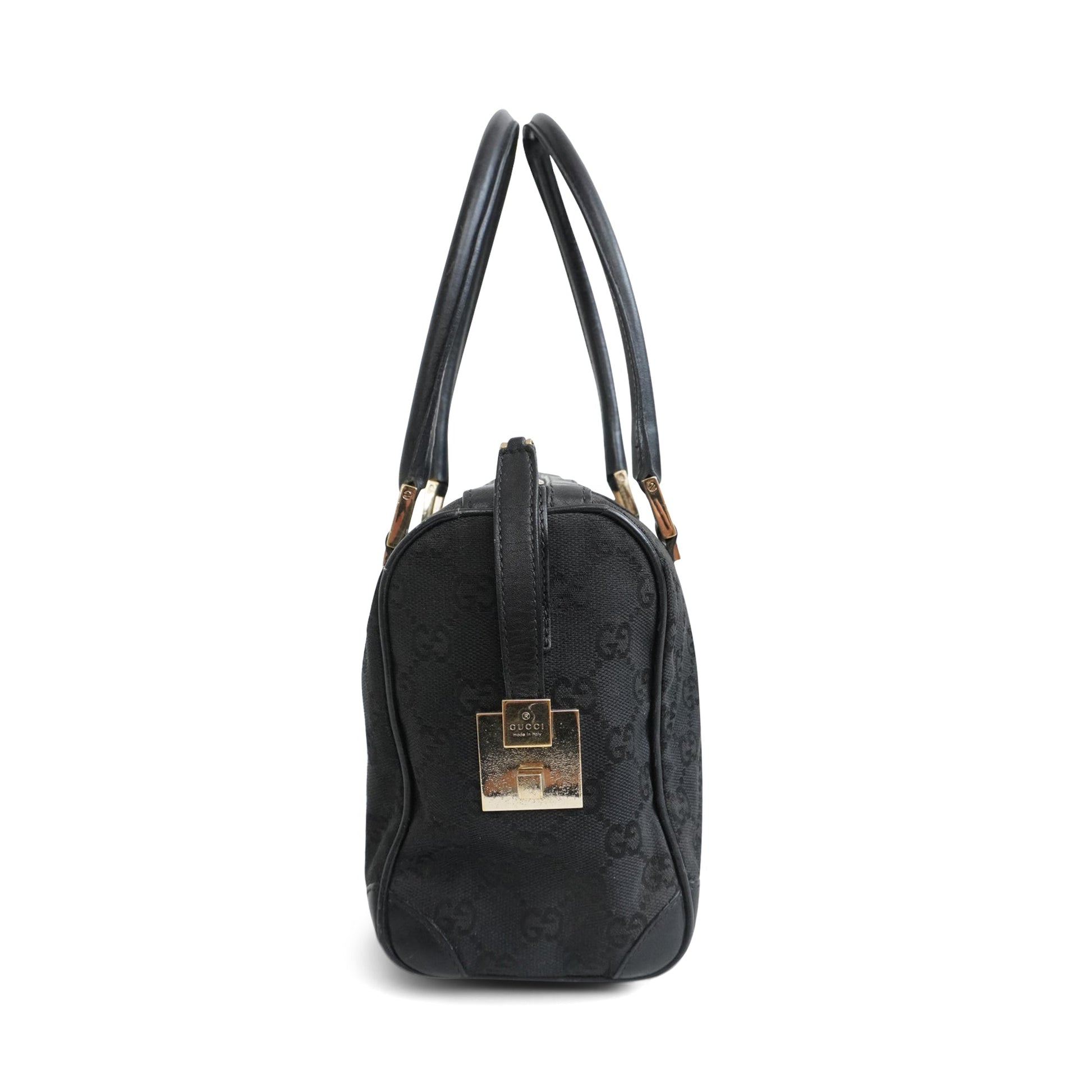 Gucci Mini Duffle Bag in black monogram canvas with leather trim, dual handles and a square clasp in gold hardware. Features a strap lock top zip closure, inner black nylon lining with an inner zipper.