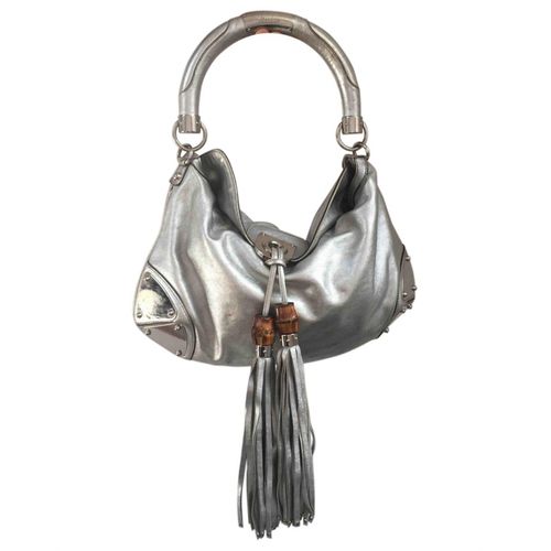 features a leather body, a bamboo handle, a detachable flat leather strap, an open-top, tassel detail, and an interior zip pocket.