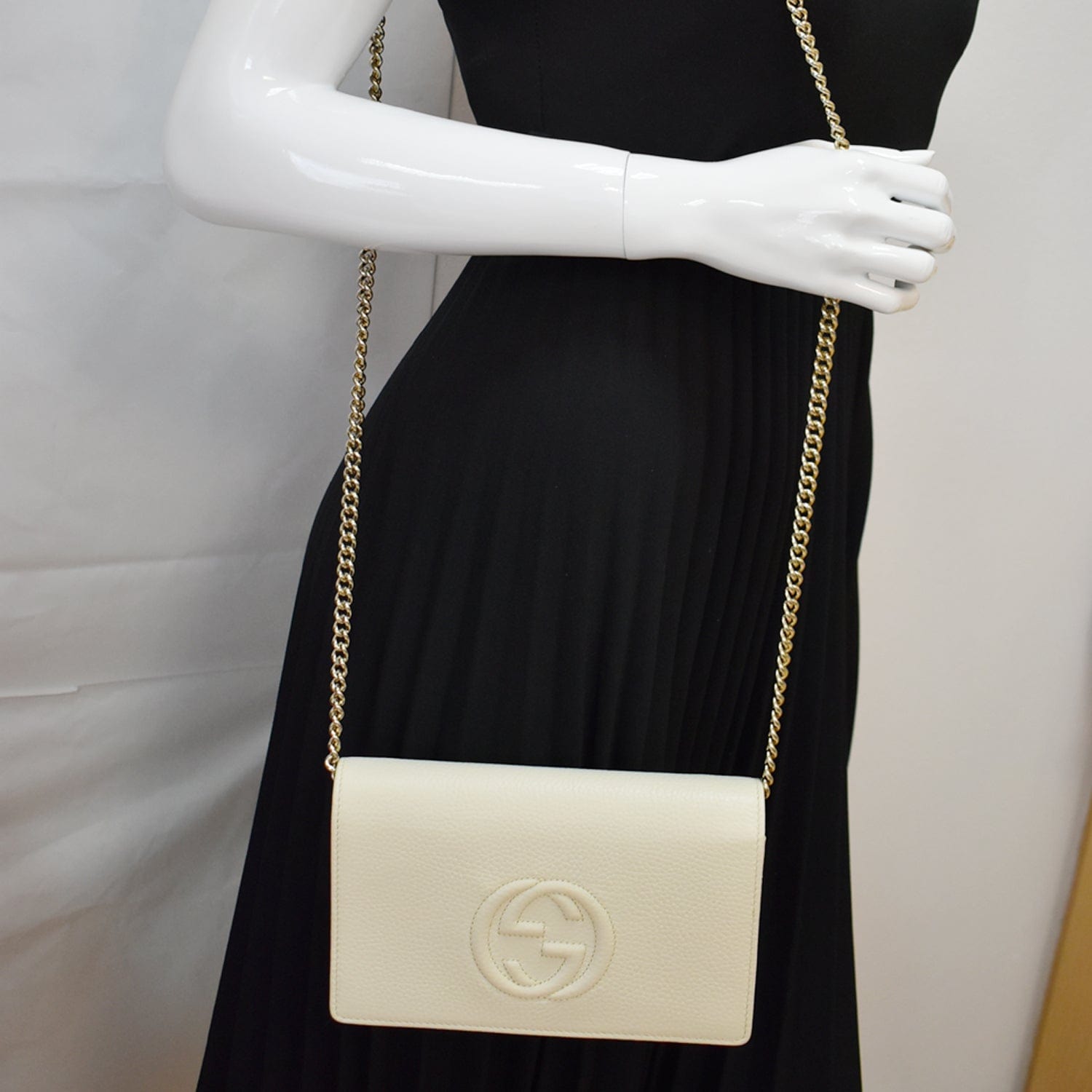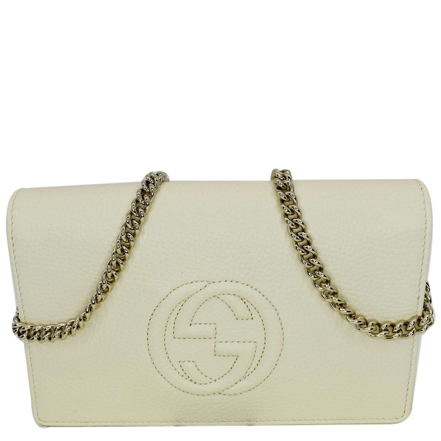 GUCCI Mini Soho Pebbled Leather Wallet On Chain Crossbody Bag Cream 598211