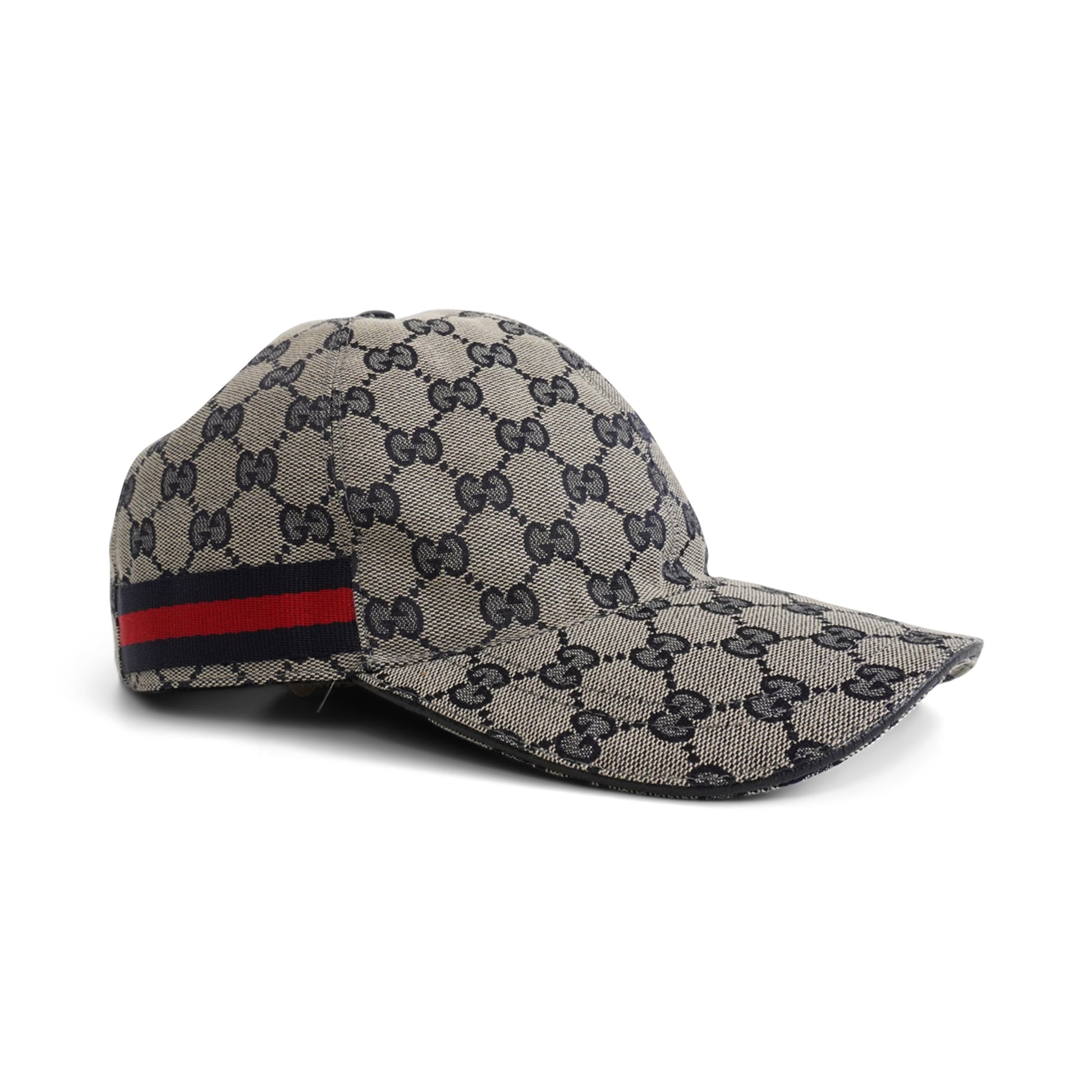 Gucci baseball cap in navy and grey guccissima monogram printed canvas with a red and navy racing stripe on the back and a black leather adjustable strap.