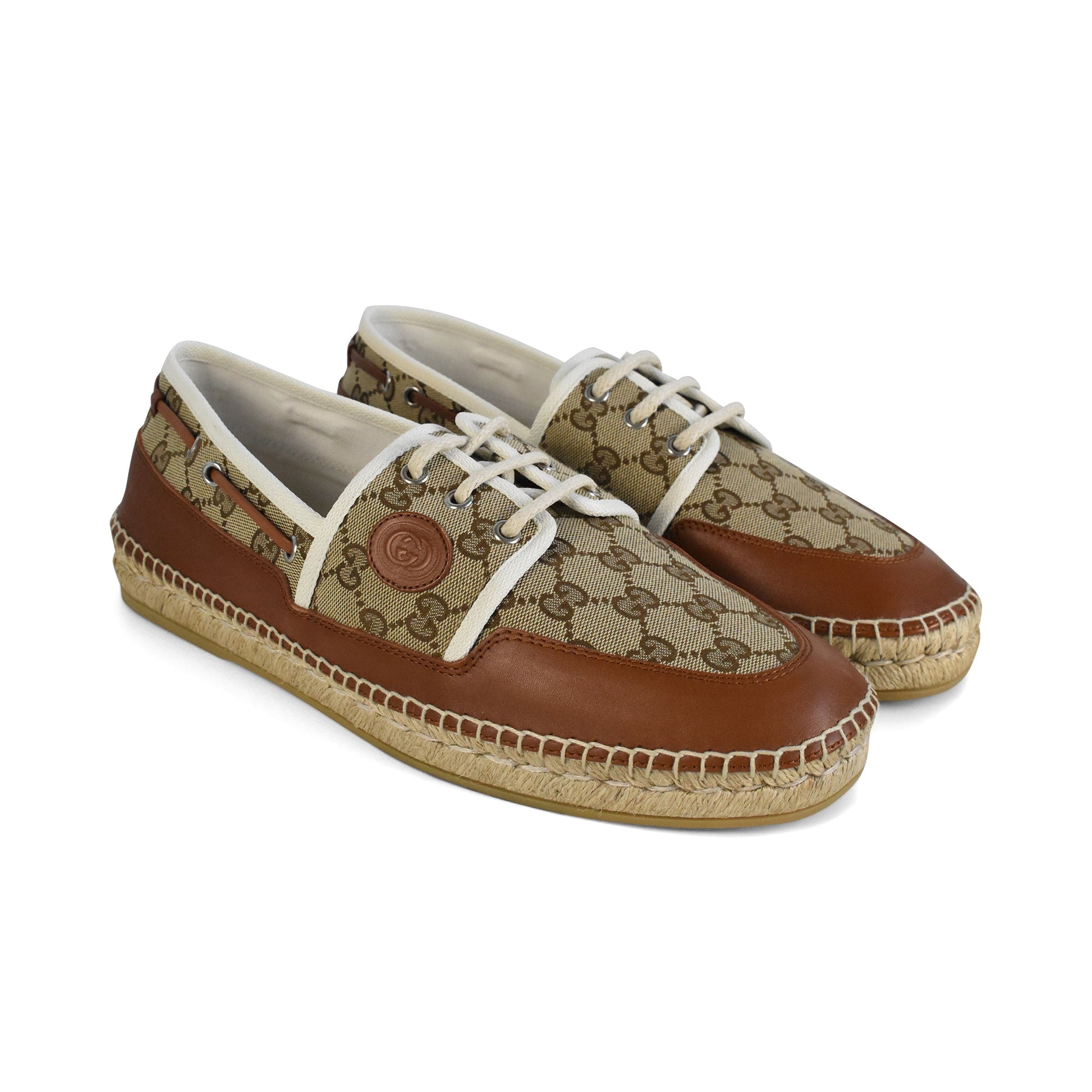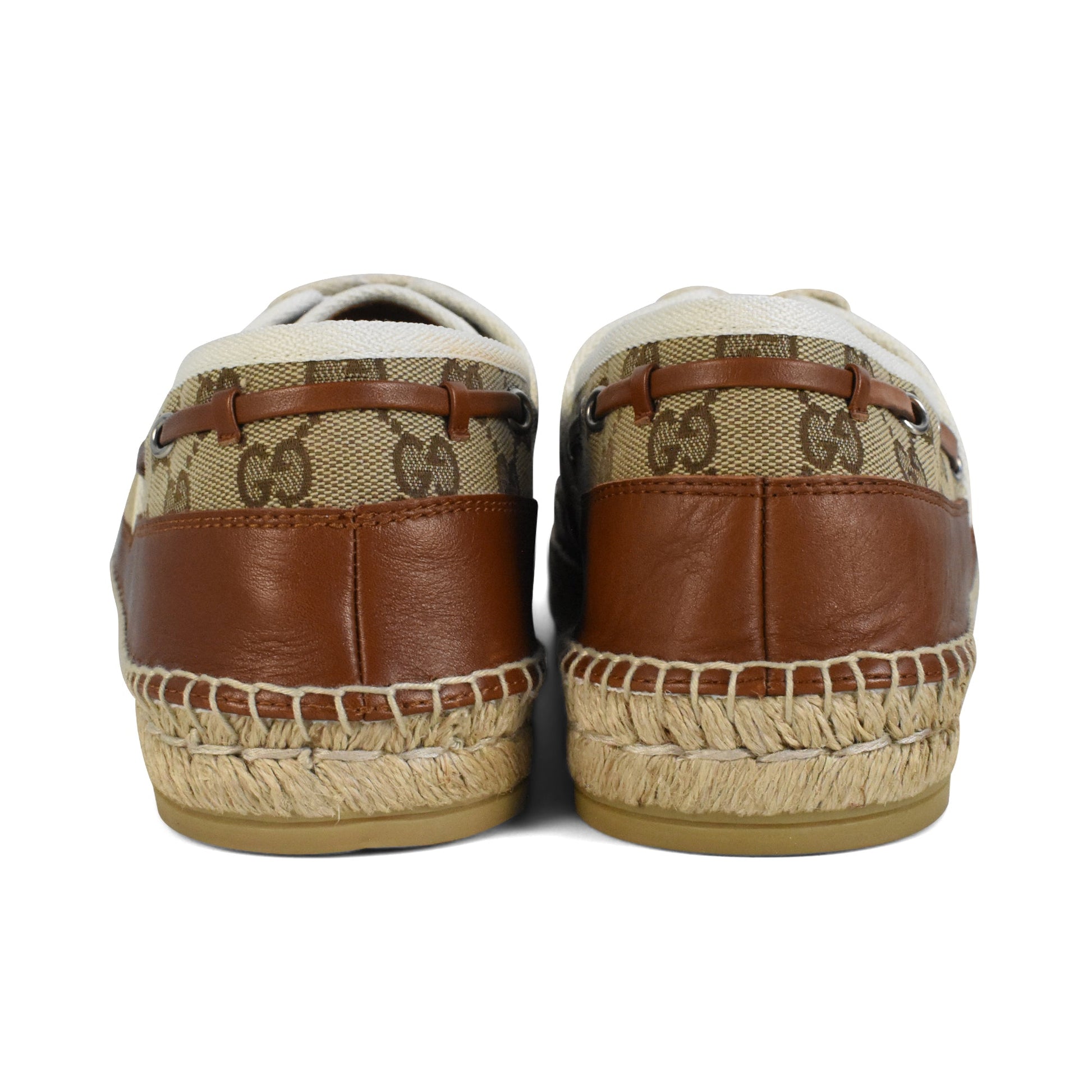 Gucci espadrilles in brown monogram canvas with leather panelling, white canvas trim, and a woven sole.