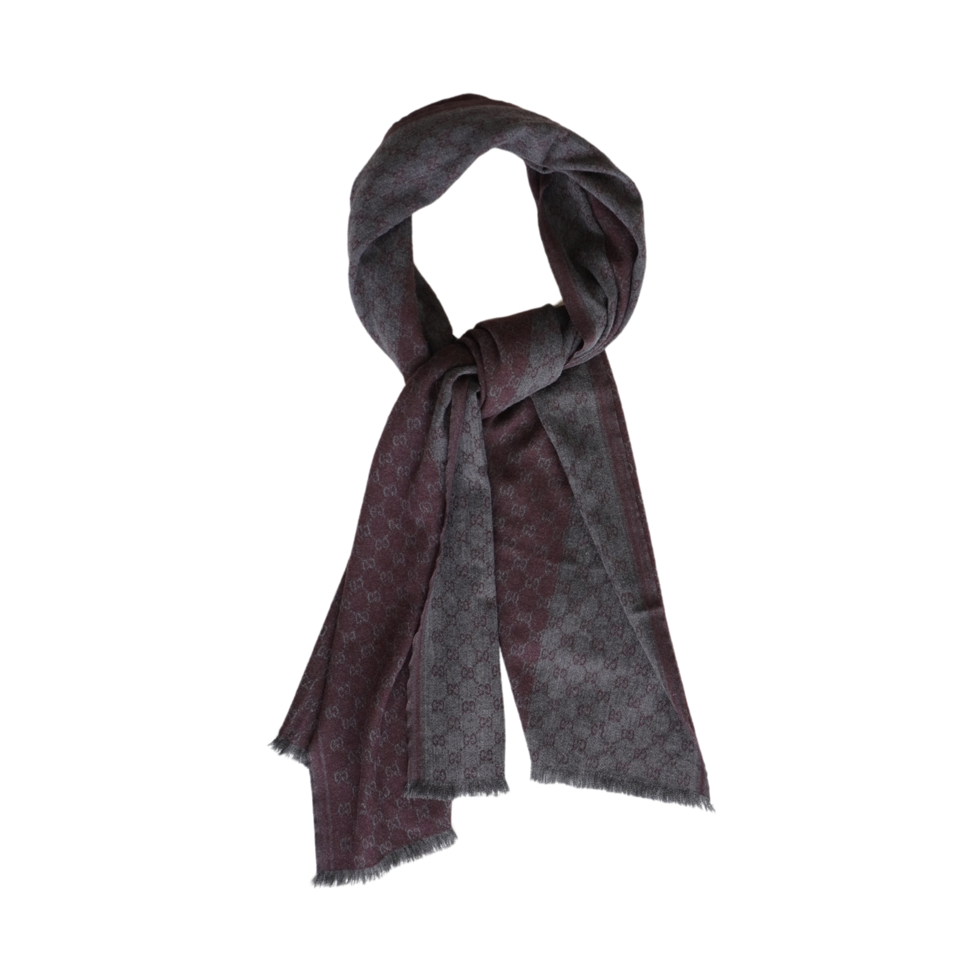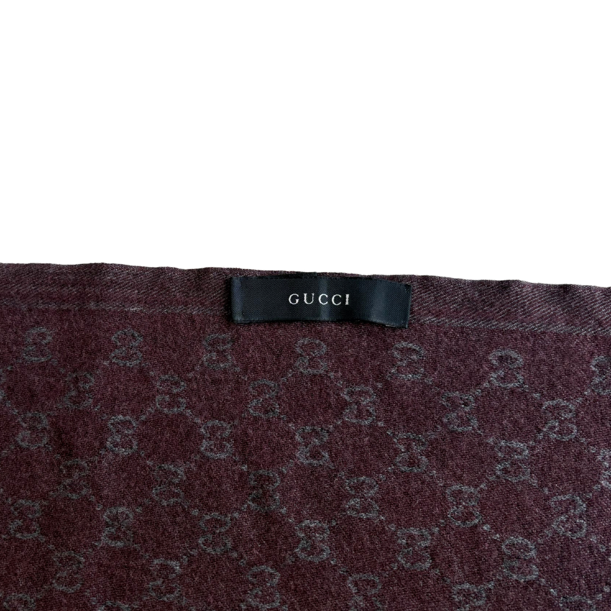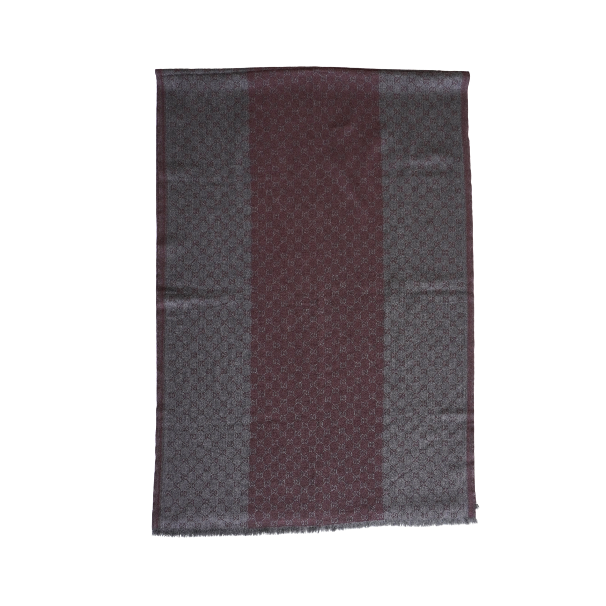 Gucci shawl scarf in grey and burgundy wool-cashmere blend with an all-over monogram print and a fringe trim.
