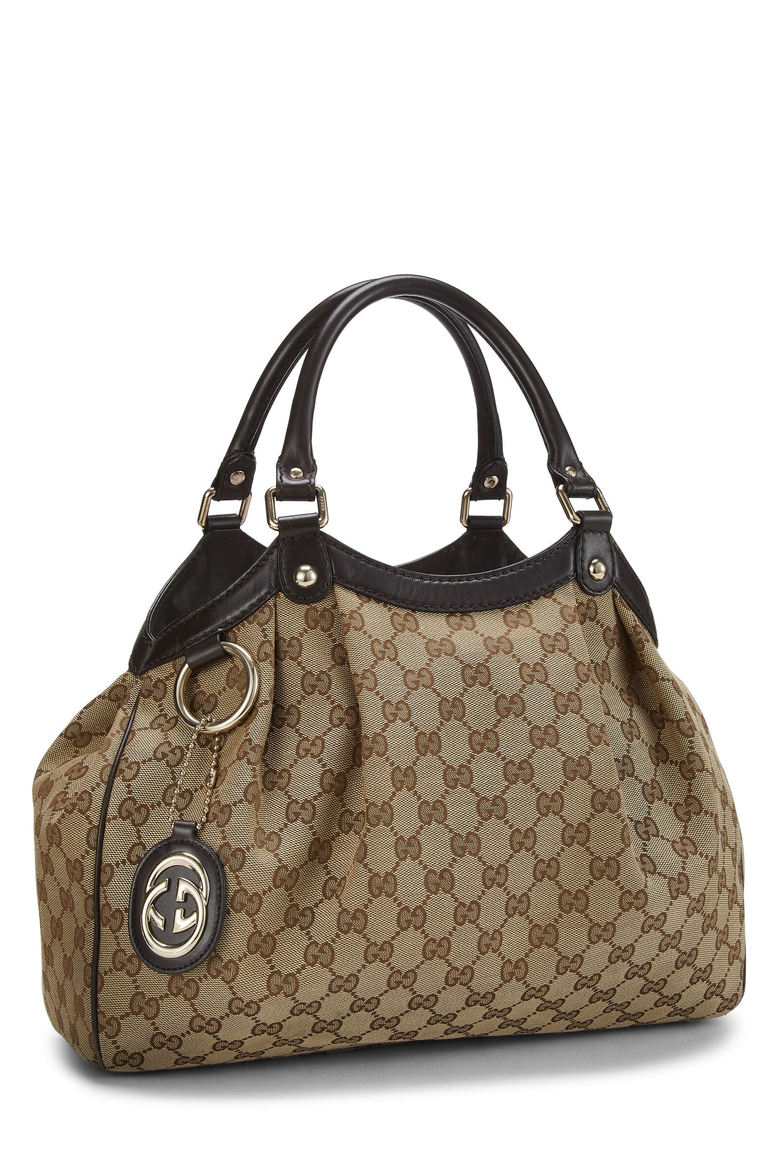 Spacious Gucci Sukey tote crafted in Original GG canvas with dark brown leather trim, pleated details, and finished with pale gold-tone hardware.