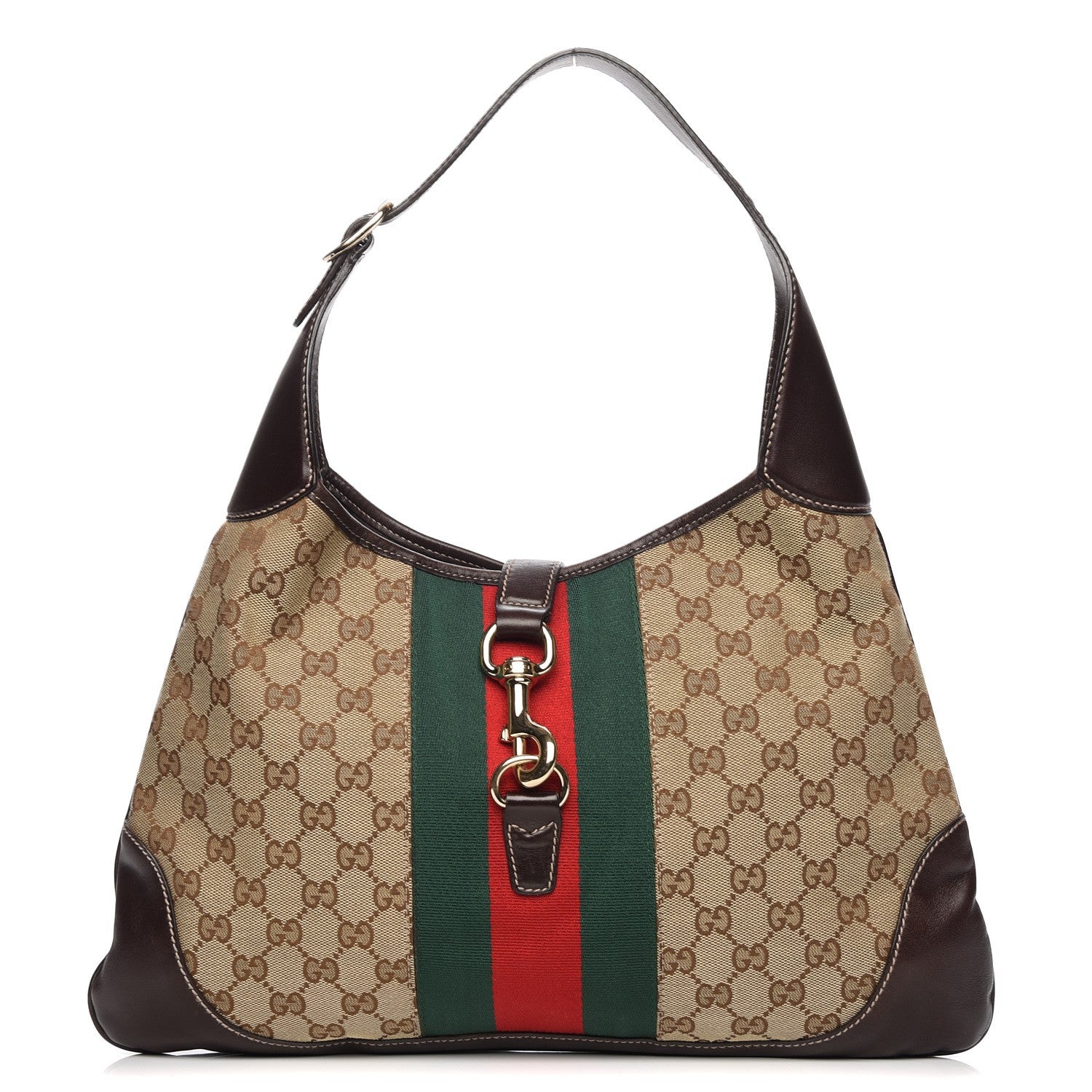 A Timeless piece with iconic heritage, the Gucci Jackie O Bouvier Hobo Bag blends classic design with everyday functionality. Crafted from signature GG monogram canvas, this sophisticated shoulder bag features rich brown leather trim, an adjustable wrap-around leather strap with brass buckle detail, and Gucci's instantly recognizable red and green Web stripe down the center.