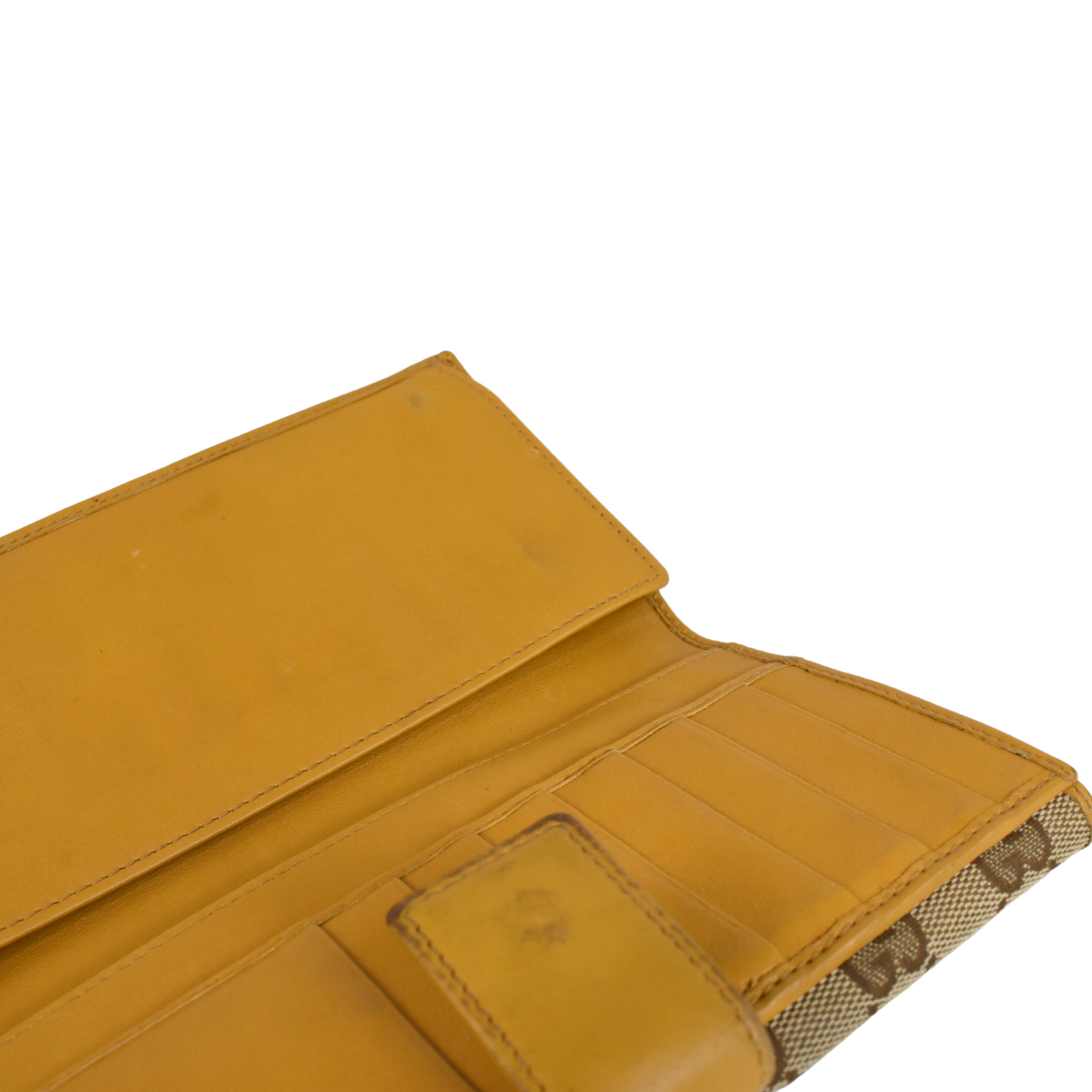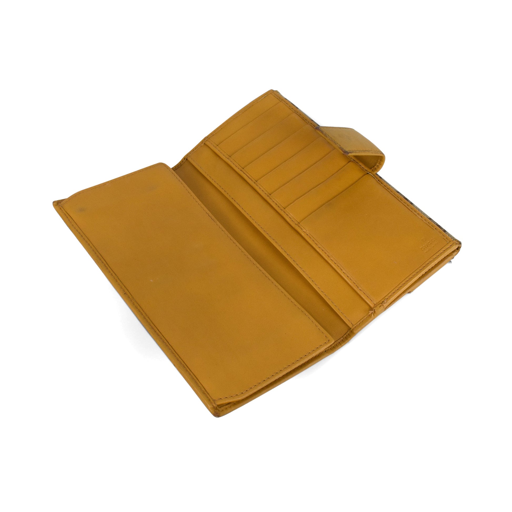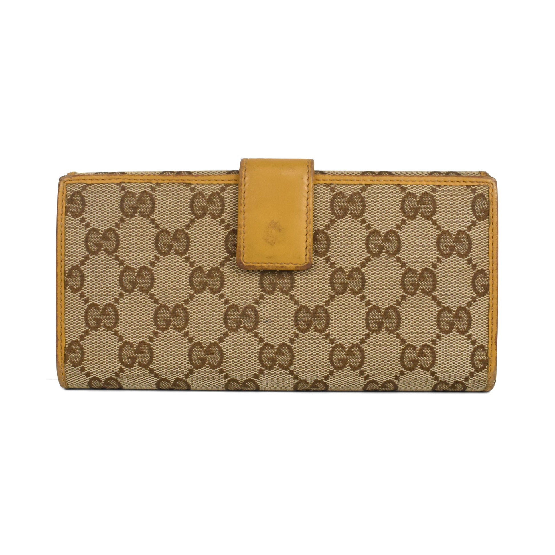 Gucci long wallet in beige 'GG' monogram printed canvas with a tan leather trim, a front flap pocket with gold logo plaque hardware, and a back leather lined compartment with several card pockets and a snap closure.
