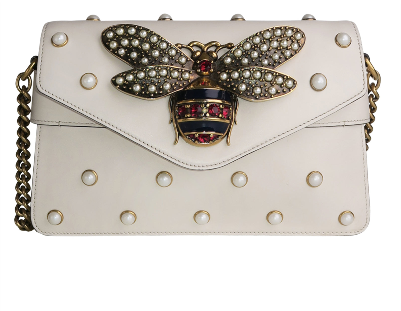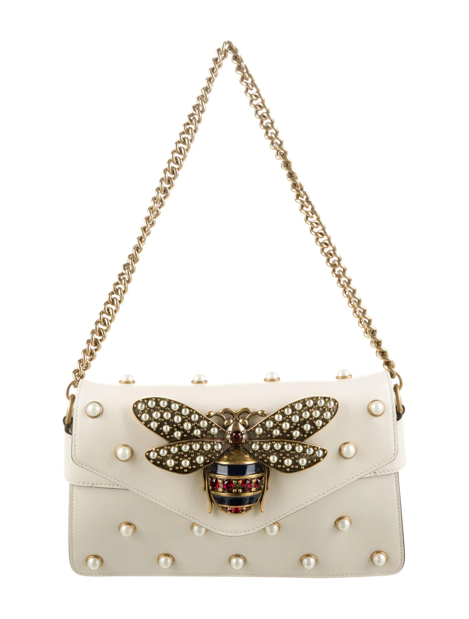 This Stunning Bag features smooth leather with a large Gold-tone bee adorned with faux pearls and crystals and chain strap.