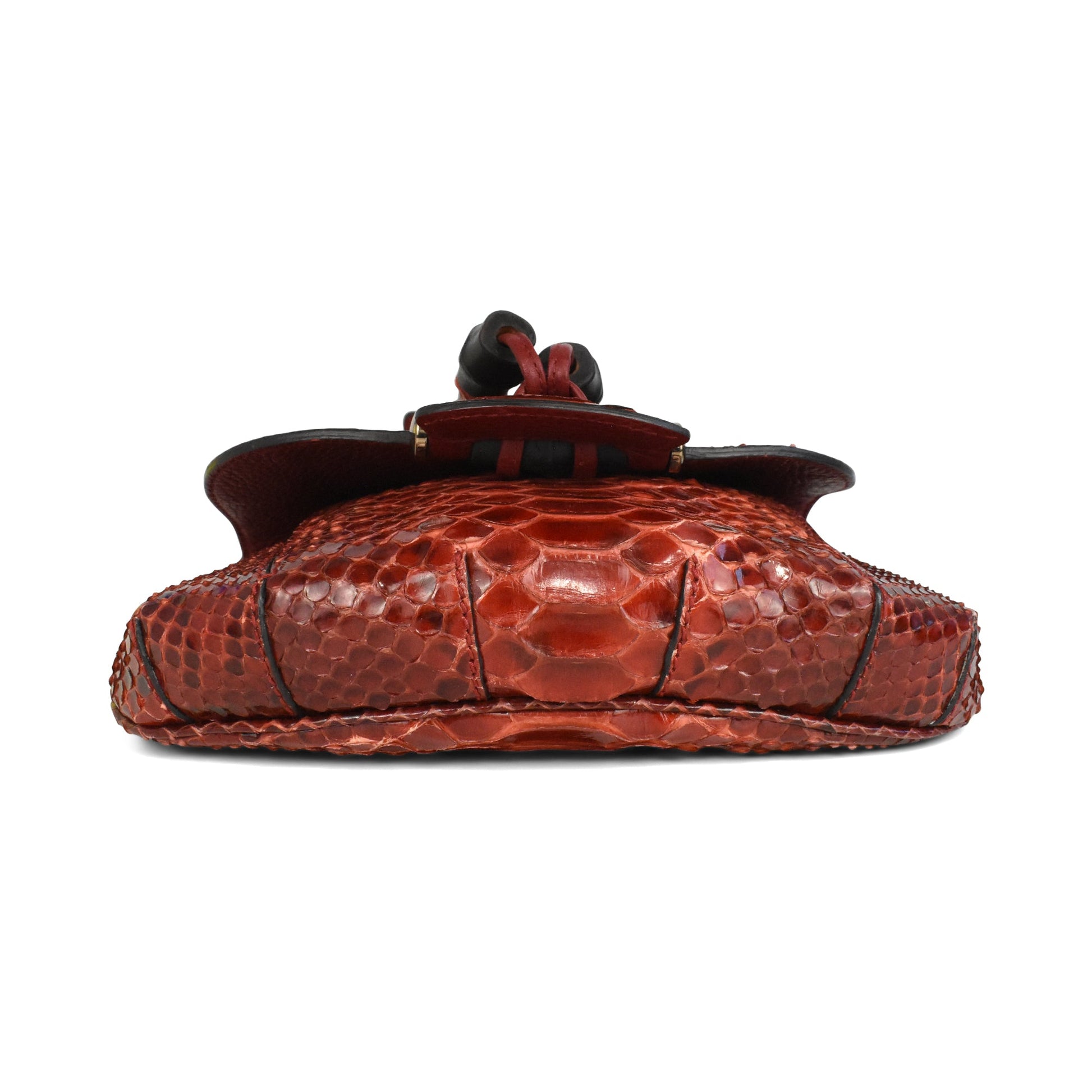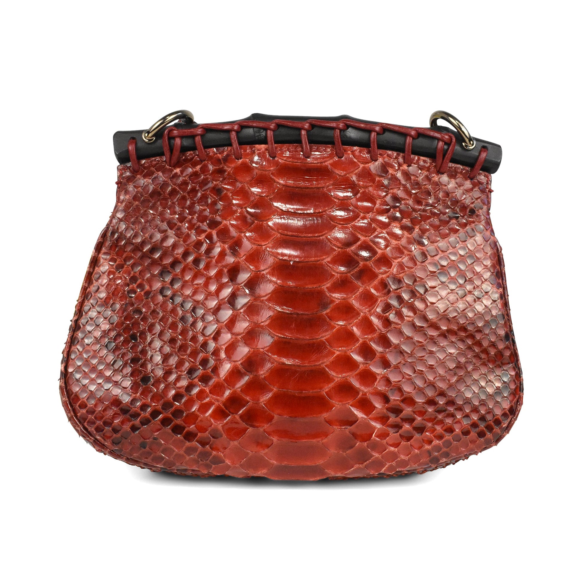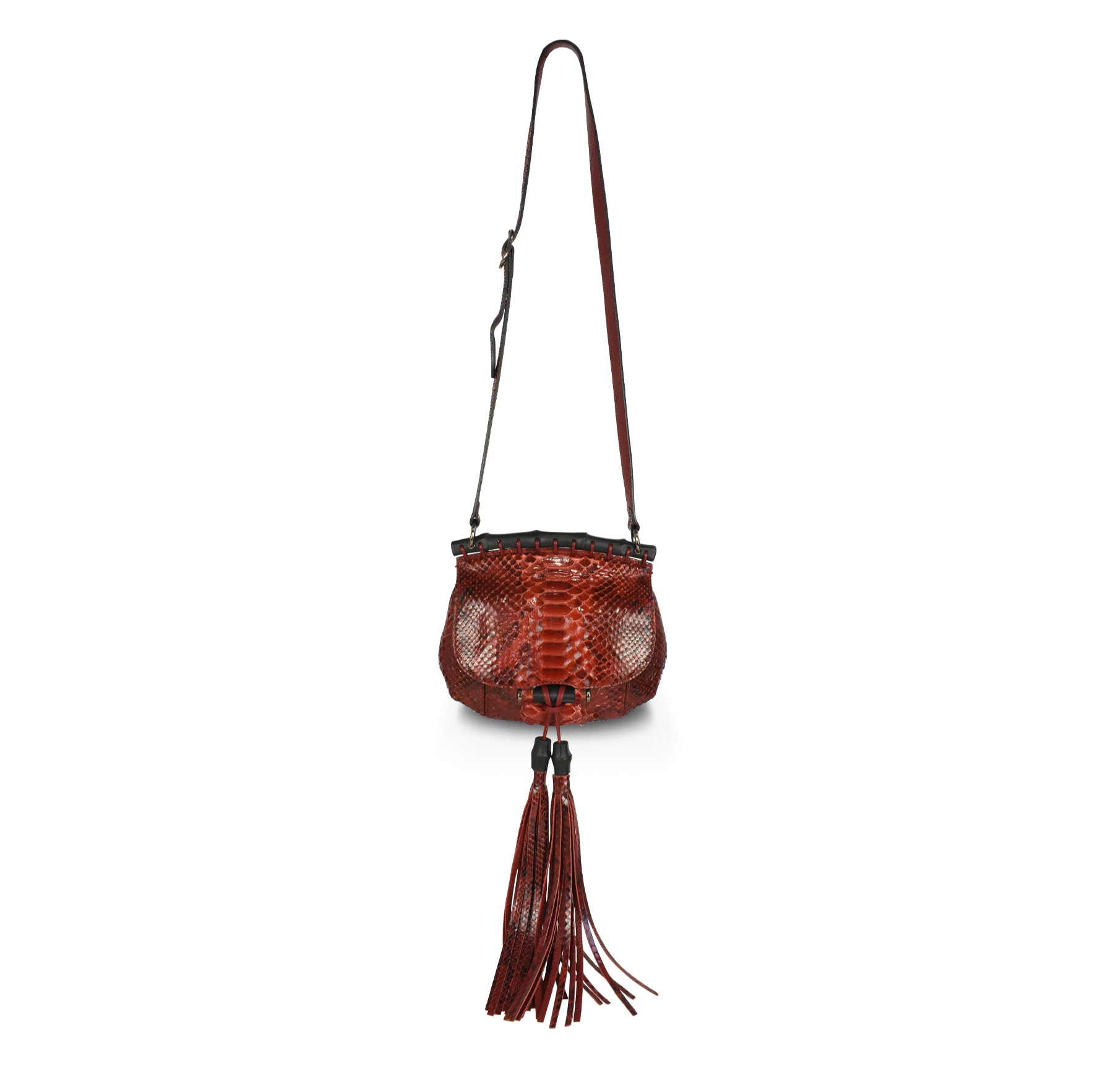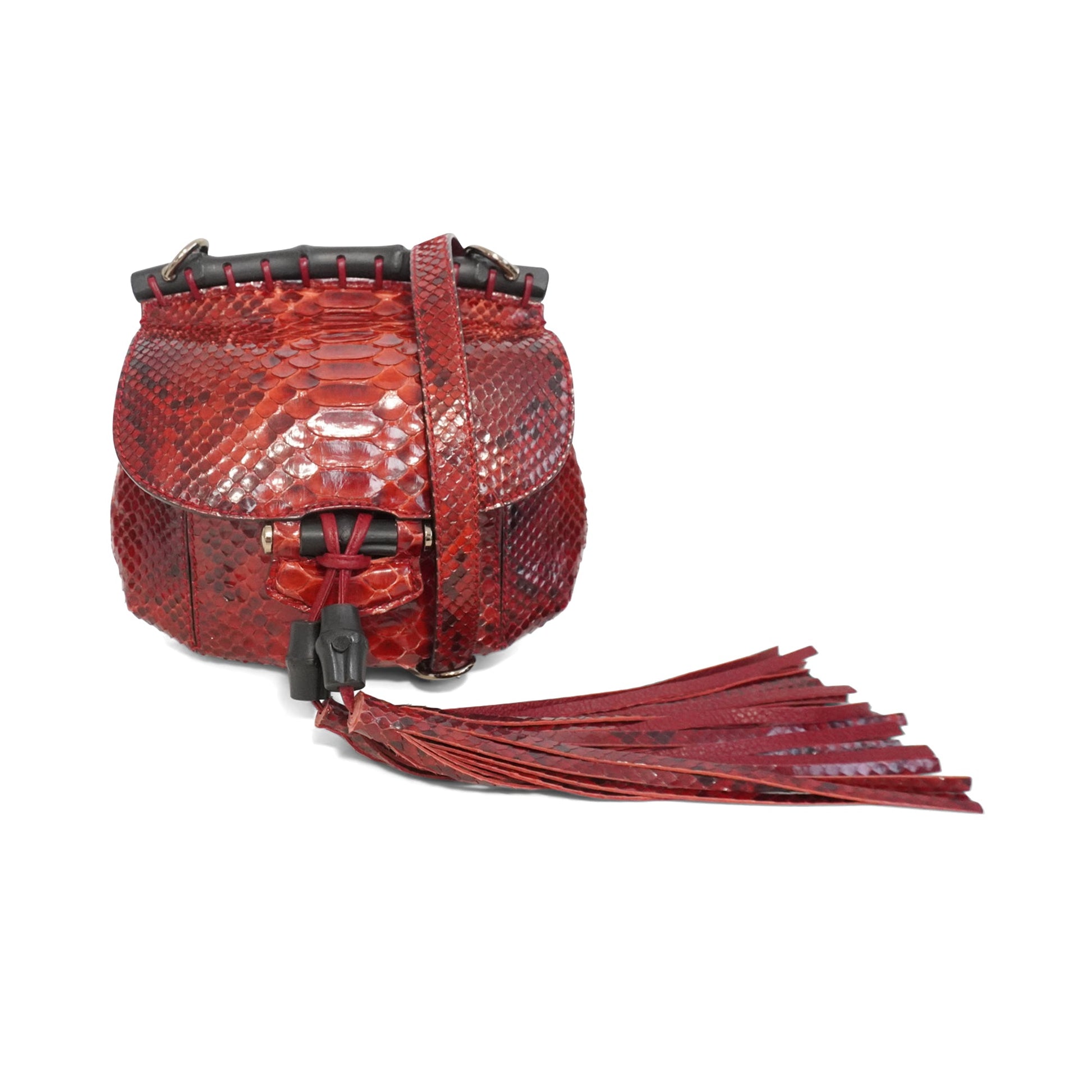 Gucci 'Nouveau Fringe' crossbody flap bag in dark red snakeskin with dark brown bamboo accents and elongated tassels. The interior is lined with beige and red leather and features a zip pocket and small slip pocket with snap button closure.