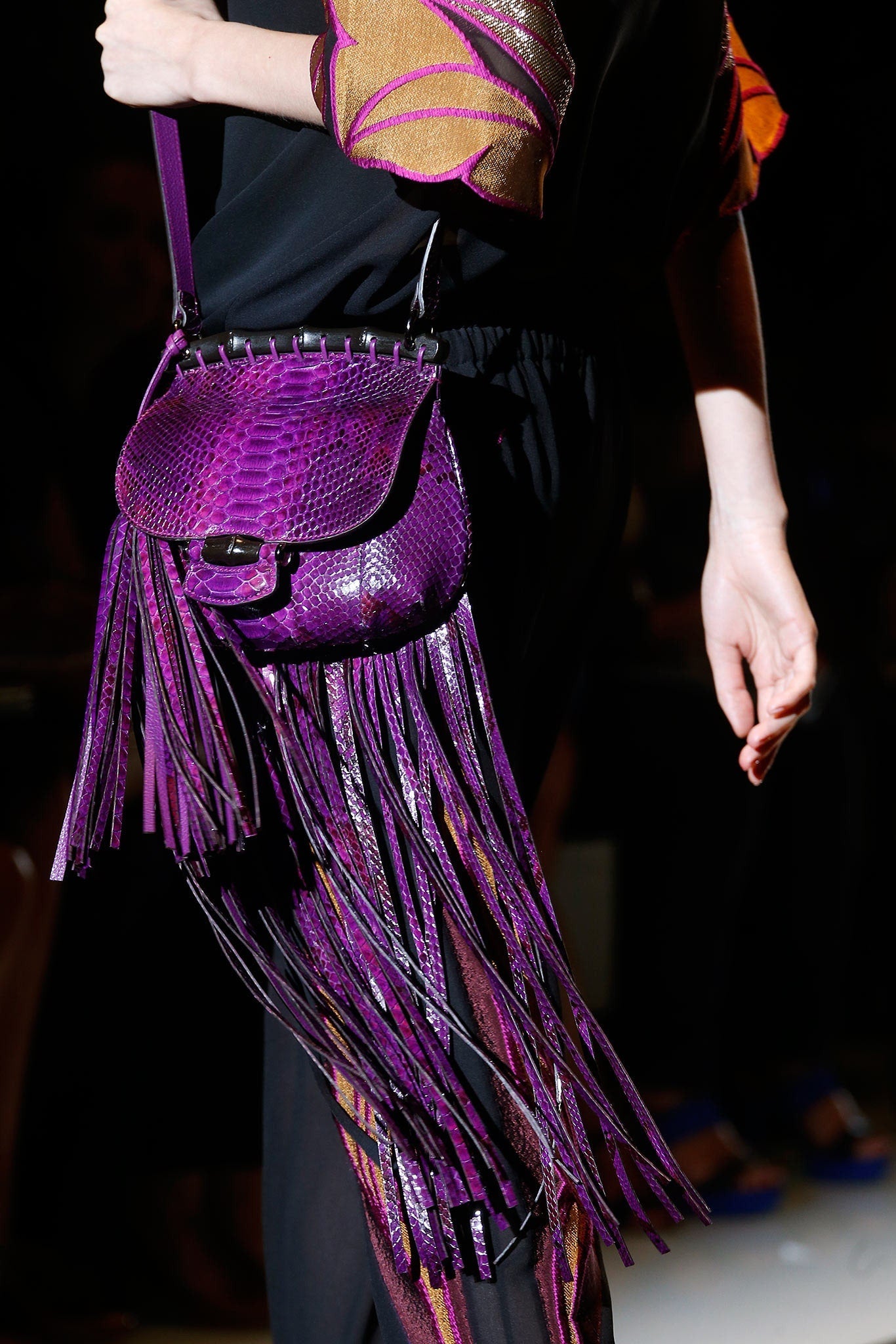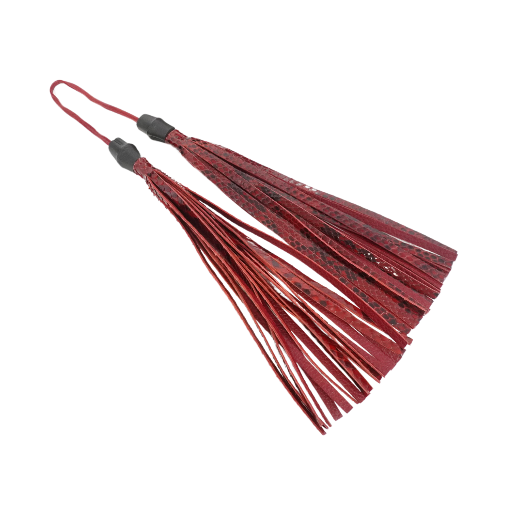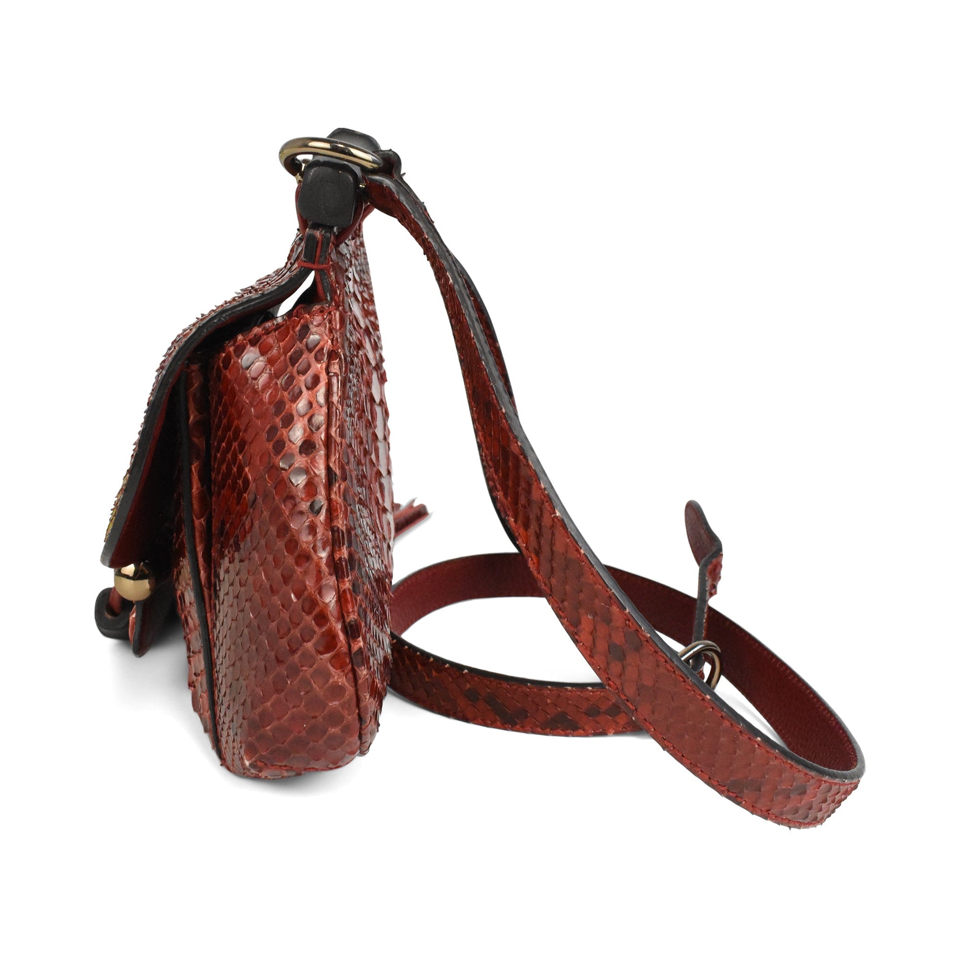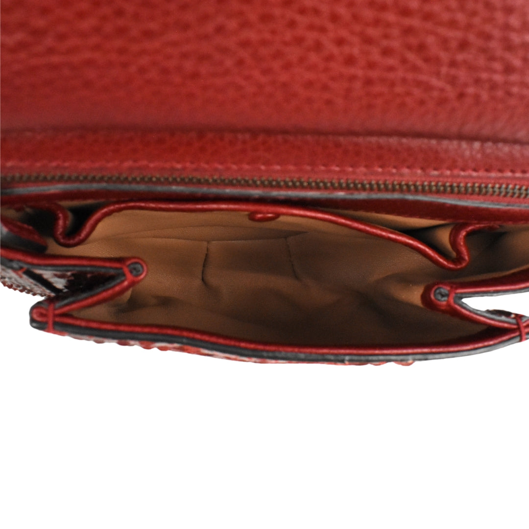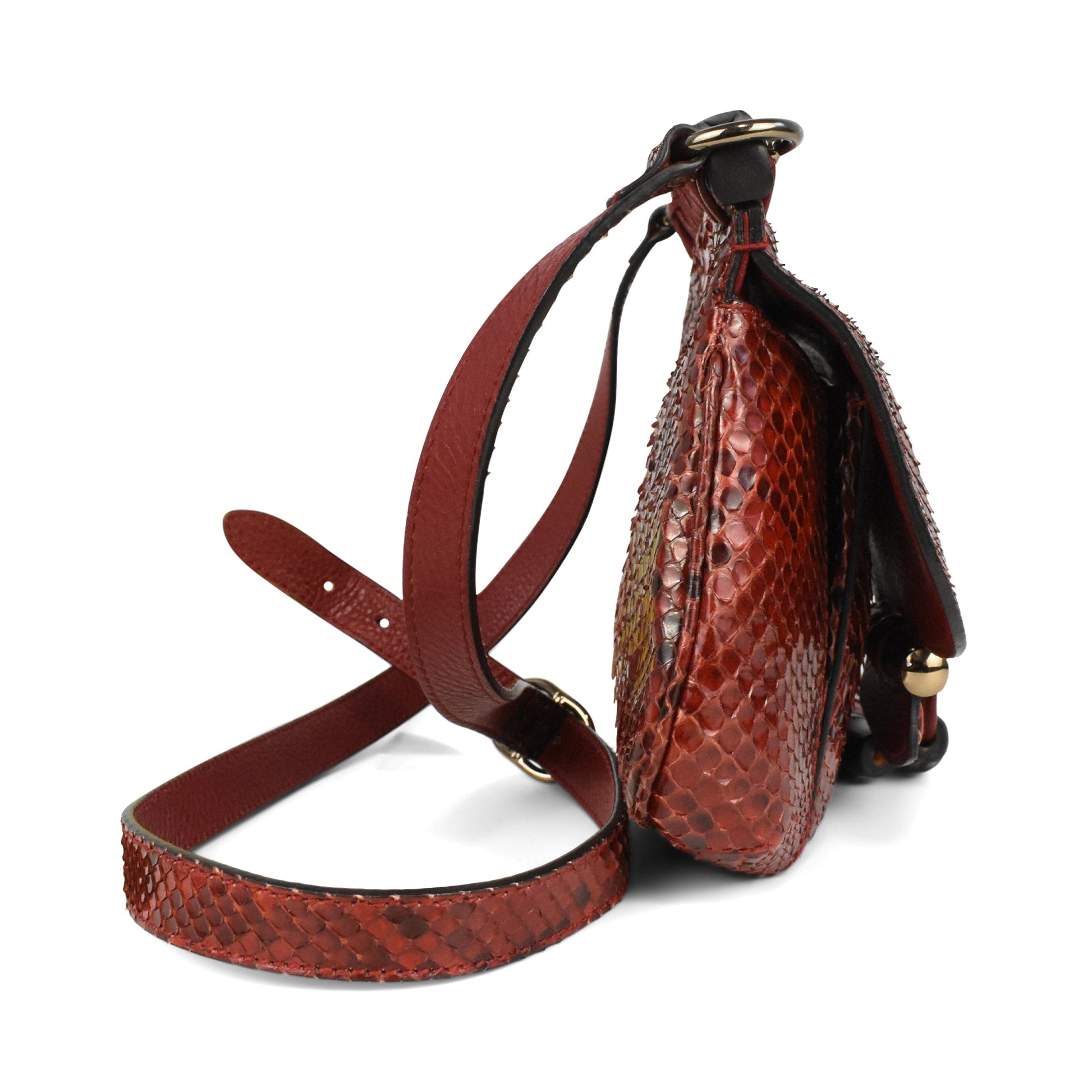 Gucci 'Nouveau Fringe' crossbody flap bag in dark red snakeskin with dark brown bamboo accents and elongated tassels. The interior is lined with beige and red leather and features a zip pocket and small slip pocket with snap button closure.