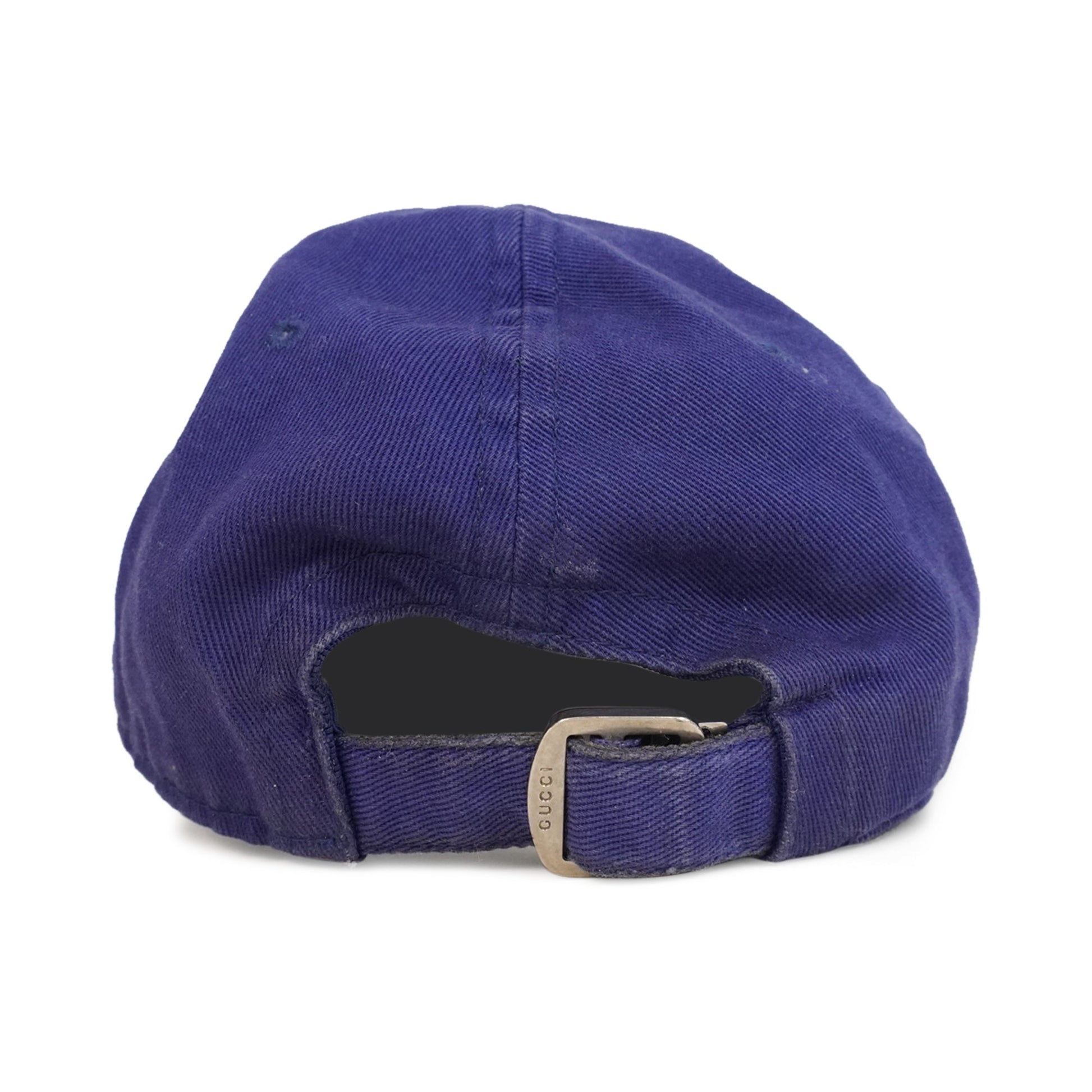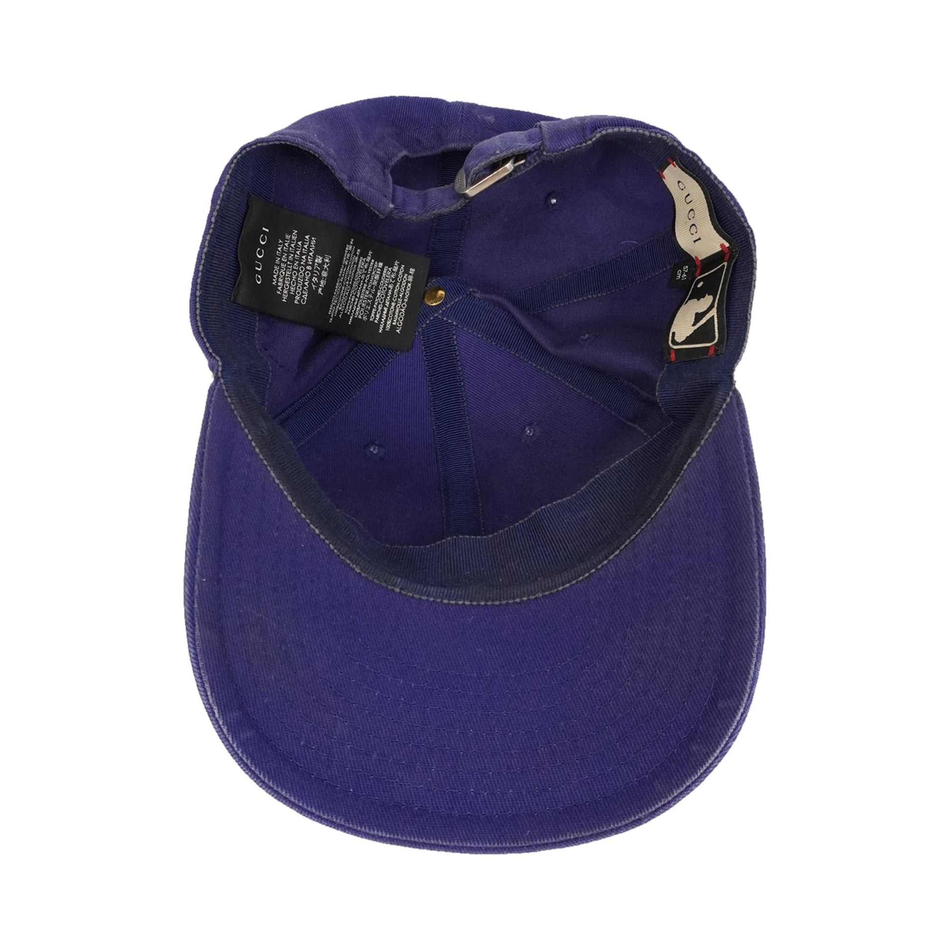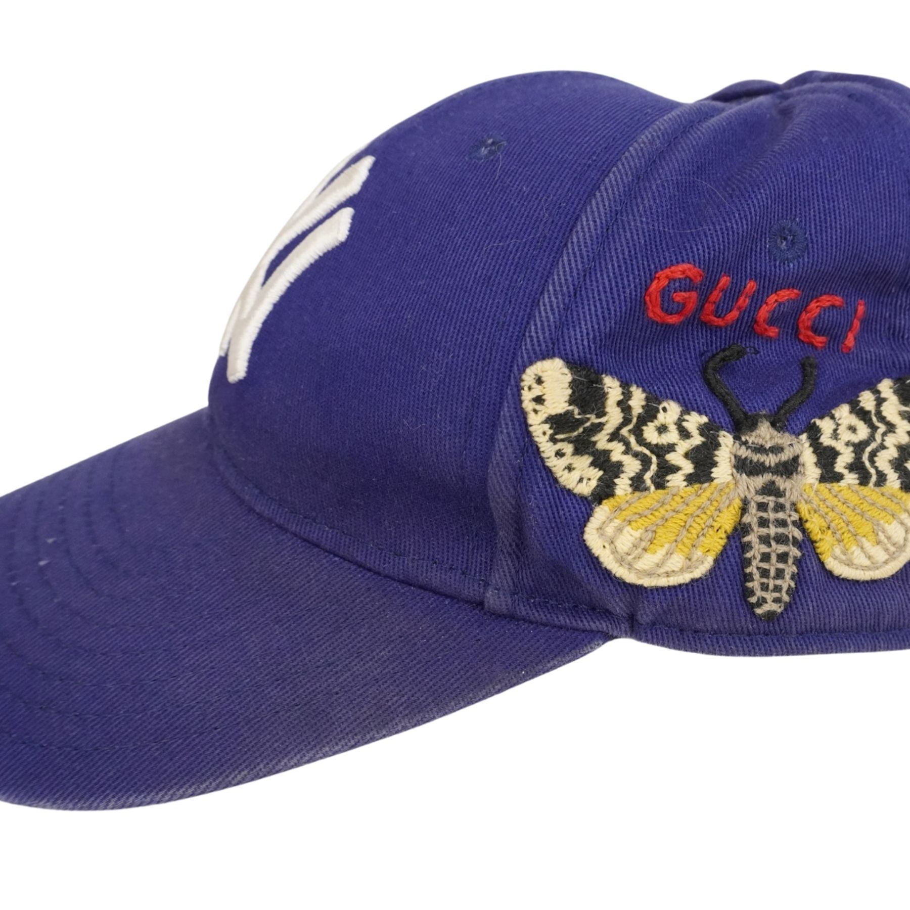 Gucci baseball cap in blue cotton with white embroidered 'NY' Yankees logo on the front. Features red embroidered 'Gucci' logo on the side with cream and black moth, and an adjustable strap on the back with silver hardware buckle.