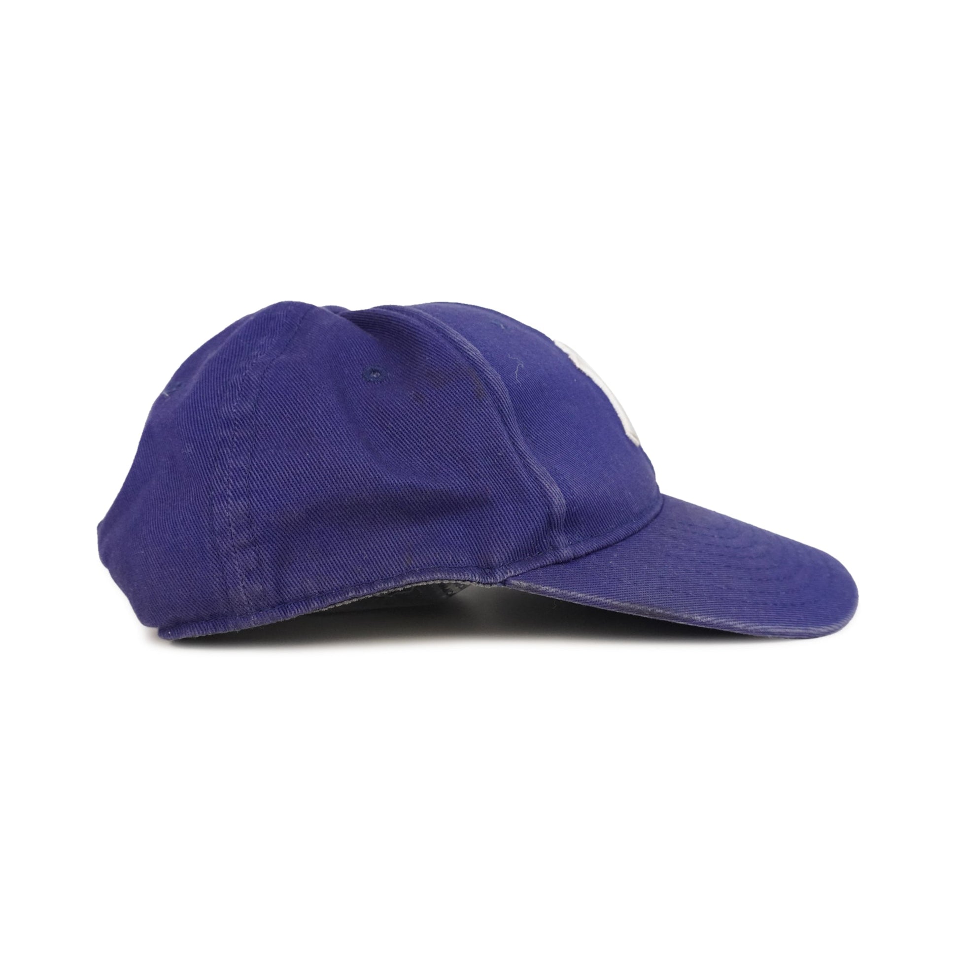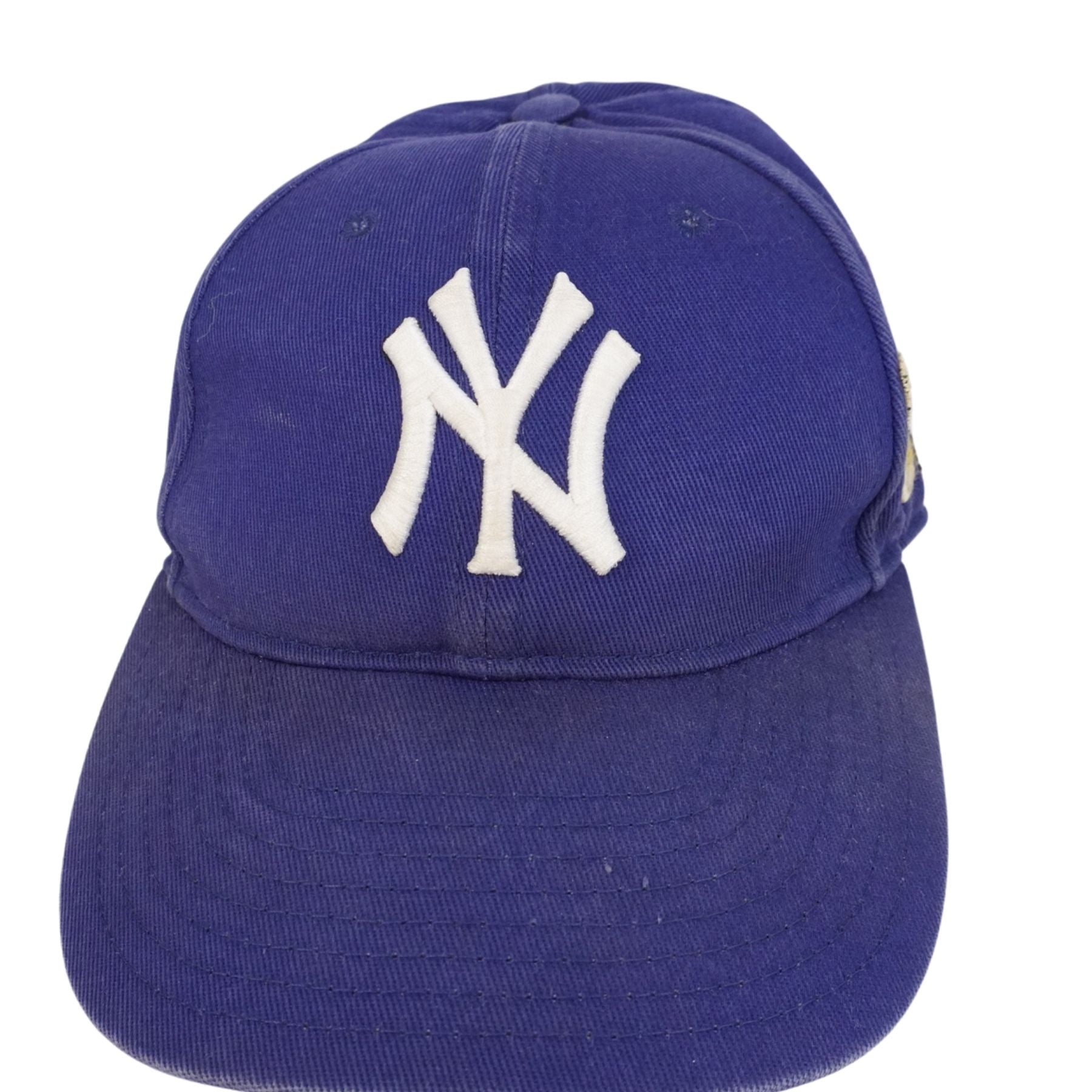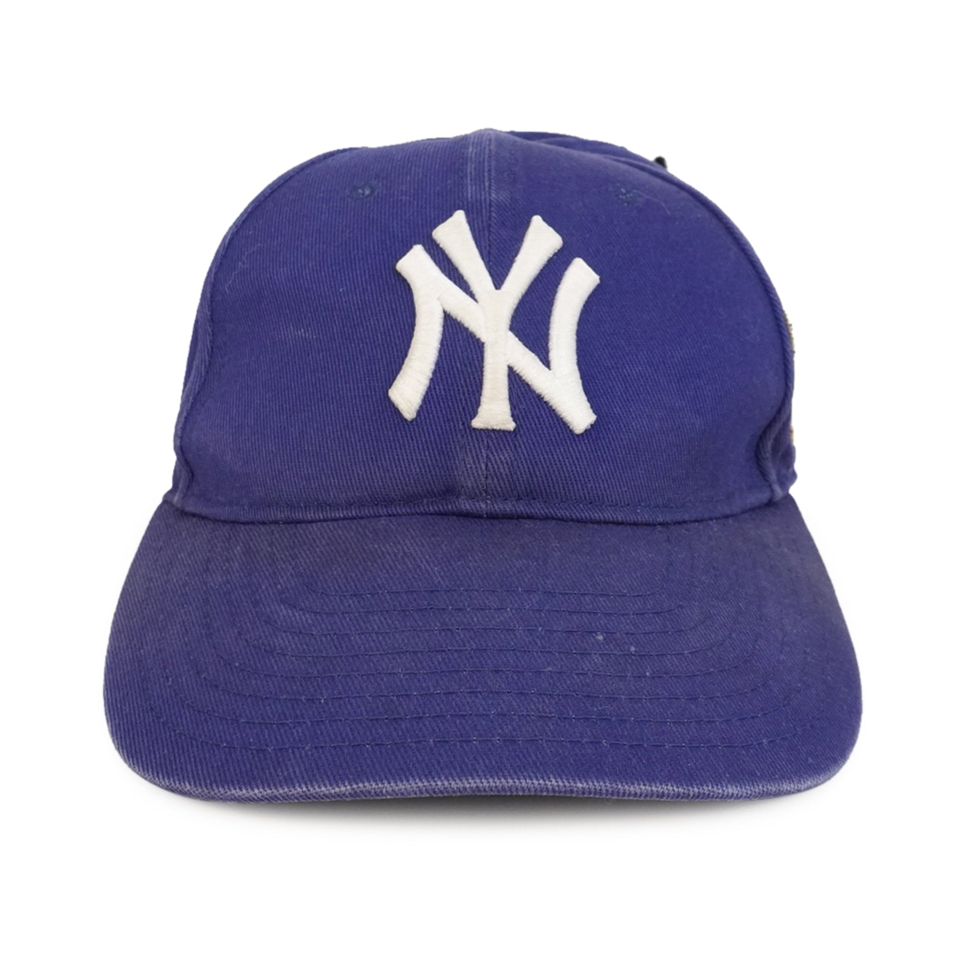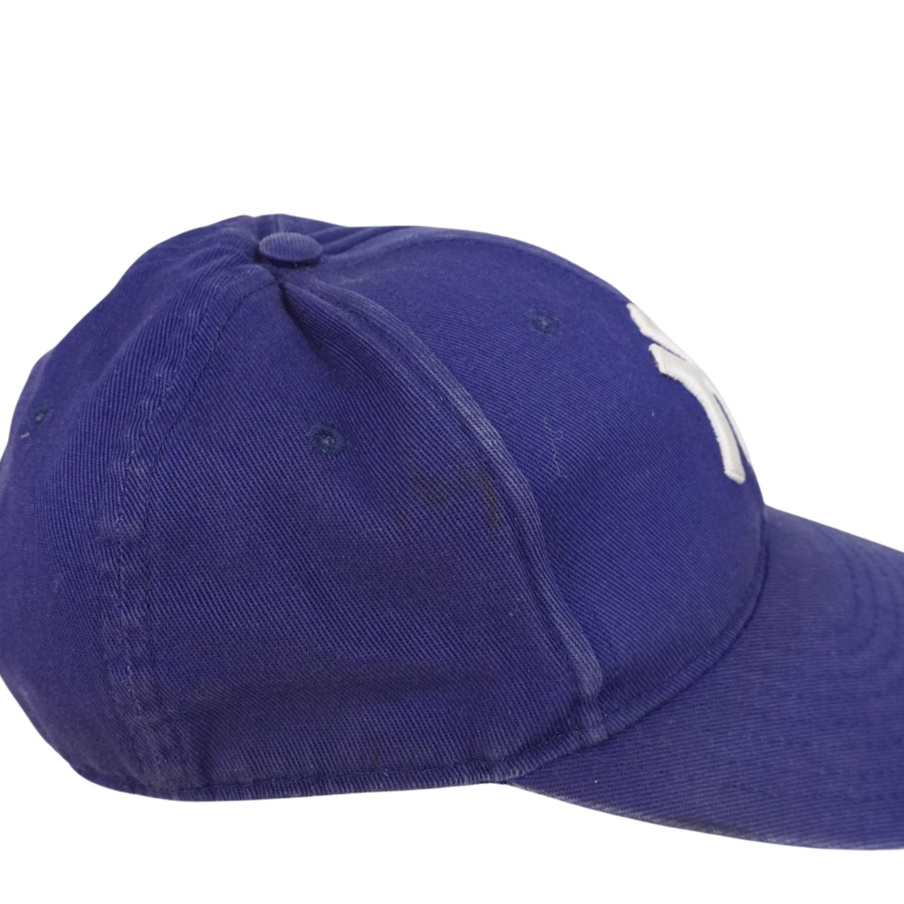 Gucci baseball cap in blue cotton with white embroidered 'NY' Yankees logo on the front. Features red embroidered 'Gucci' logo on the side with cream and black moth, and an adjustable strap on the back with silver hardware buckle.