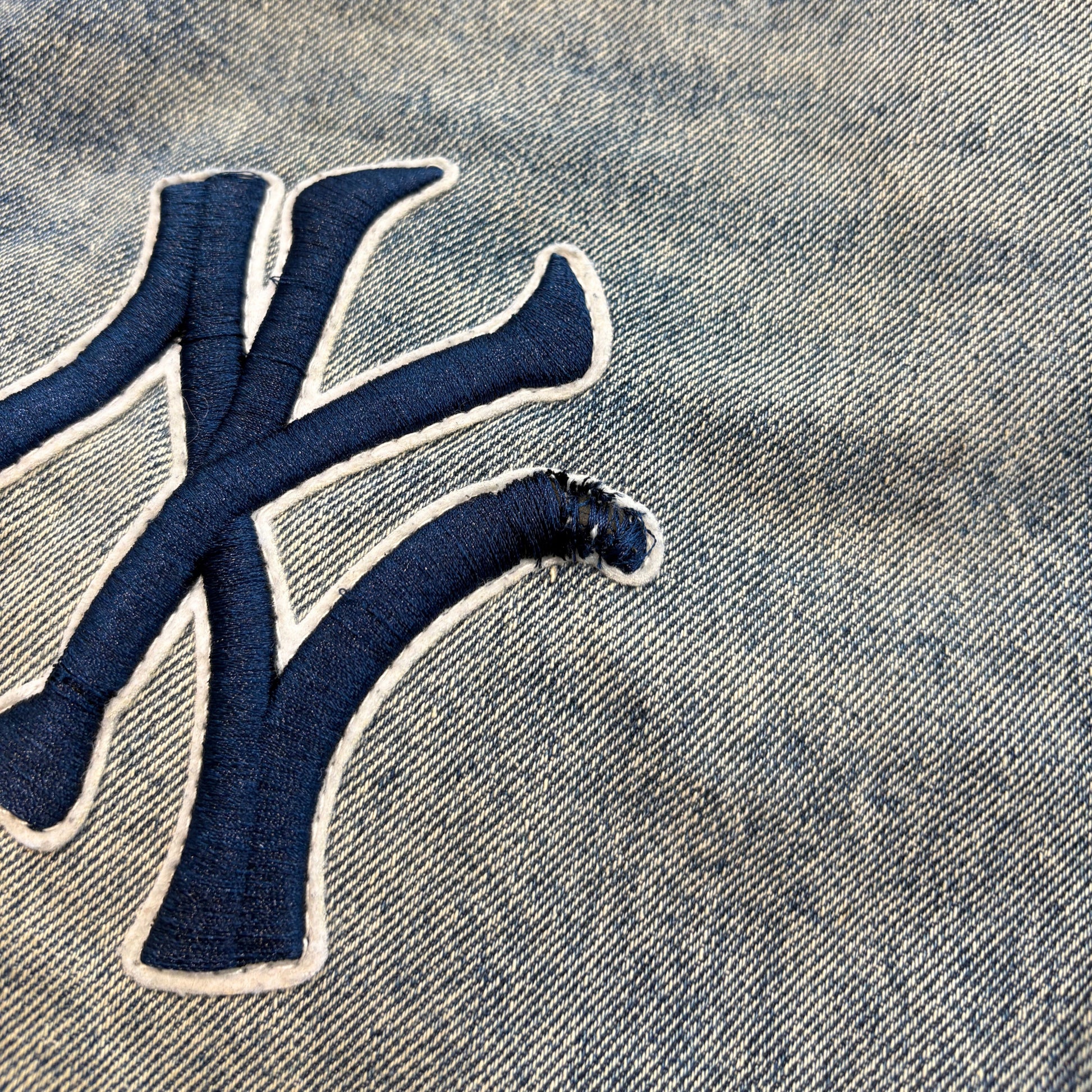 Gucci straight leg jeans in blue acid washed denim with an embroidered NY Yankees logo on the thigh and a faded black logo graphic across the back.
