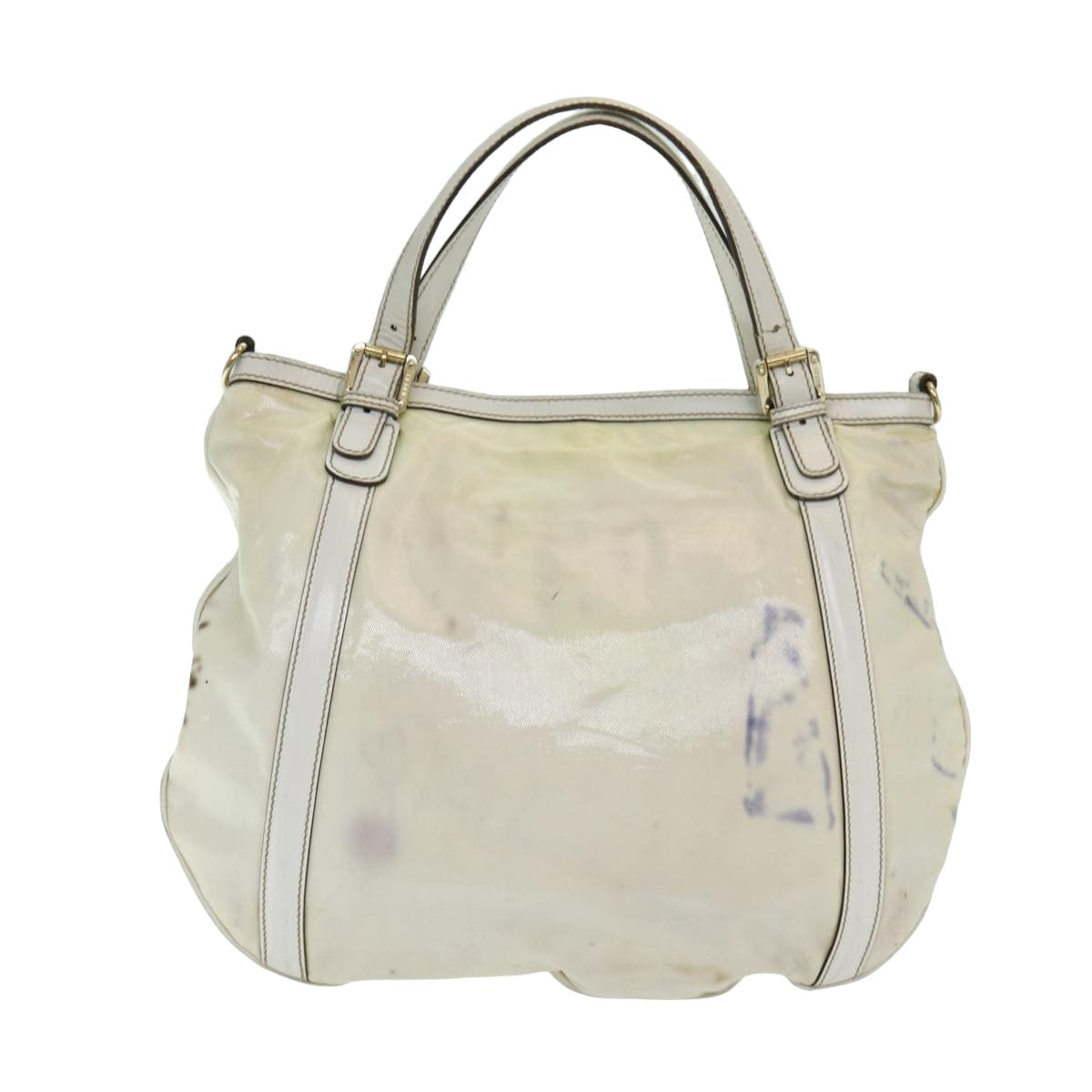 The exterior shows a loss of shape, rubbing, sunburn, discoloration, and color transfer. The shoulder strap and handle exhibit rubbing. The metal fittings have scratches. Inside, there is rubbing and some staining, with the pocket also showing rubbing. The corners display rubbing, and there is a noticeable storage smell.