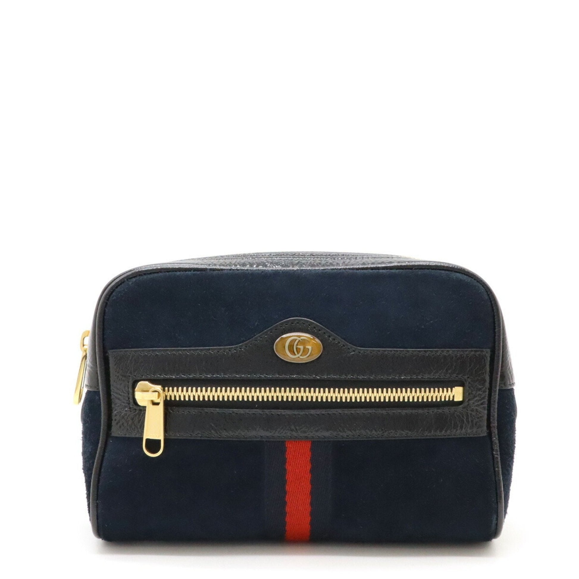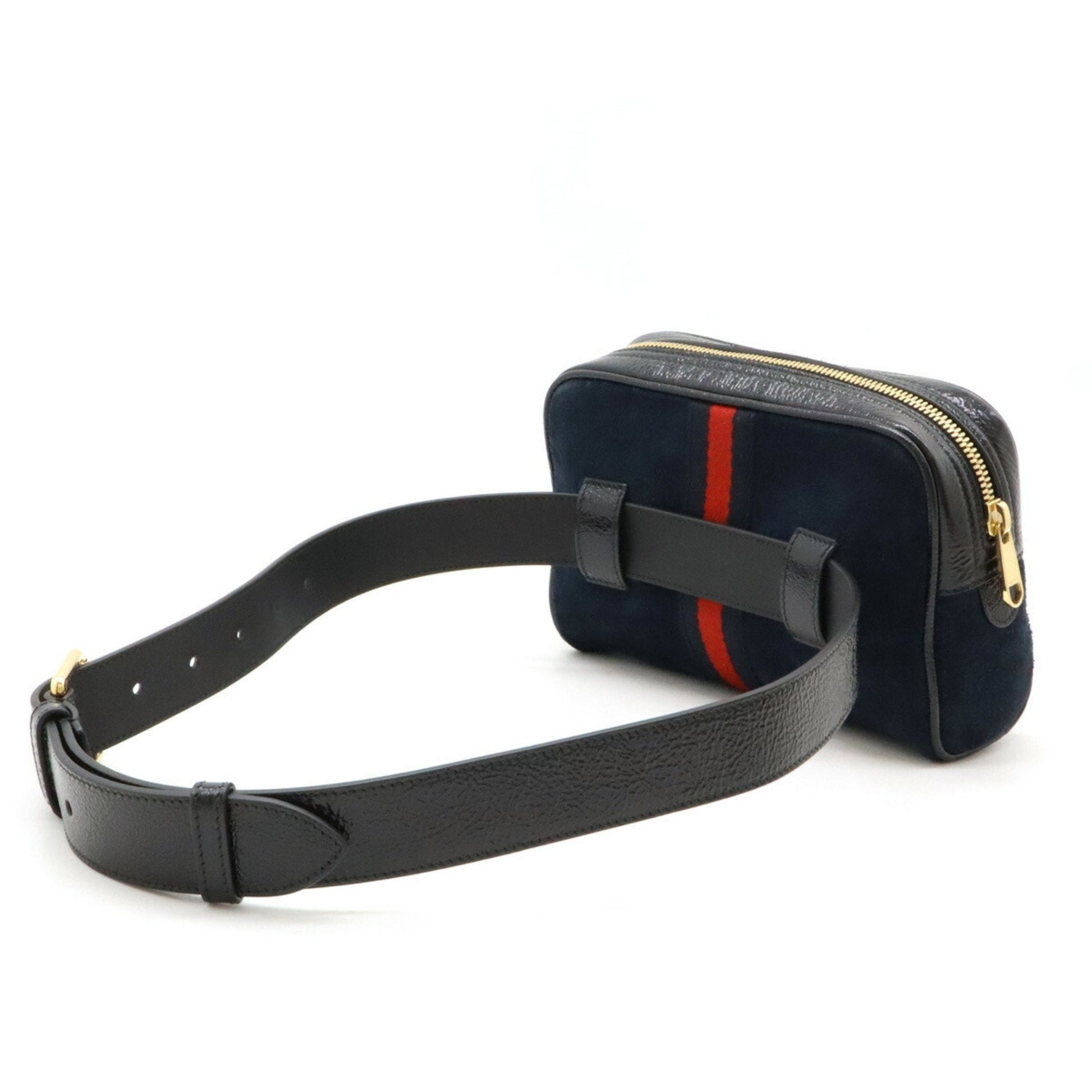 GUCCI's small Ophidia belt bag, also known as a fanny pack or shoulder bag, features an elegant design in suede and patent leather. It comes in a navy blue and red color combination, and incorporates the brand's signature Sherry line.