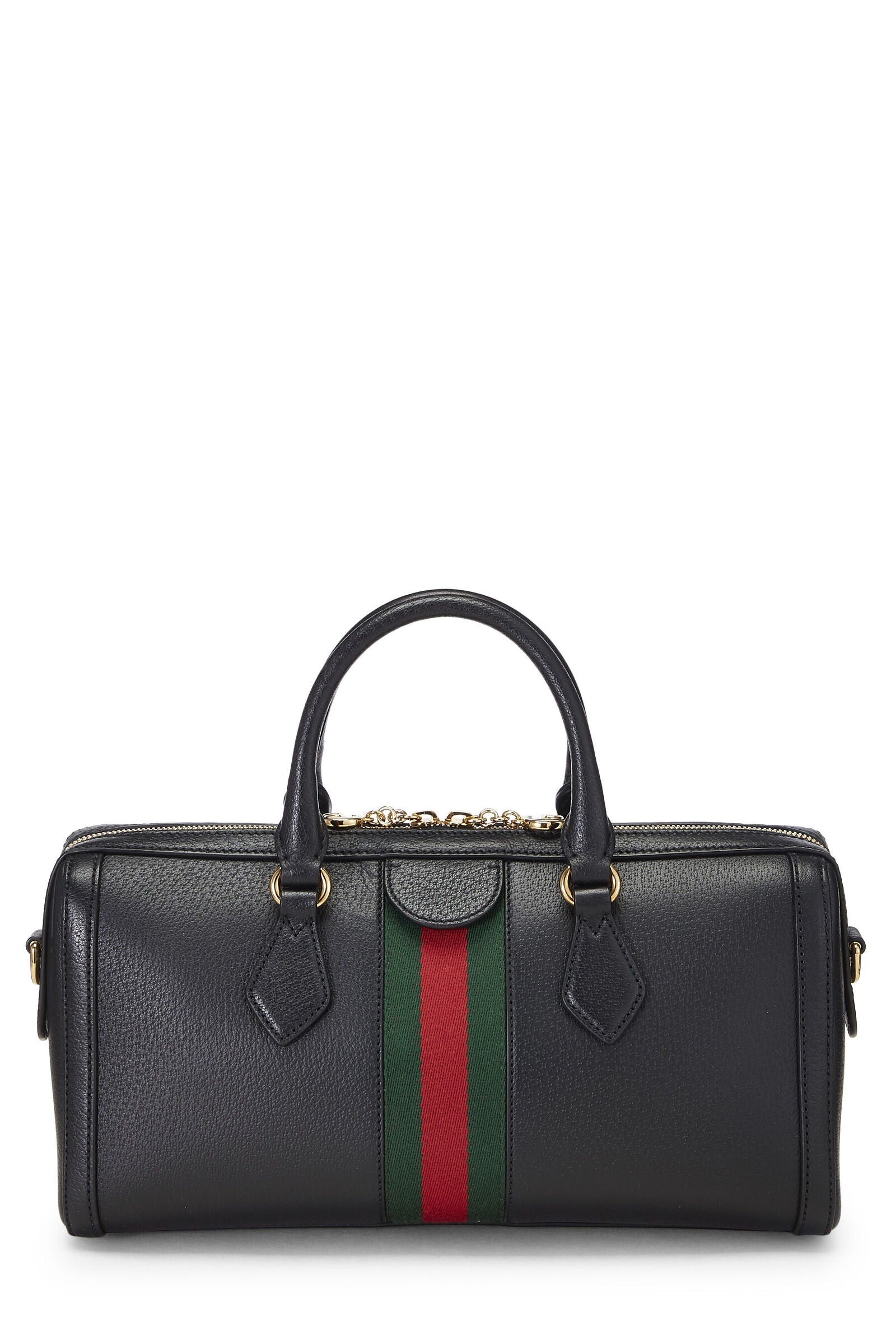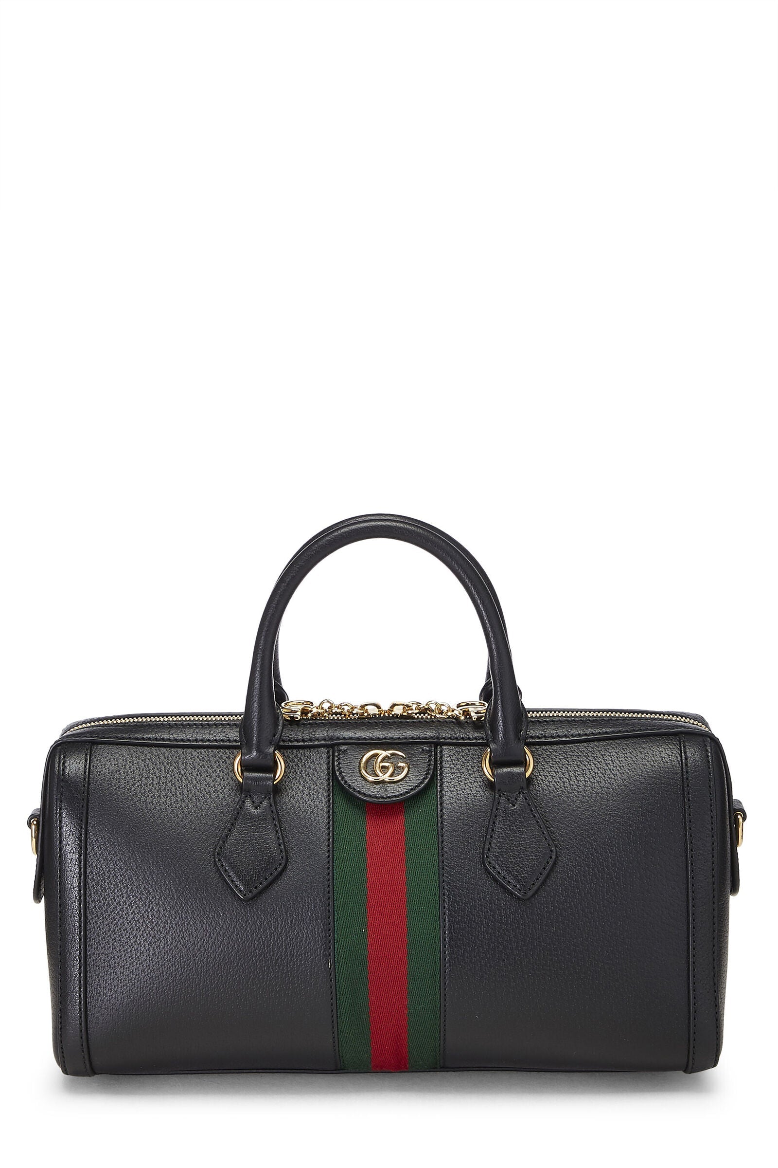 This Boston bag is crafted of grained leather in black and decorated with a classic Web stripe, gold-tone GG hardware, zipper pullers and GG charms. It features a taupe colored suede-like microfiber lining interior with one large zipper pocket and one slip pocket. The shoulder strap is adjustable/detachable and handles are double rolled.