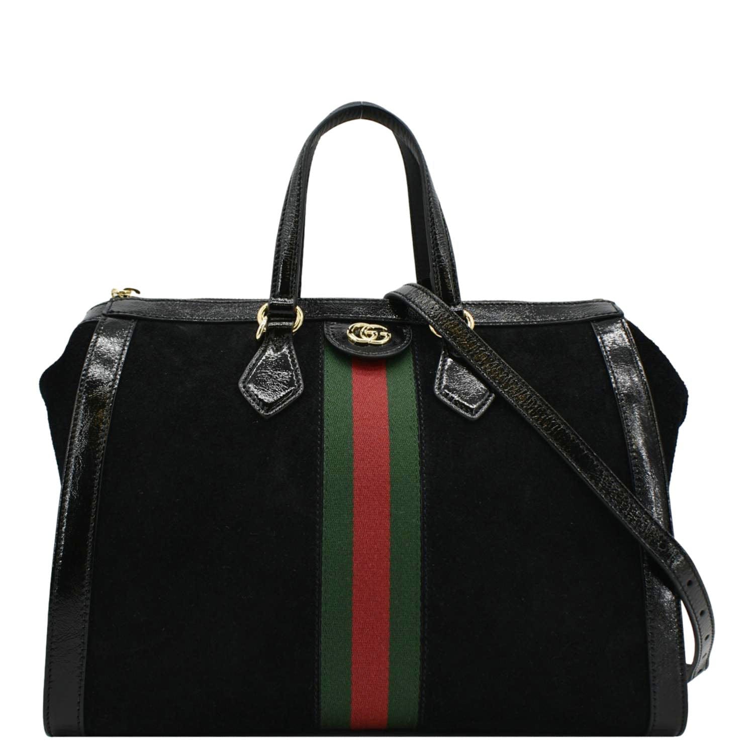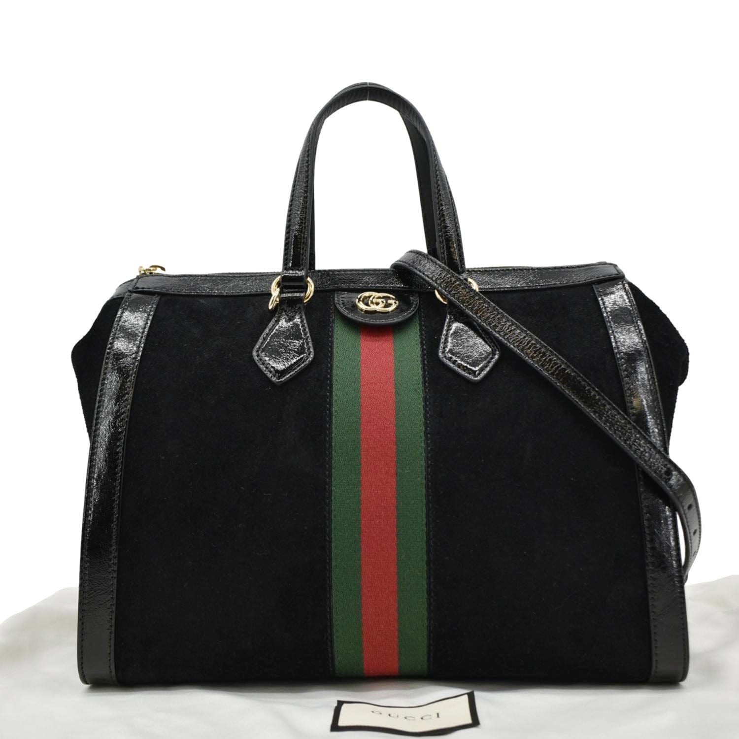 The Gucci Ophidia GG Medium Suede Tote Bag in Black (524537) showcases the brand's signature GG Supreme canvas with a luxurious suede finish. Featuring the iconic green and red Web stripe, this spacious and stylish tote is perfect for everyday use.