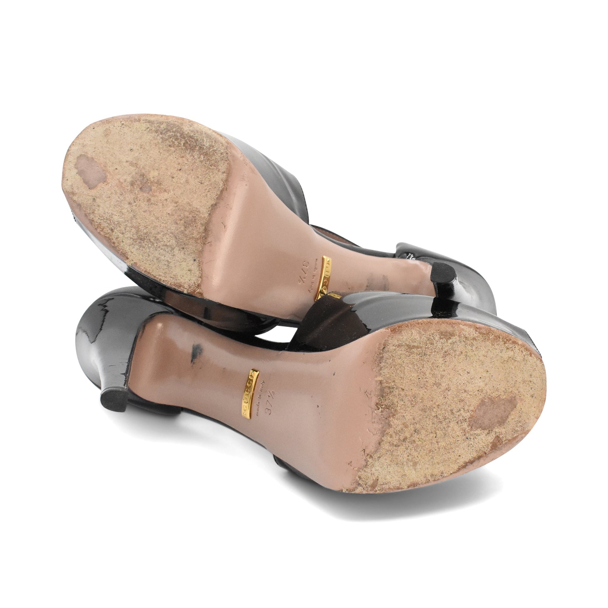 Gucci 'Lili' peep-toe heels in black patent leather with a platform heel and crisscross strap detail.