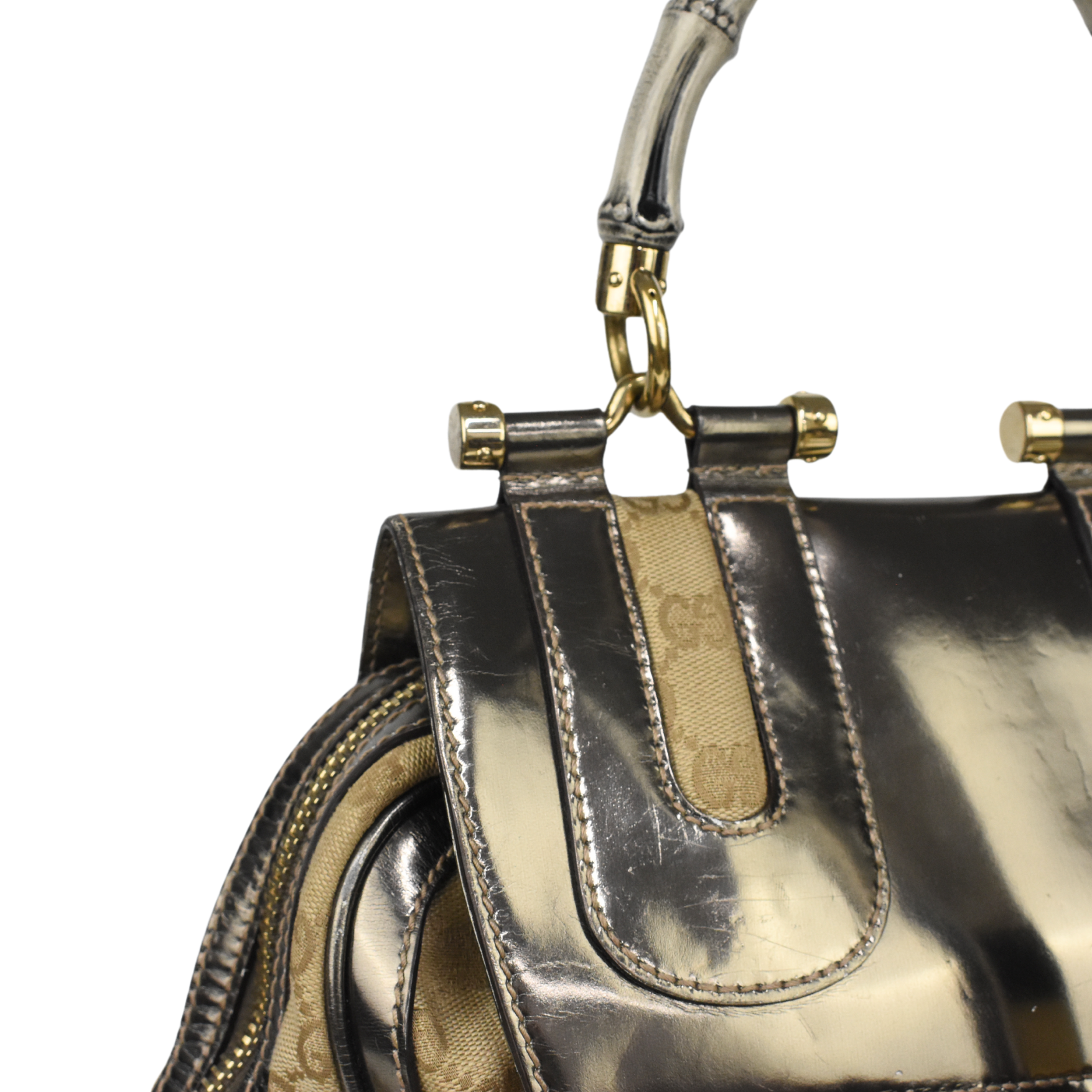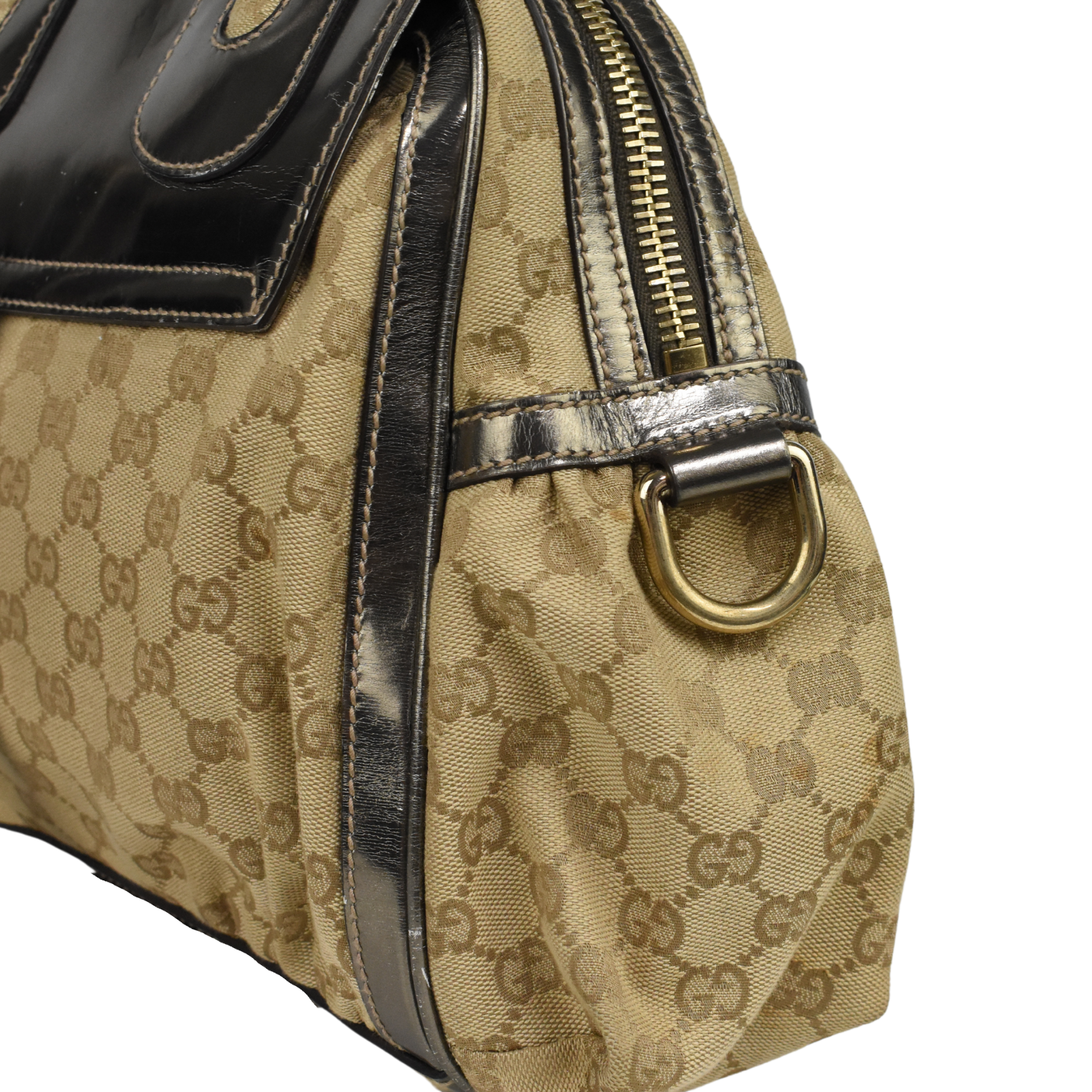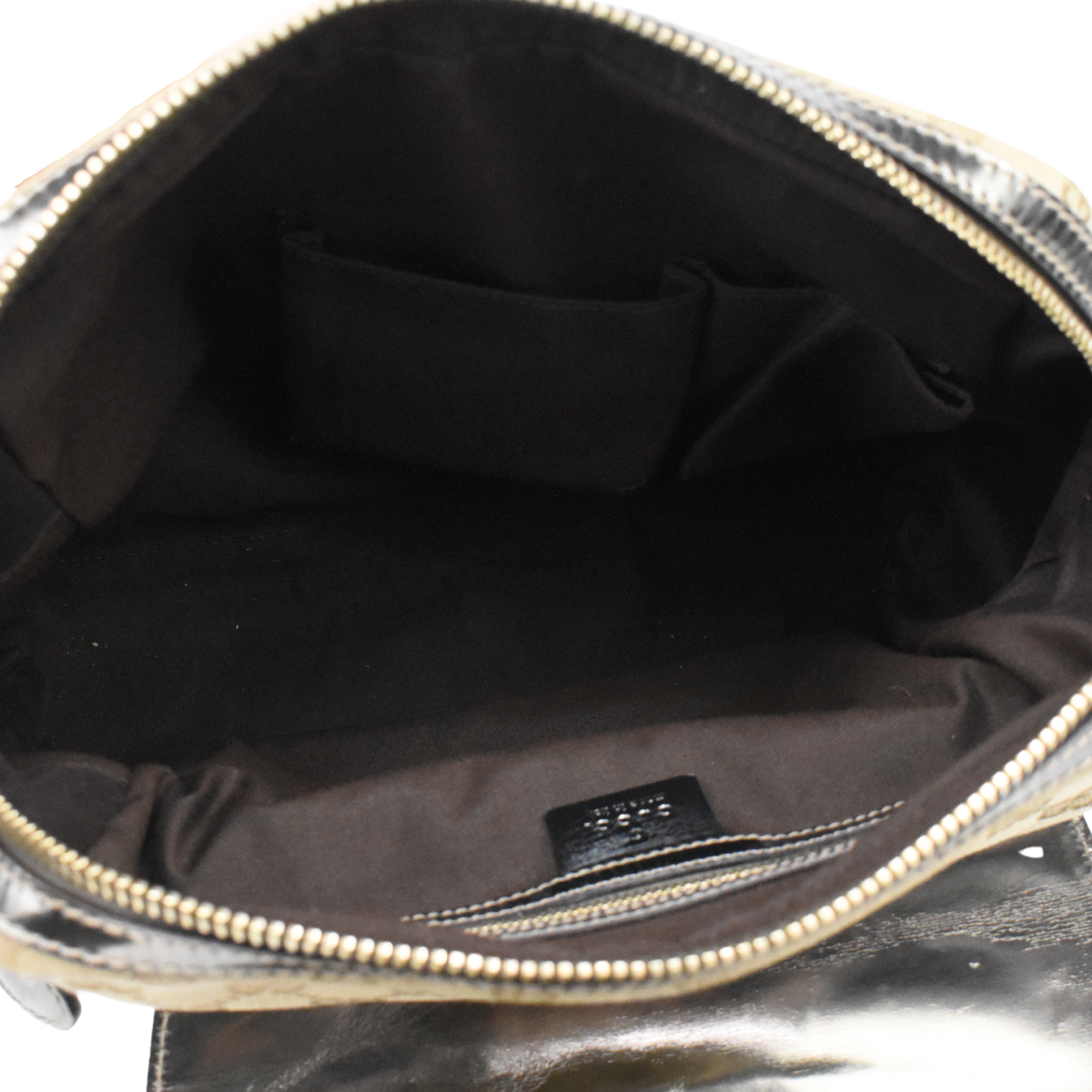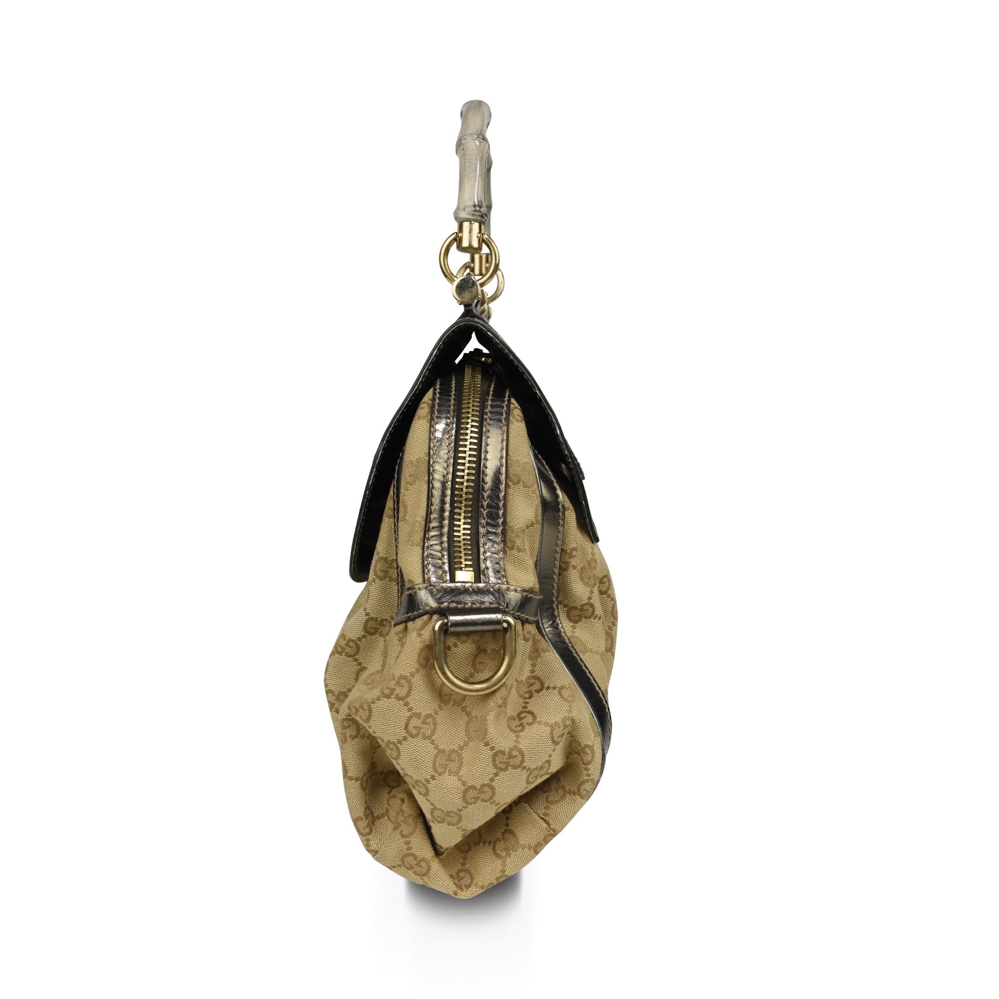 Gucci 'Pop' hobo bag in beige monogram printed canvas with a metallic bronze patent leather trim. Features a bamboo top handle and turnlock closure, a removable shoulder strap with gold hardware, and a top flap opening revealing a zip closure and brown canvas inner lining.