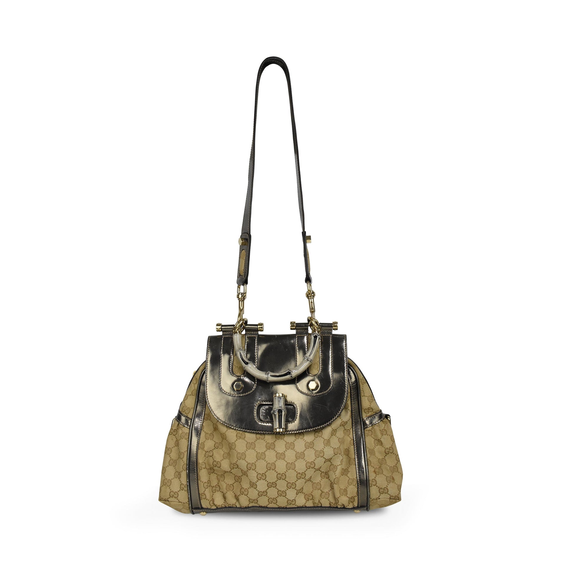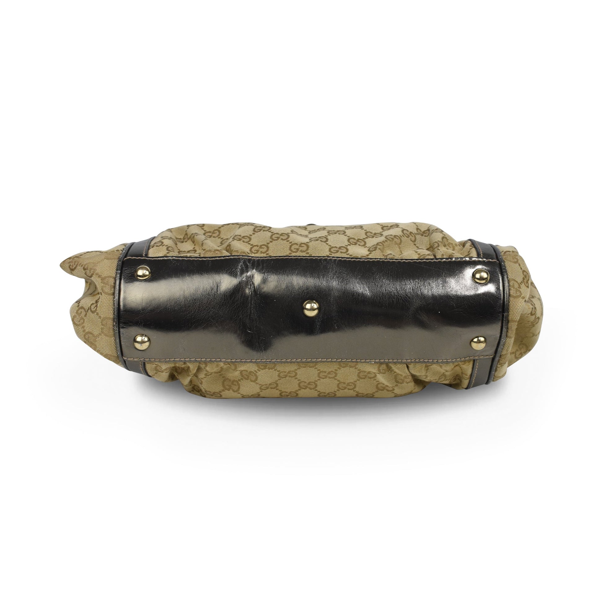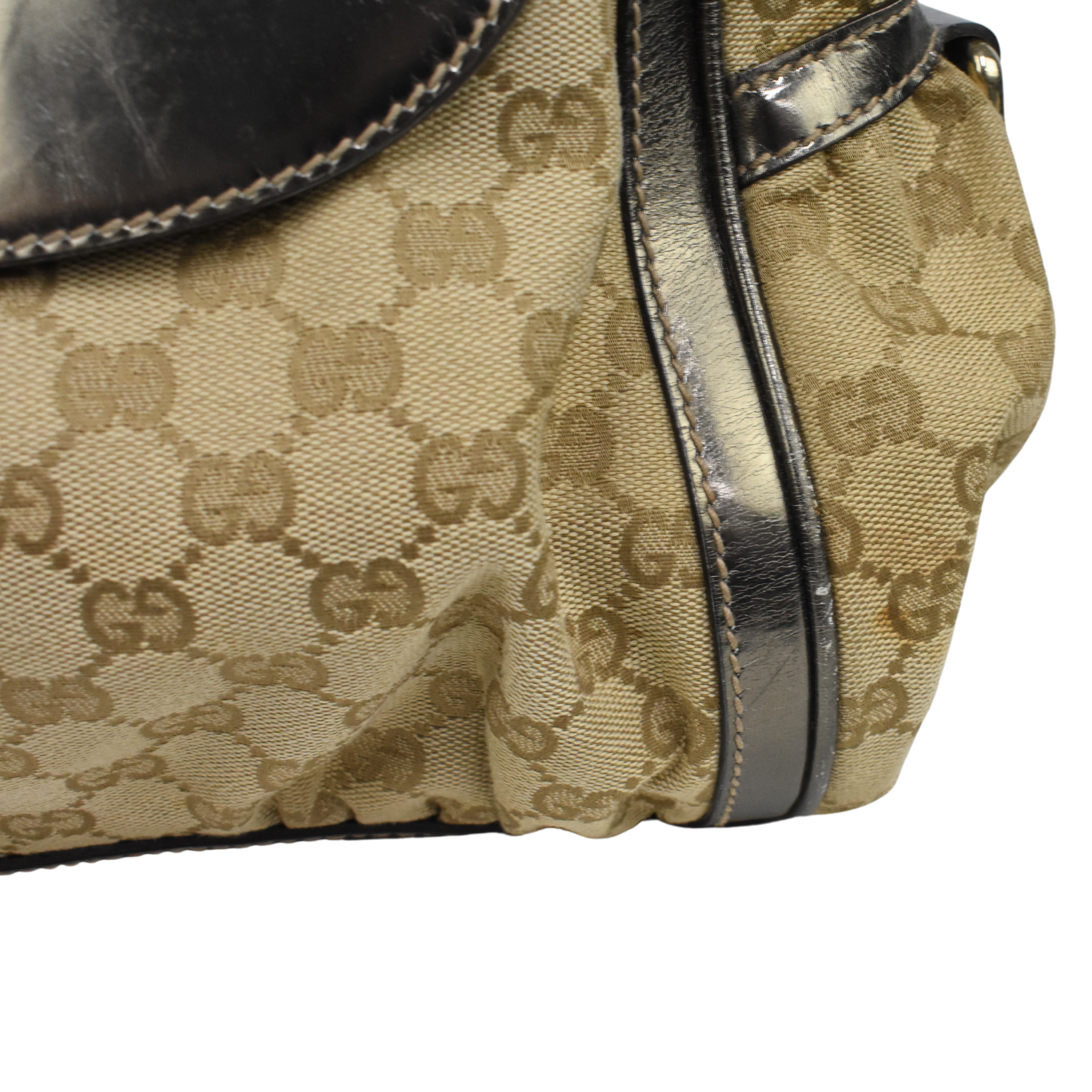 Gucci 'Pop' hobo bag in beige monogram printed canvas with a metallic bronze patent leather trim. Features a bamboo top handle and turnlock closure, a removable shoulder strap with gold hardware, and a top flap opening revealing a zip closure and brown canvas inner lining.