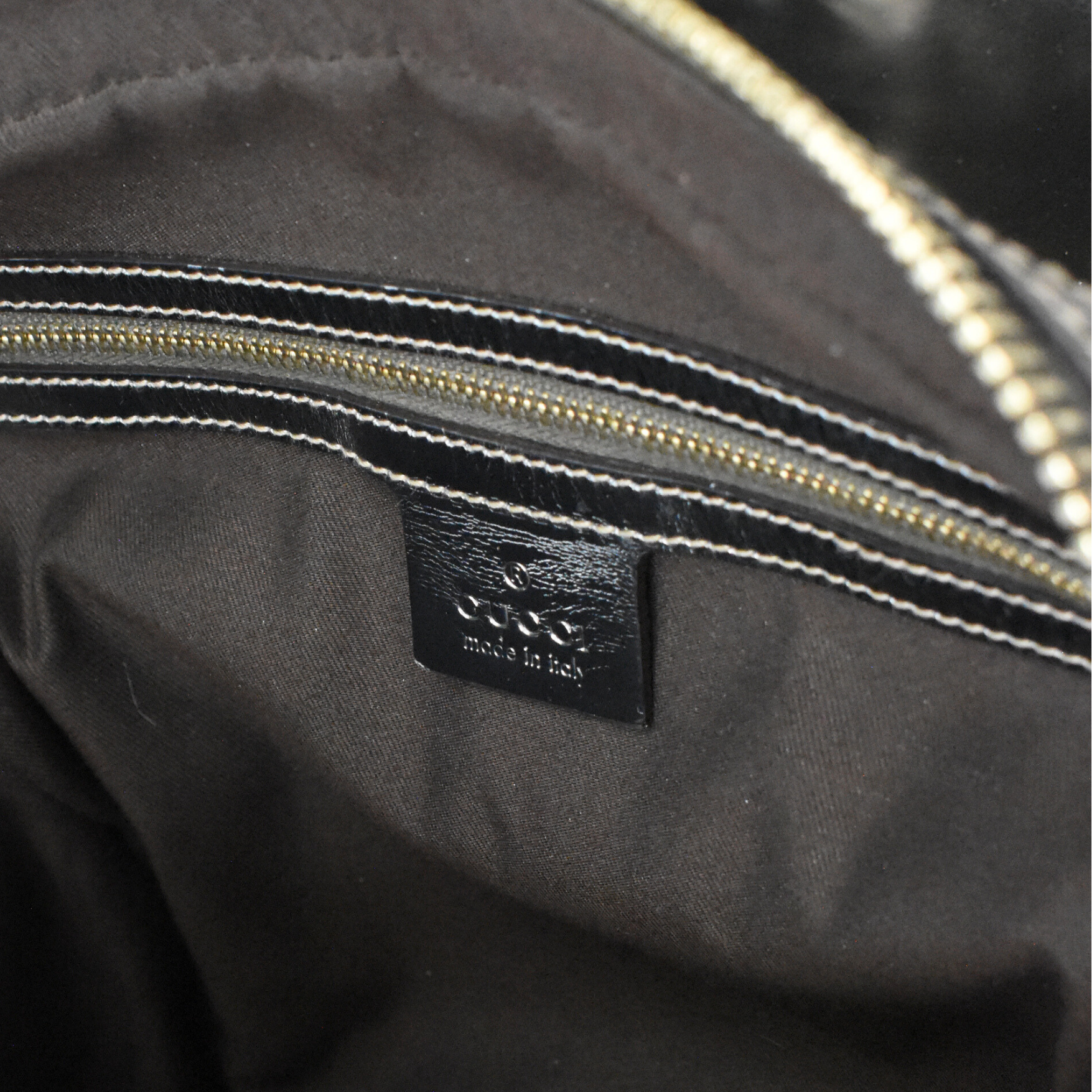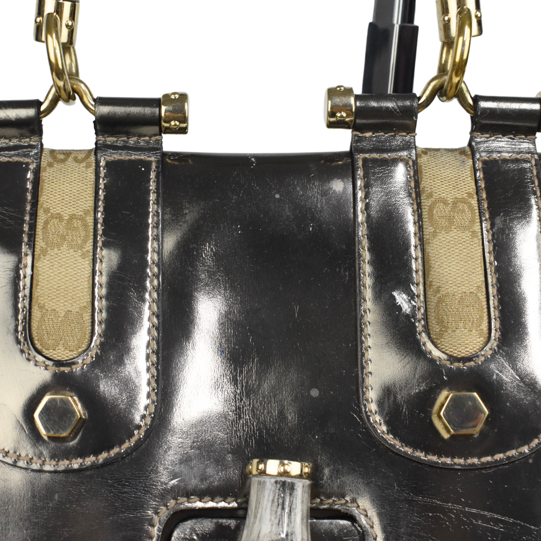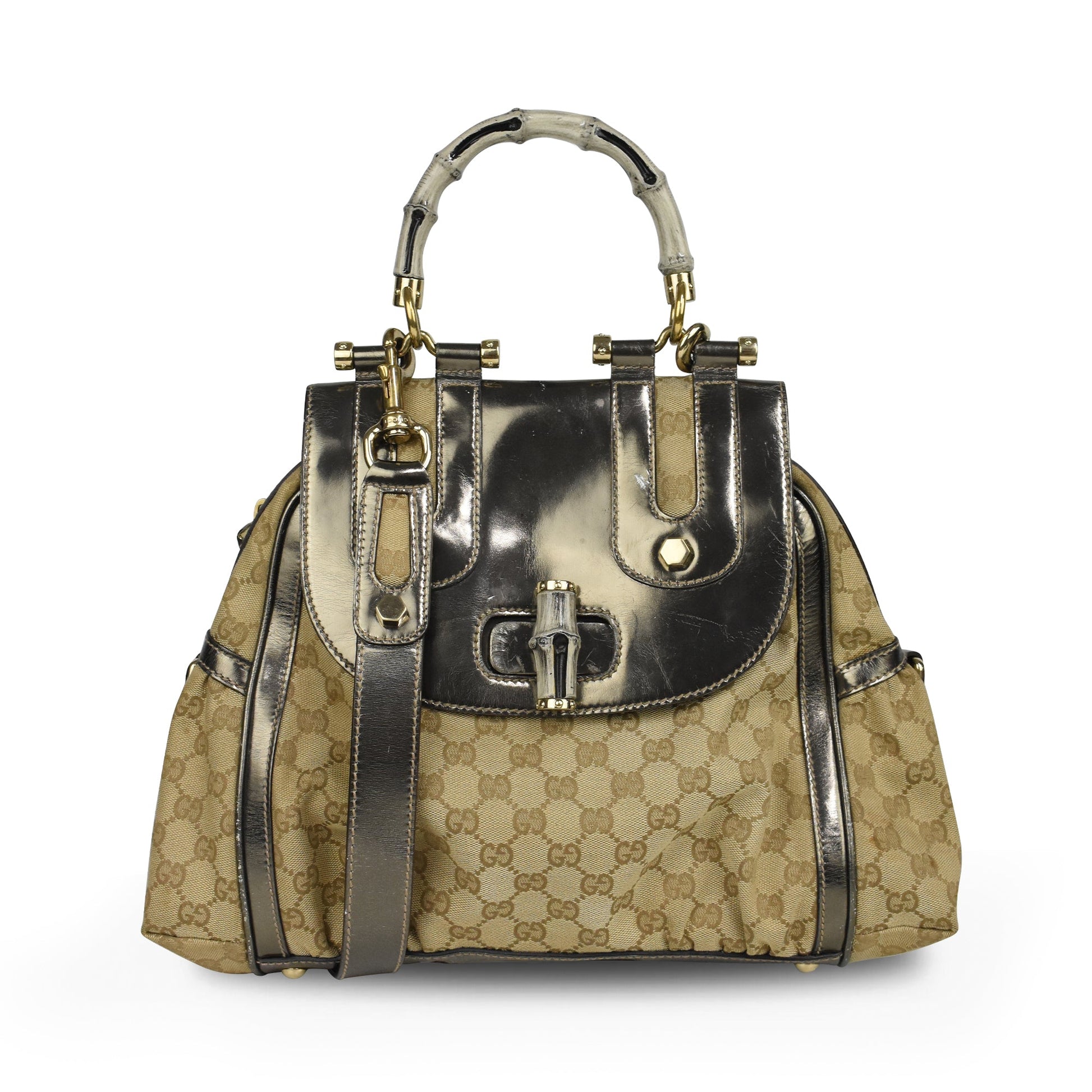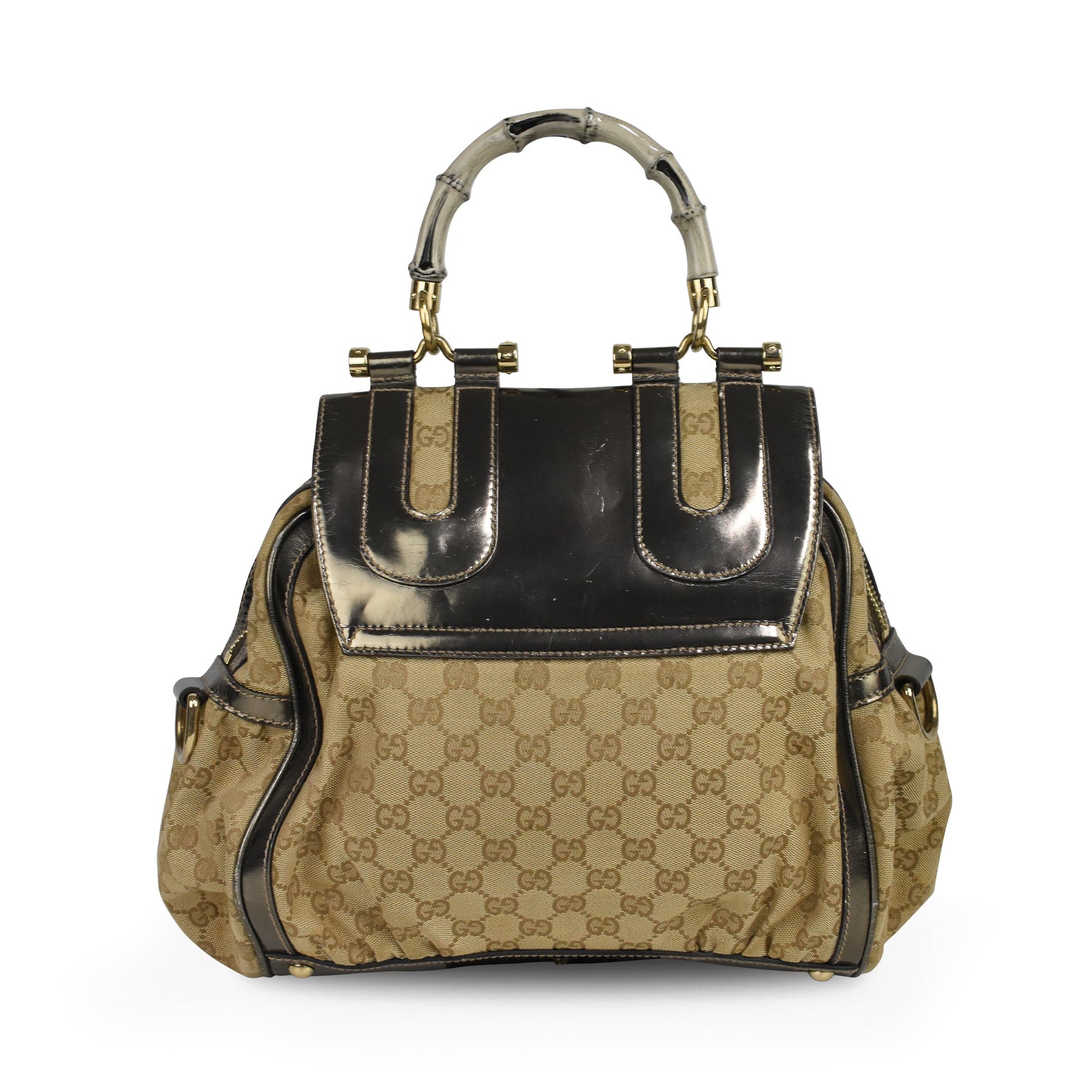 Gucci 'Pop' hobo bag in beige monogram printed canvas with a metallic bronze patent leather trim. Features a bamboo top handle and turnlock closure, a removable shoulder strap with gold hardware, and a top flap opening revealing a zip closure and brown canvas inner lining.