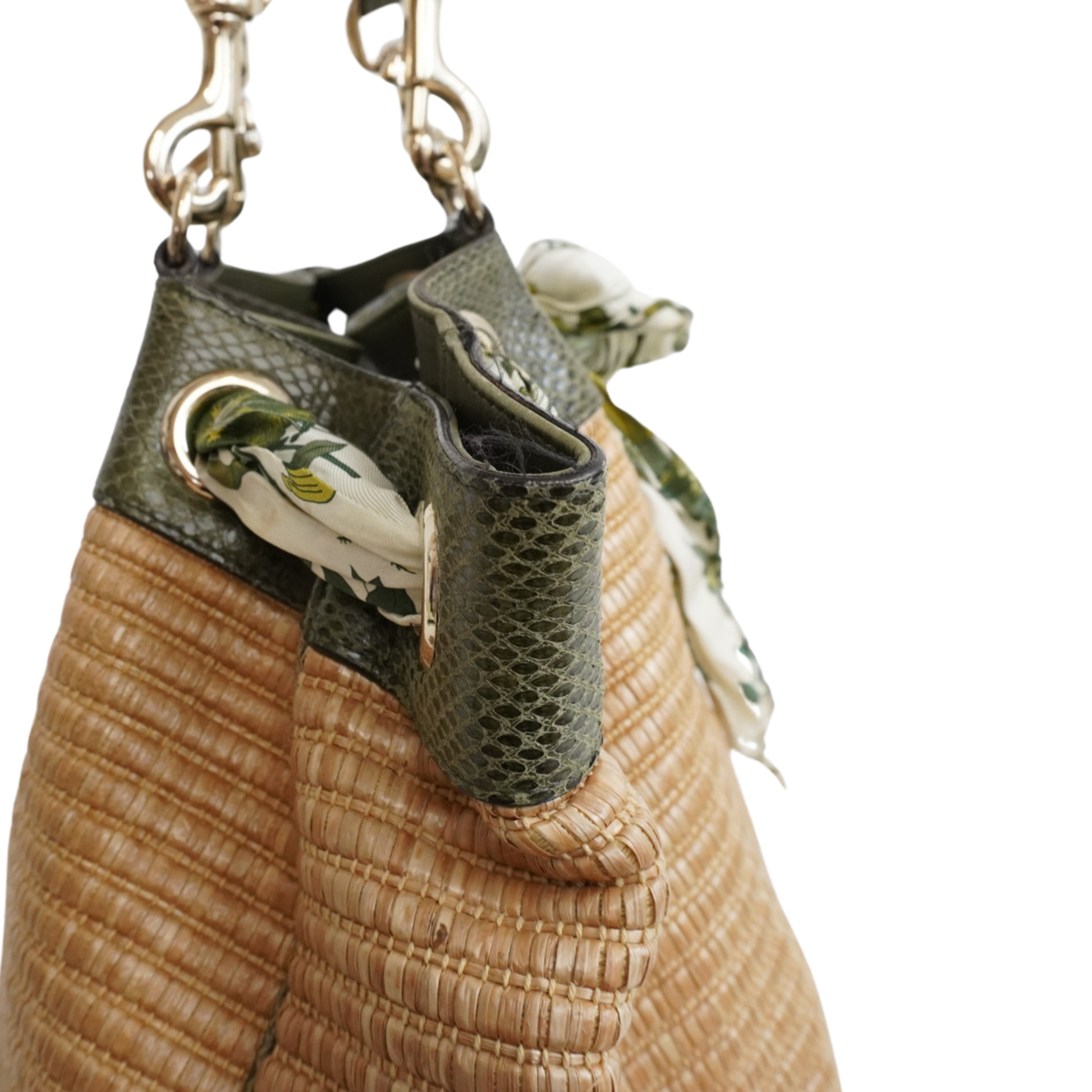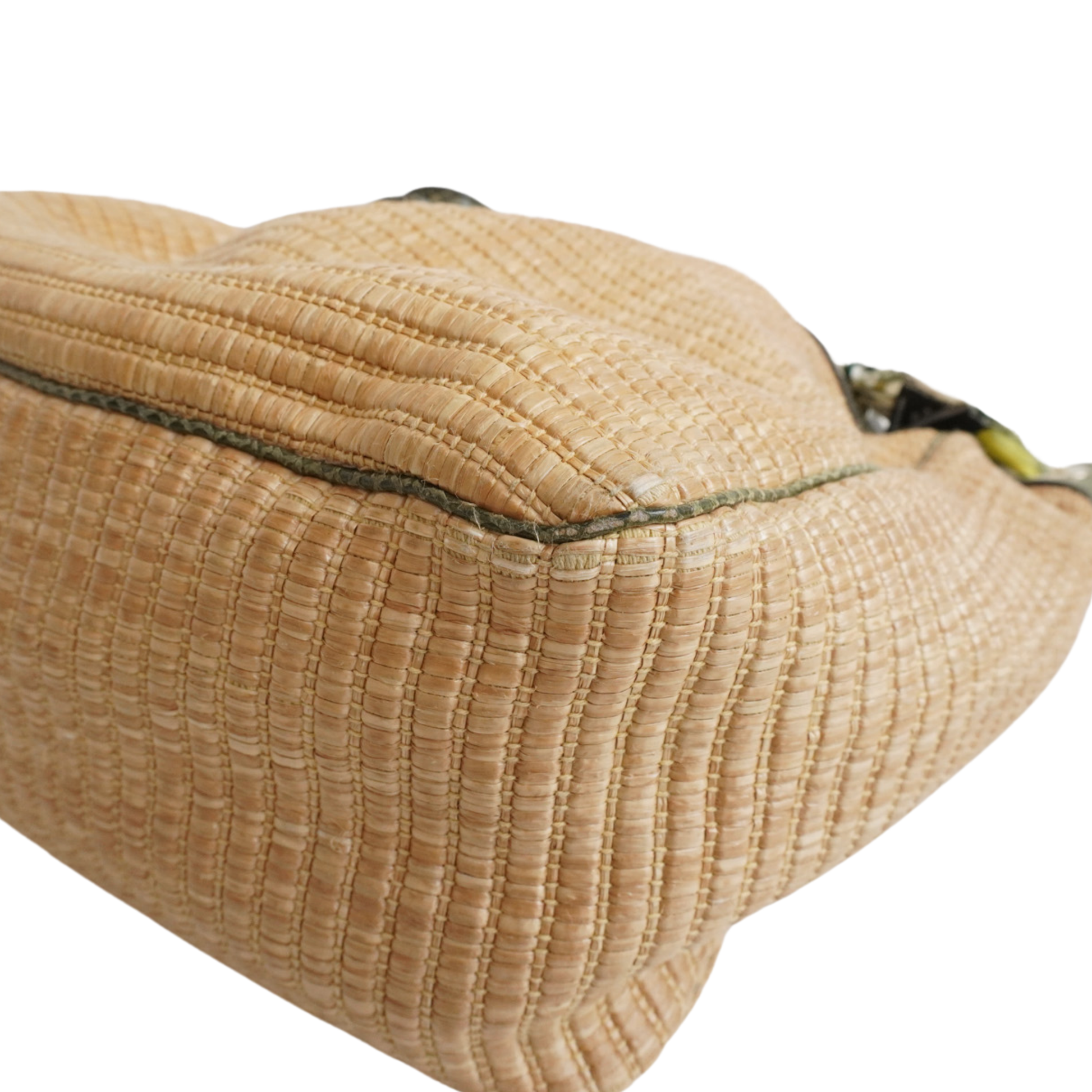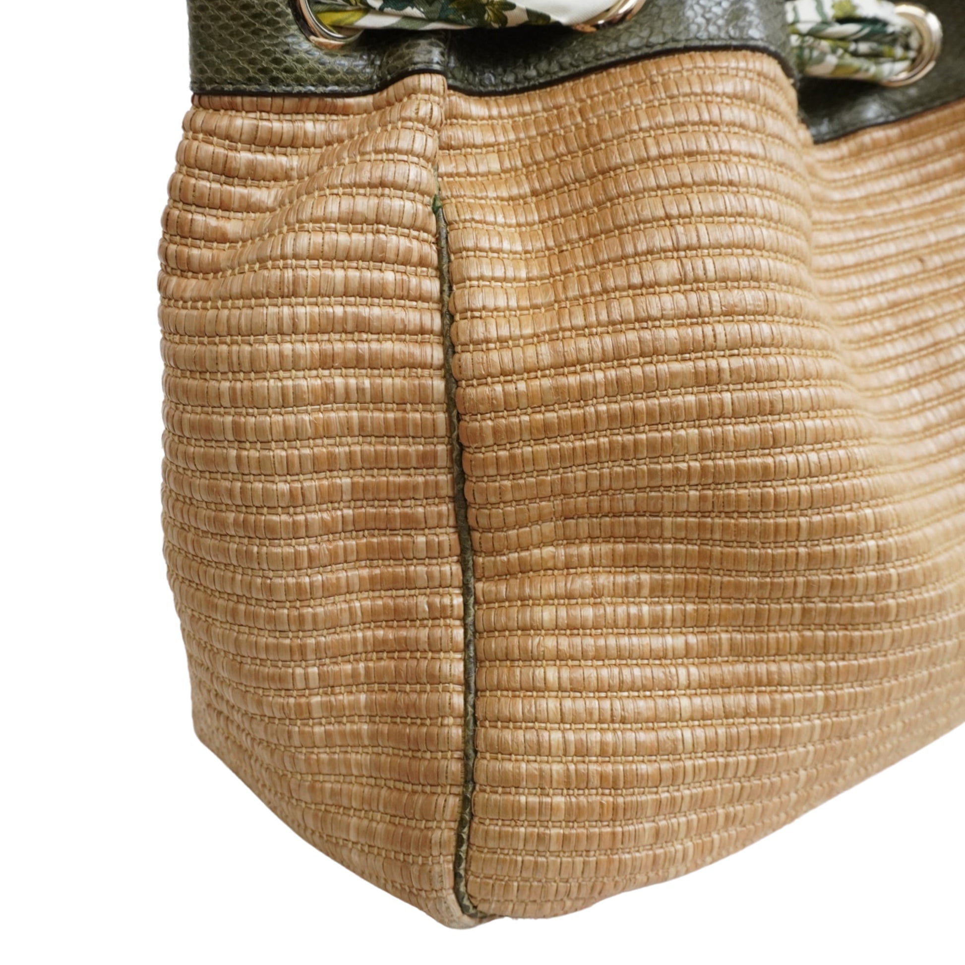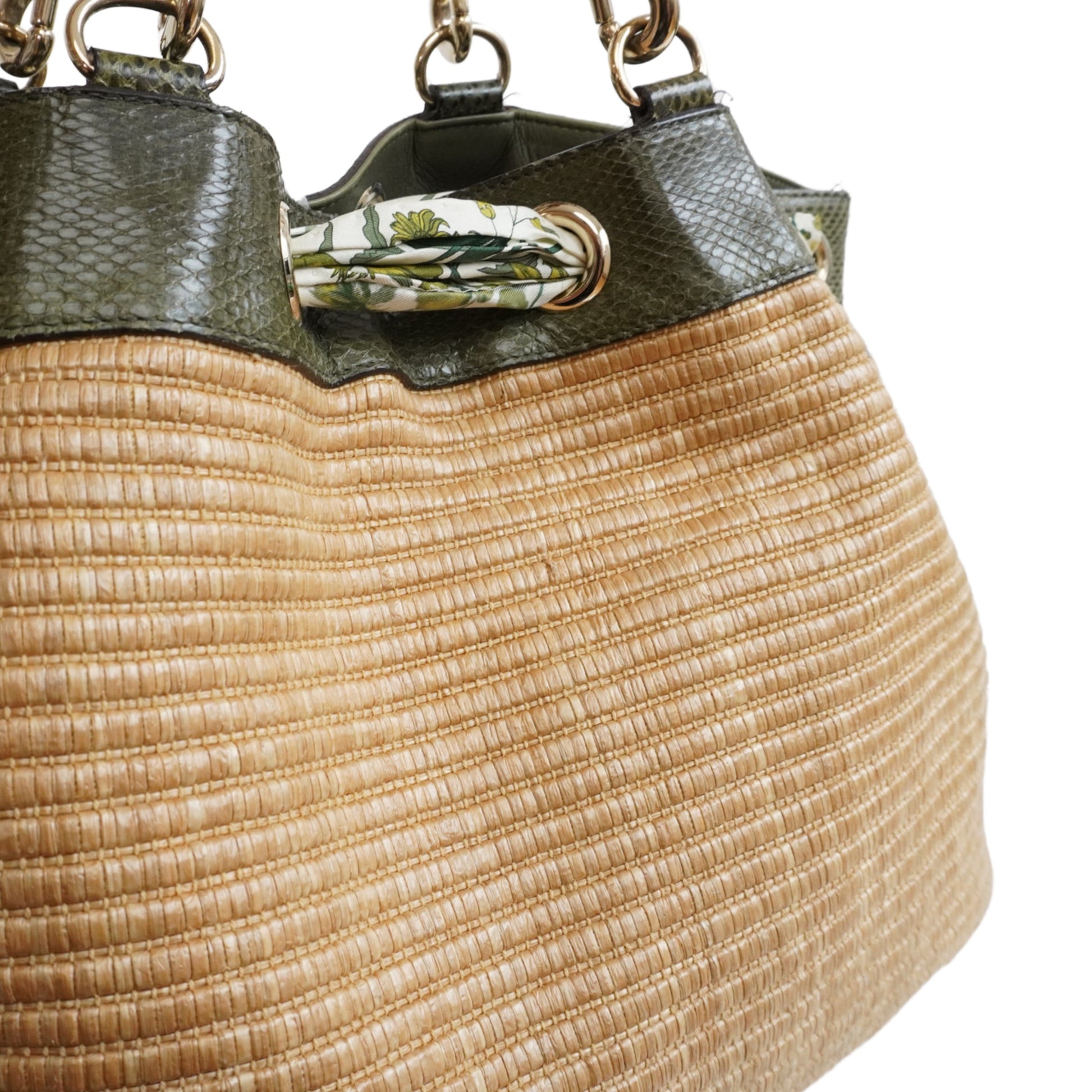 Gucci 'Positano' tote bag in tan woven raffia with a green snakeskin trim, dual removable top handles with gold buckle hardware, and a silk scarf detail around the top. The bag has a beige canvas interior lining with a zip pocket.