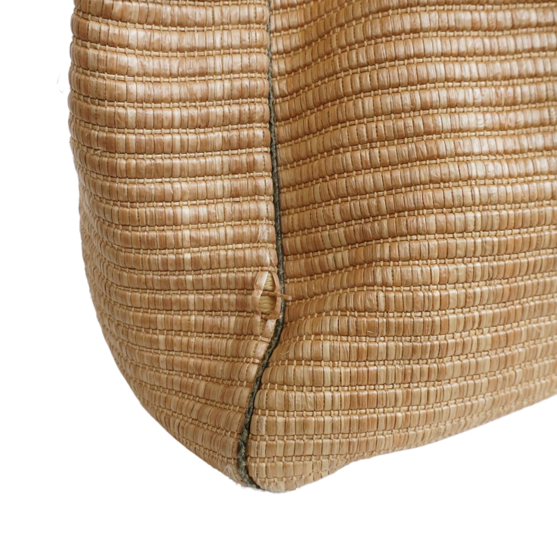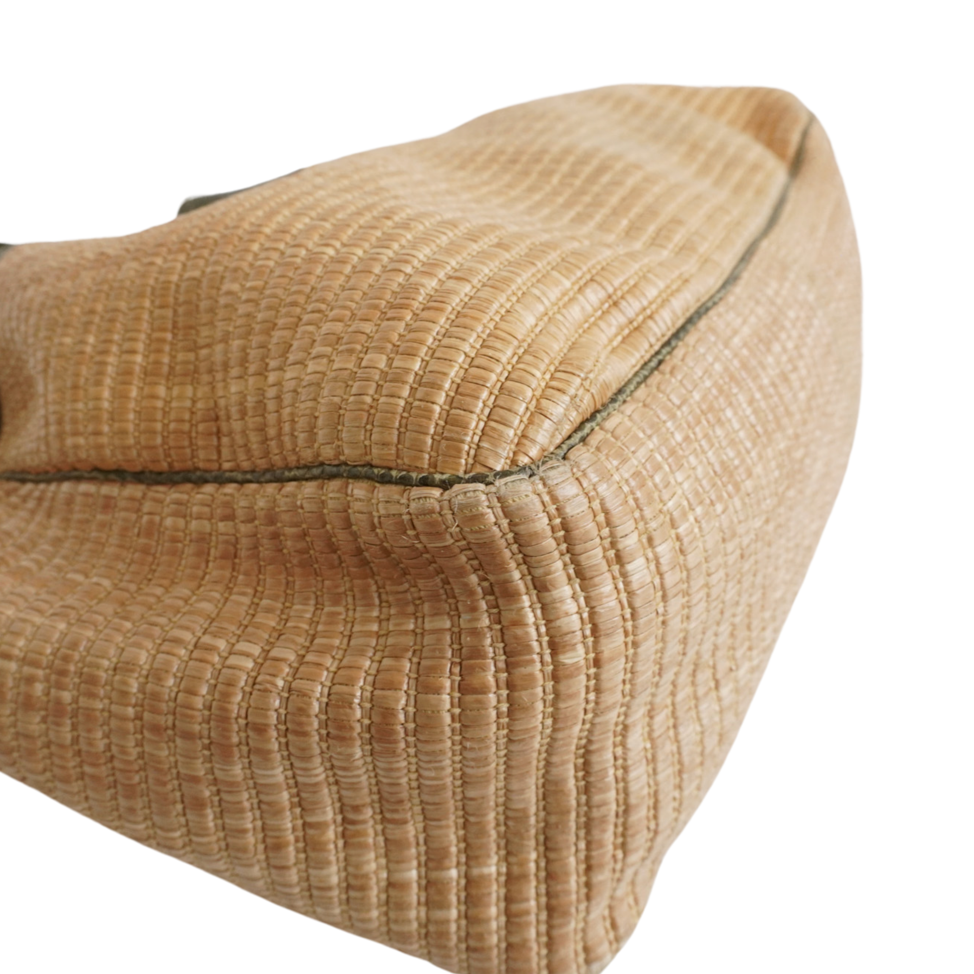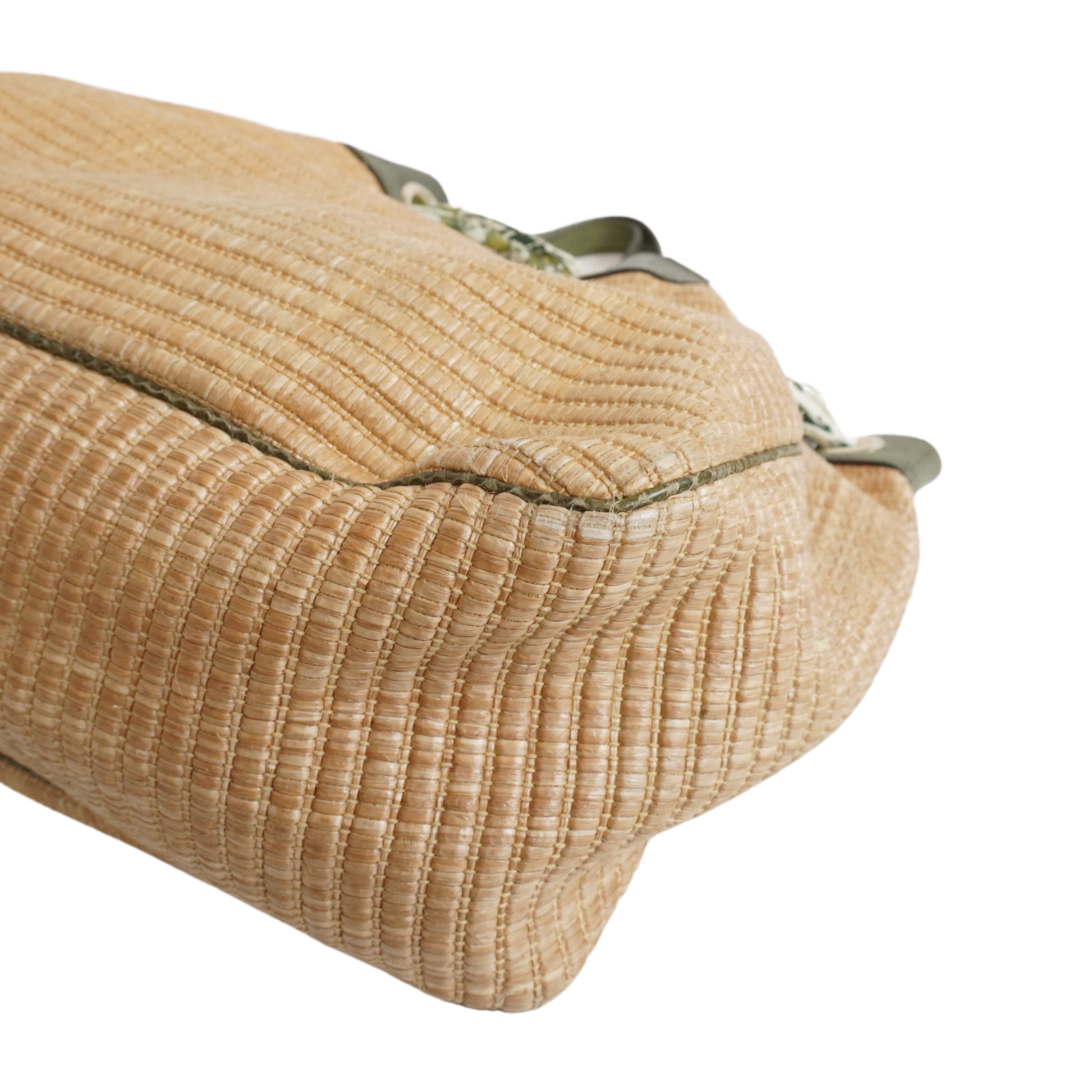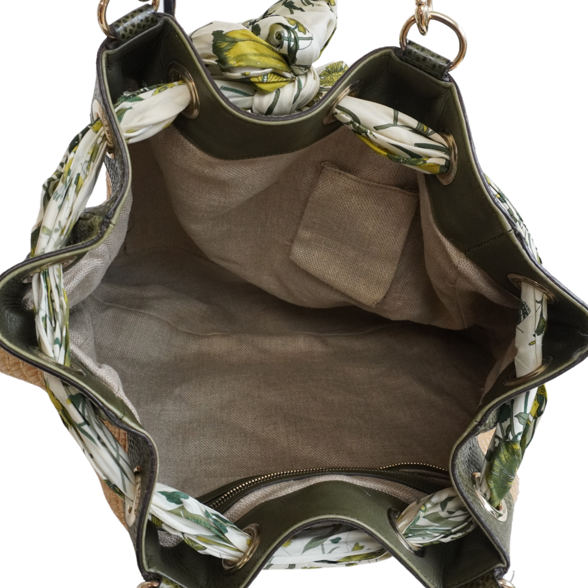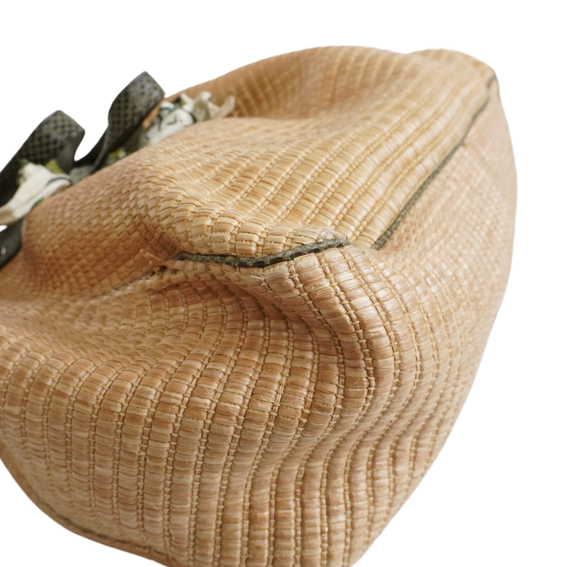 Gucci 'Positano' tote bag in tan woven raffia with a green snakeskin trim, dual removable top handles with gold buckle hardware, and a silk scarf detail around the top. The bag has a beige canvas interior lining with a zip pocket.