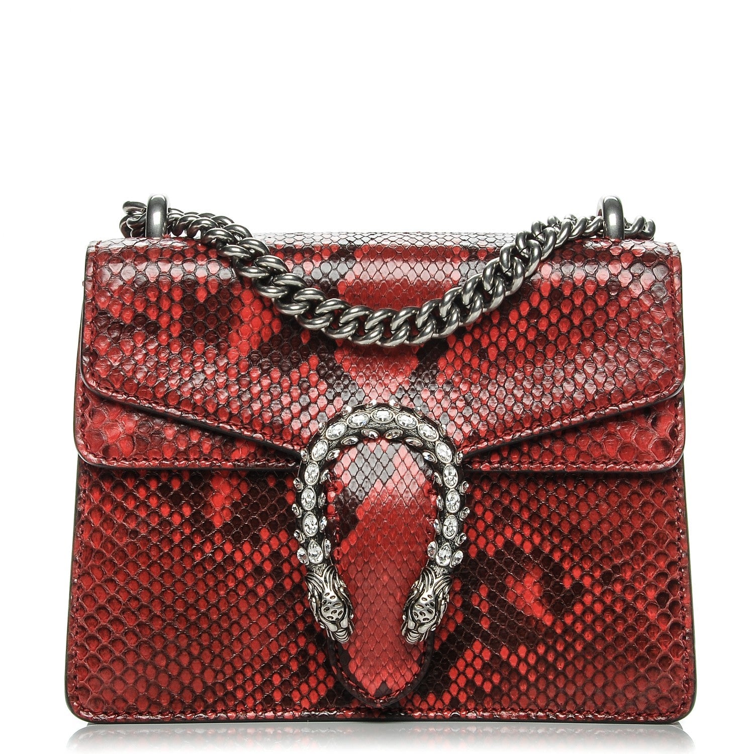 This Luxurious and eye-catching Mini Dionysus shoulder bag is Crafted from exotic python leather in a rich dark maroon red. The design features Gucci's signature aged silver-tone chain-link shoulder strap and a striking textured horseshoe-shaped closure adorned with lion heads and sparkling crystal embellishments.