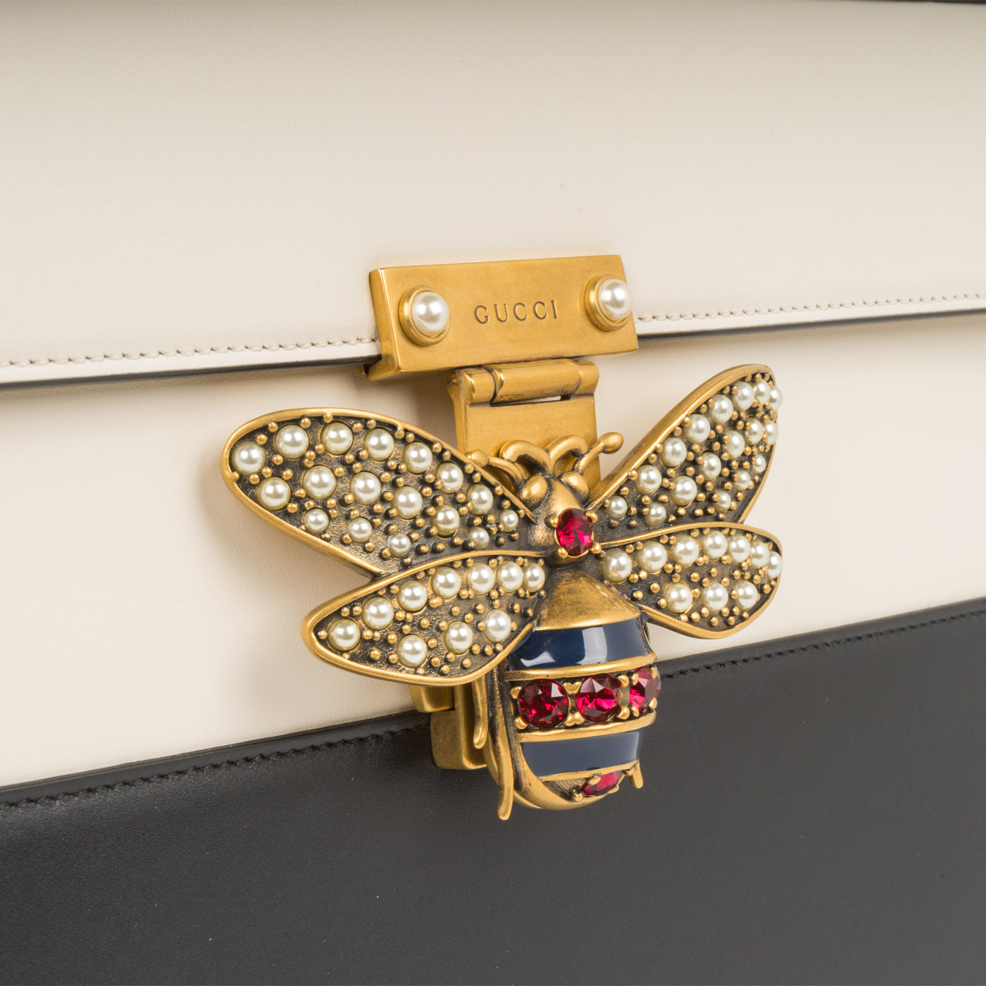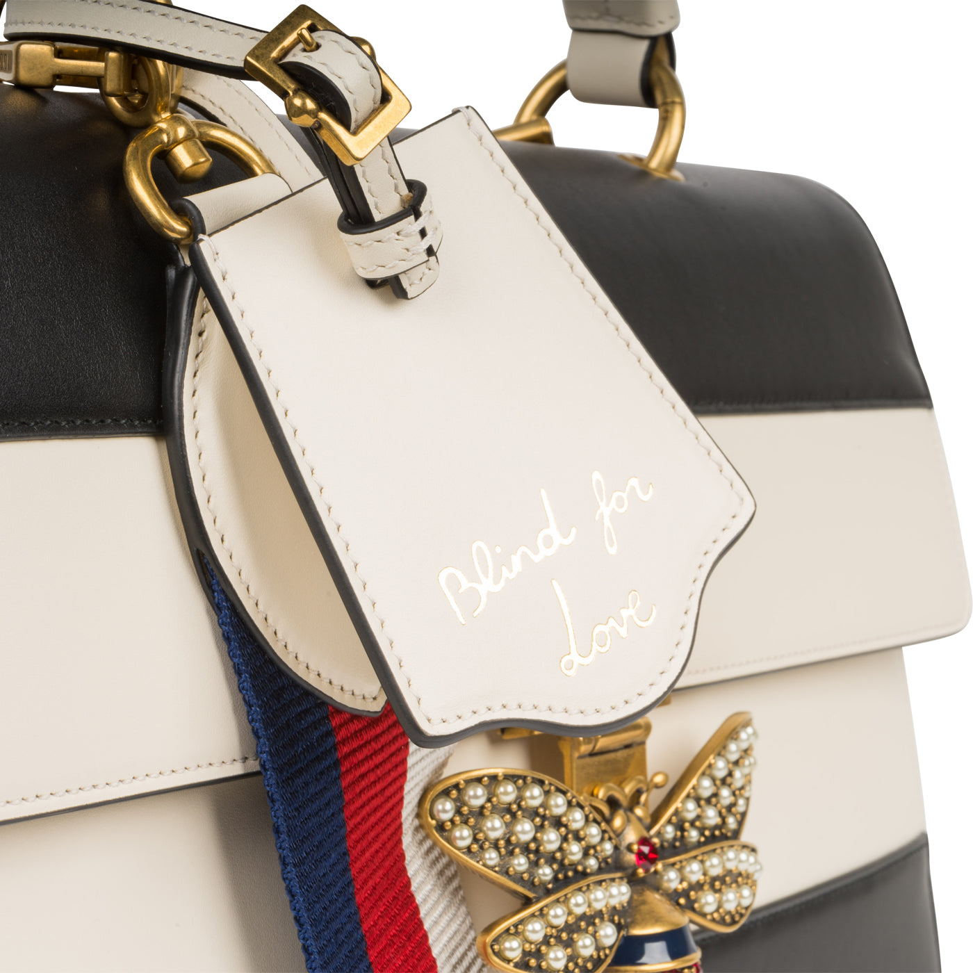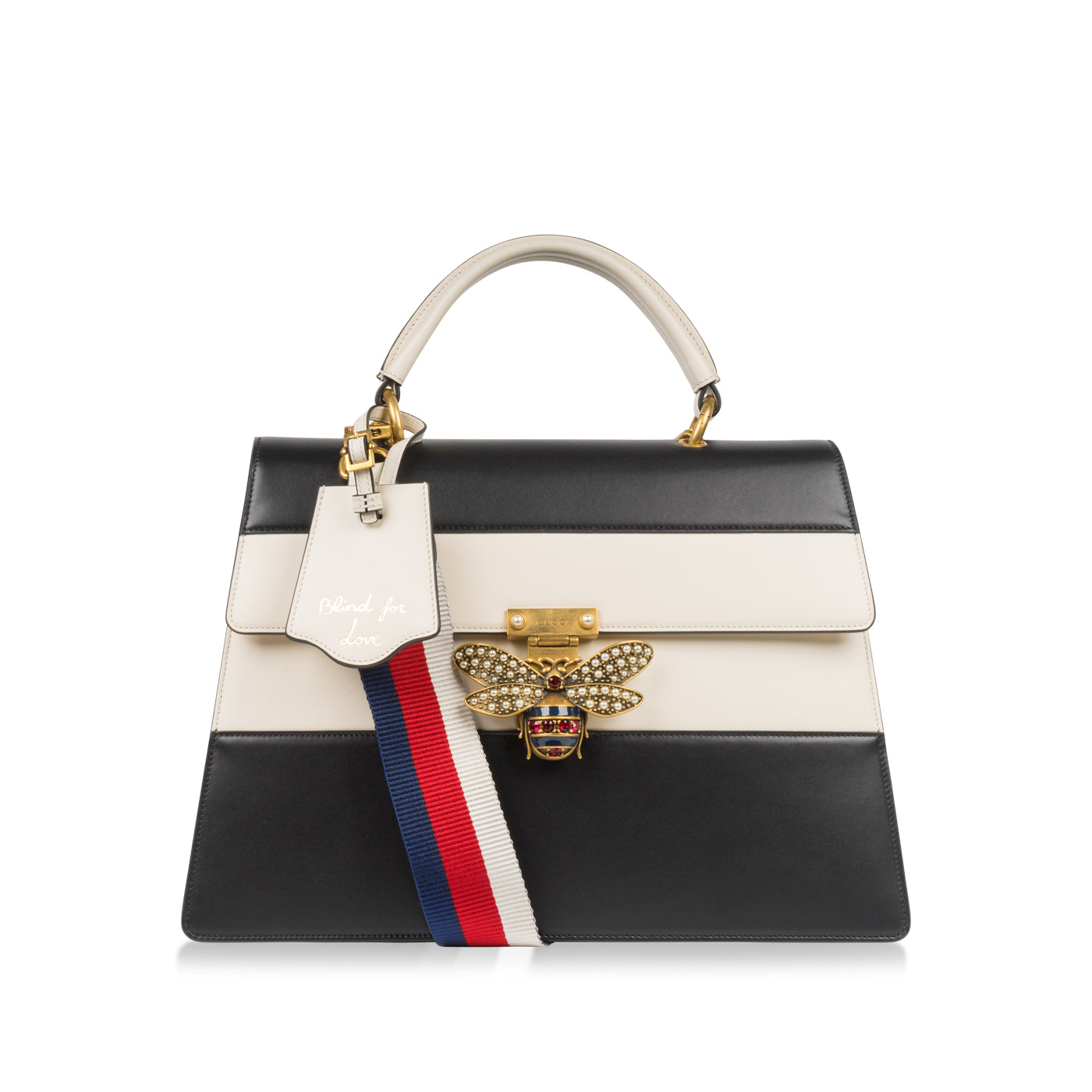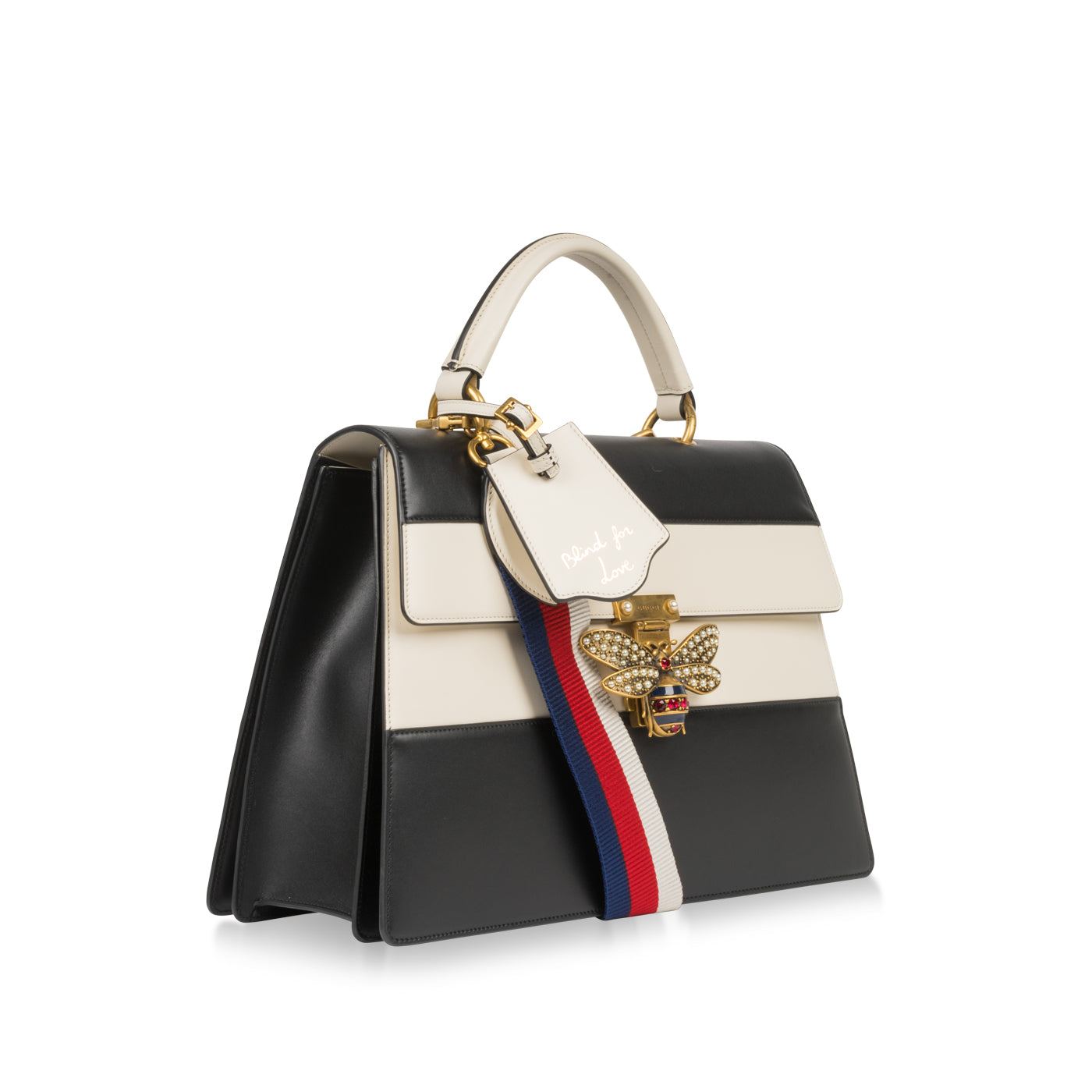 Crafted from black and white striped leather, the stunning Queen Margaret bag from Gucci is one of our favourites here at Bagista. A rare piece that perfectly balances fashion and function, if you're the kind of woman with a love luxury and statement pieces then the Queen Margaret is the bag for you. Ideal for a business woman working in the corporate world, or the perfect companion for the contemporary woman with an edgy sense of style, the Queen Margaret is a versatile bag you'll never get bored of. With the signature Gucci bee clasp featuring faux pearl and crystal embellishment, this unique bag is one of the more understated pieces from the brand. Unlike the acclaimed GG Marmont handbag, the Queen Margaret doesn't scream Gucci. Exuding a true "if you know, you know" aesthetic, this bag is a prime example of an understated-statement. Sleek, stylish and sophisticated balanced with youthful and playful elements, the Queen Margaret is a true must-have.