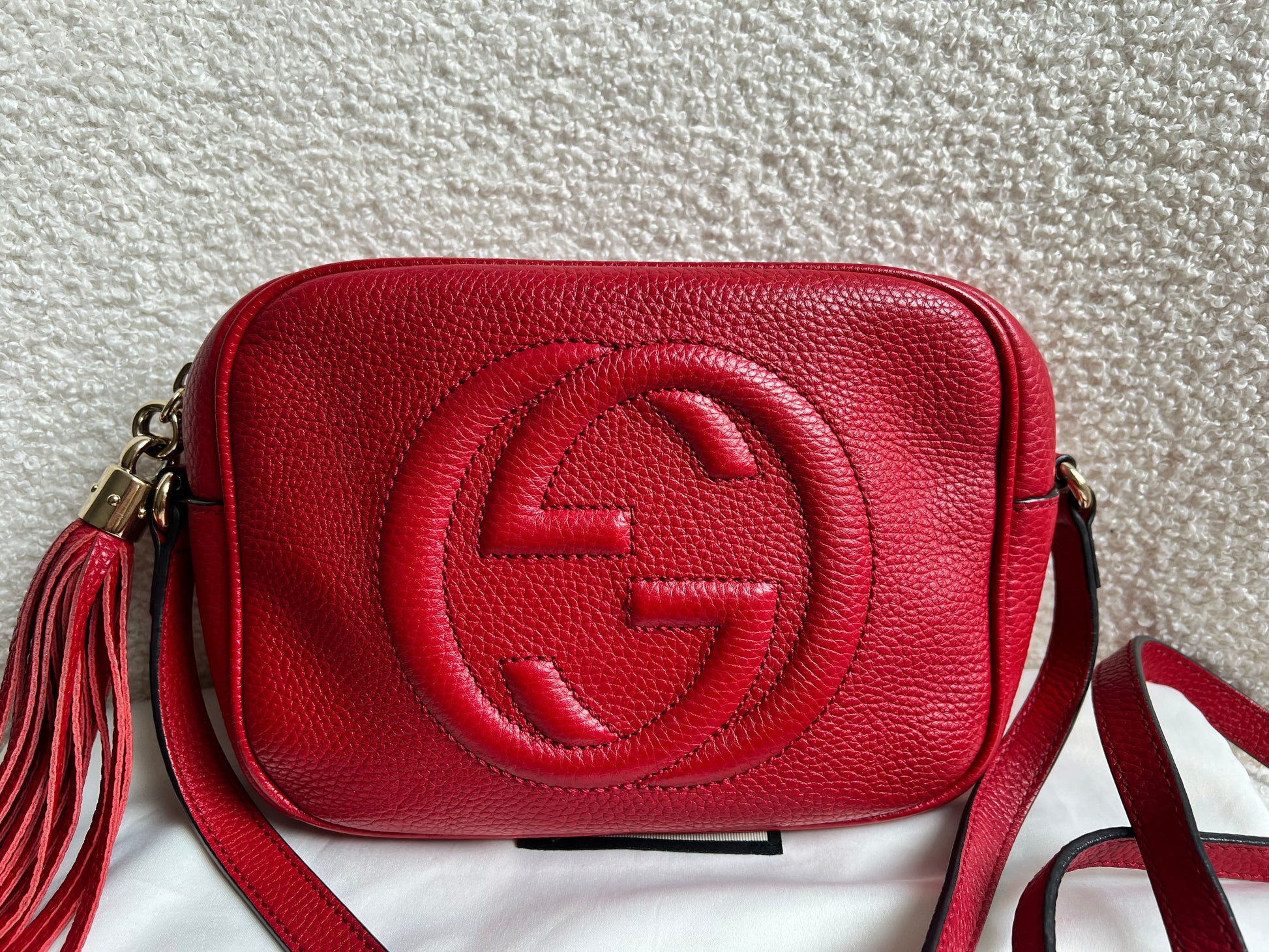 Gucci Soho Disco in Red Leather with pale gold hardware. This practical, cross body, camera style bag is compact in size but still fits a reasonable amount. Can be worn over shoulder or cross body. Gucci's most popular style and goes with any outfit, dressed up or down.