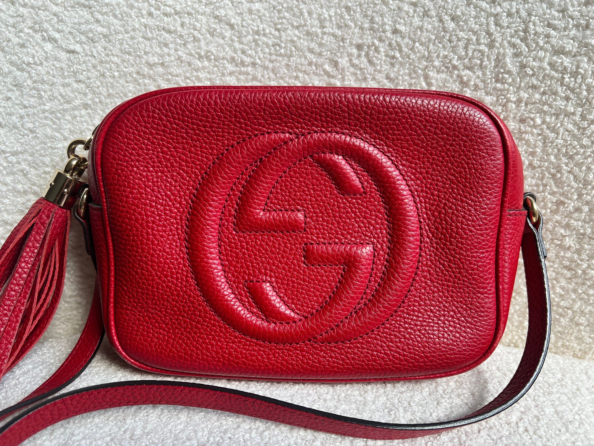 Gucci Soho Disco in Red Leather with pale gold hardware. This practical, cross body, camera style bag is compact in size but still fits a reasonable amount. Can be worn over shoulder or cross body. Gucci's most popular style and goes with any outfit, dressed up or down.