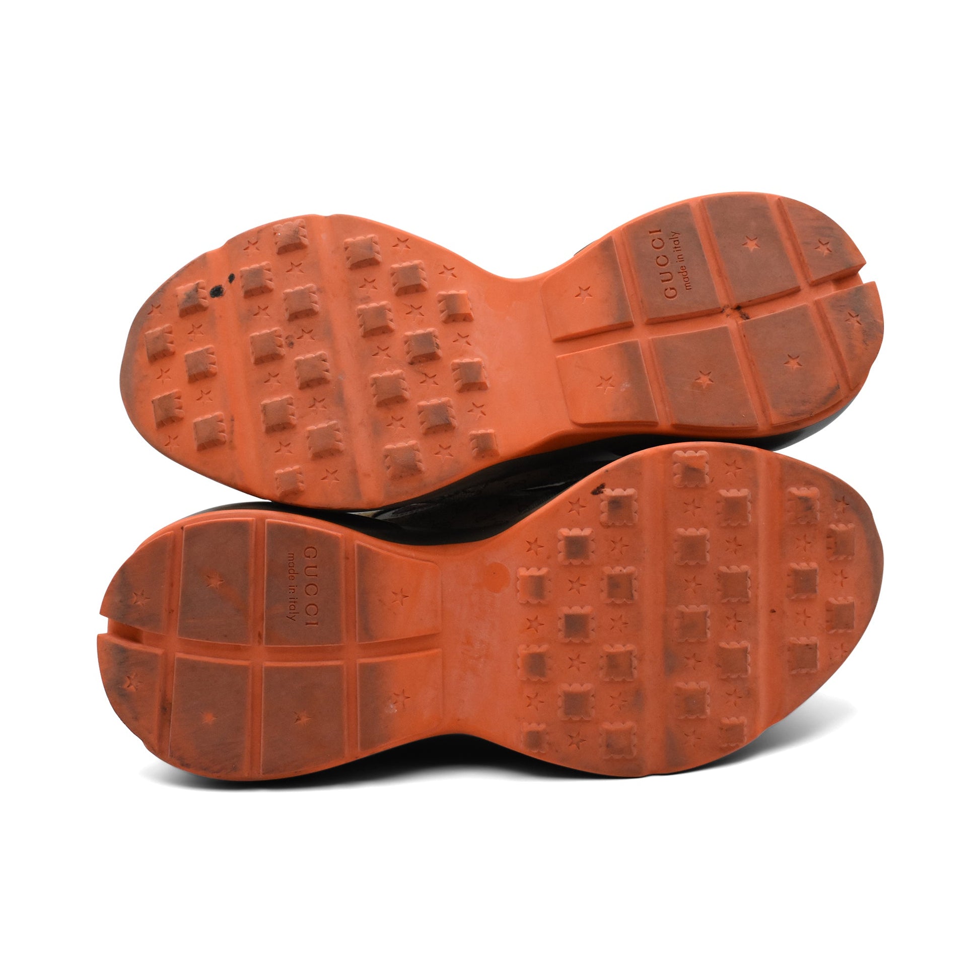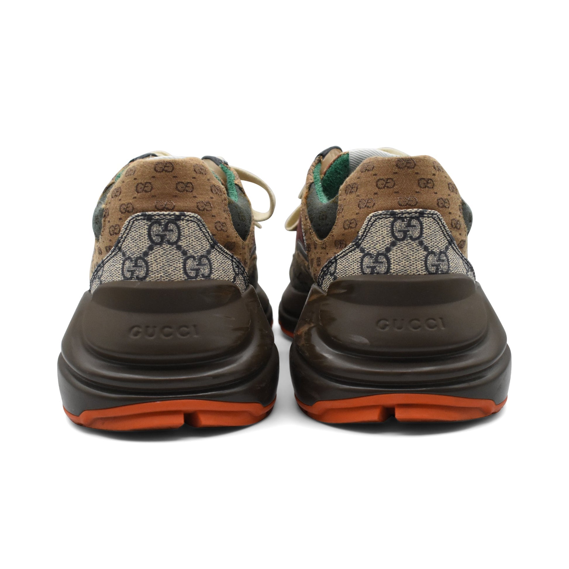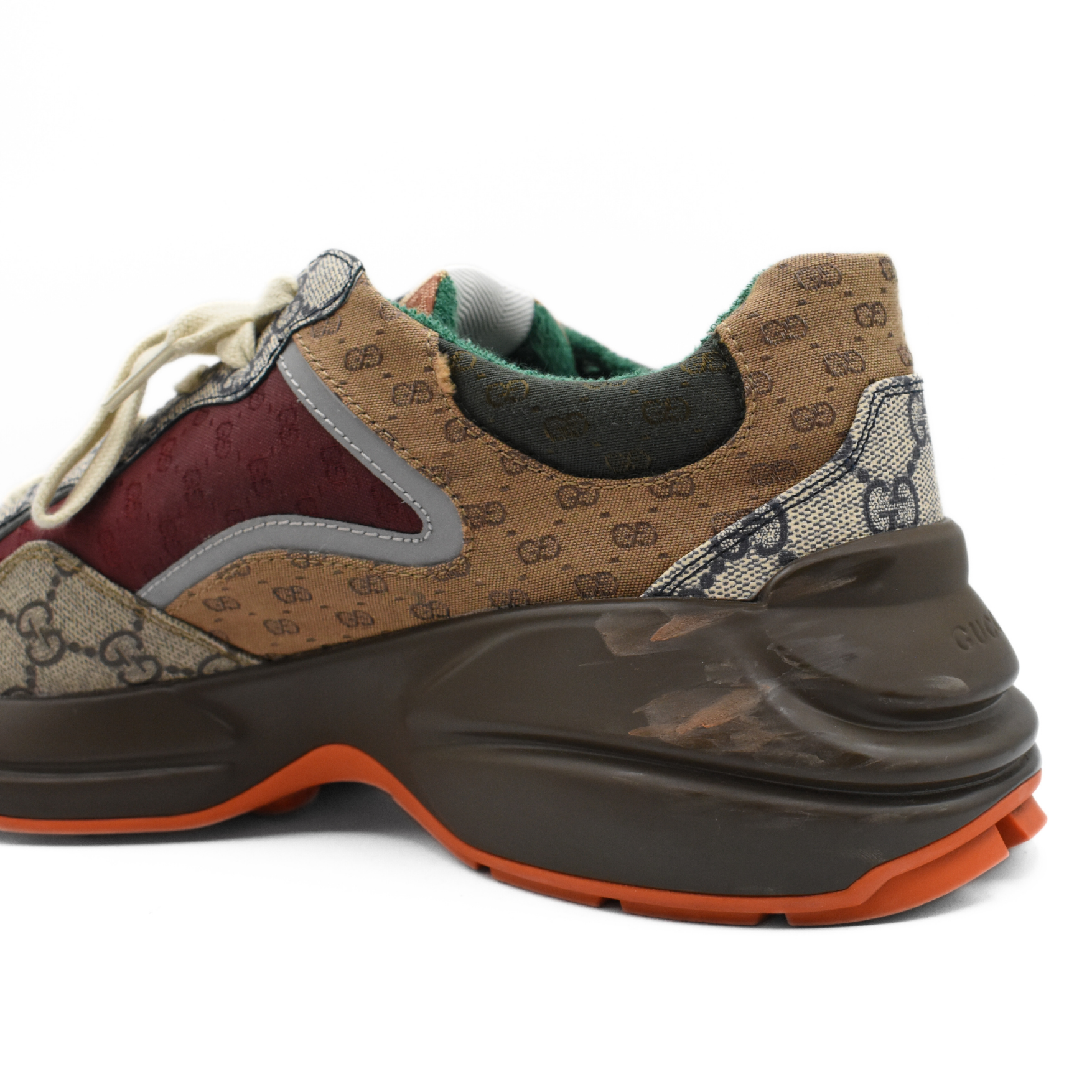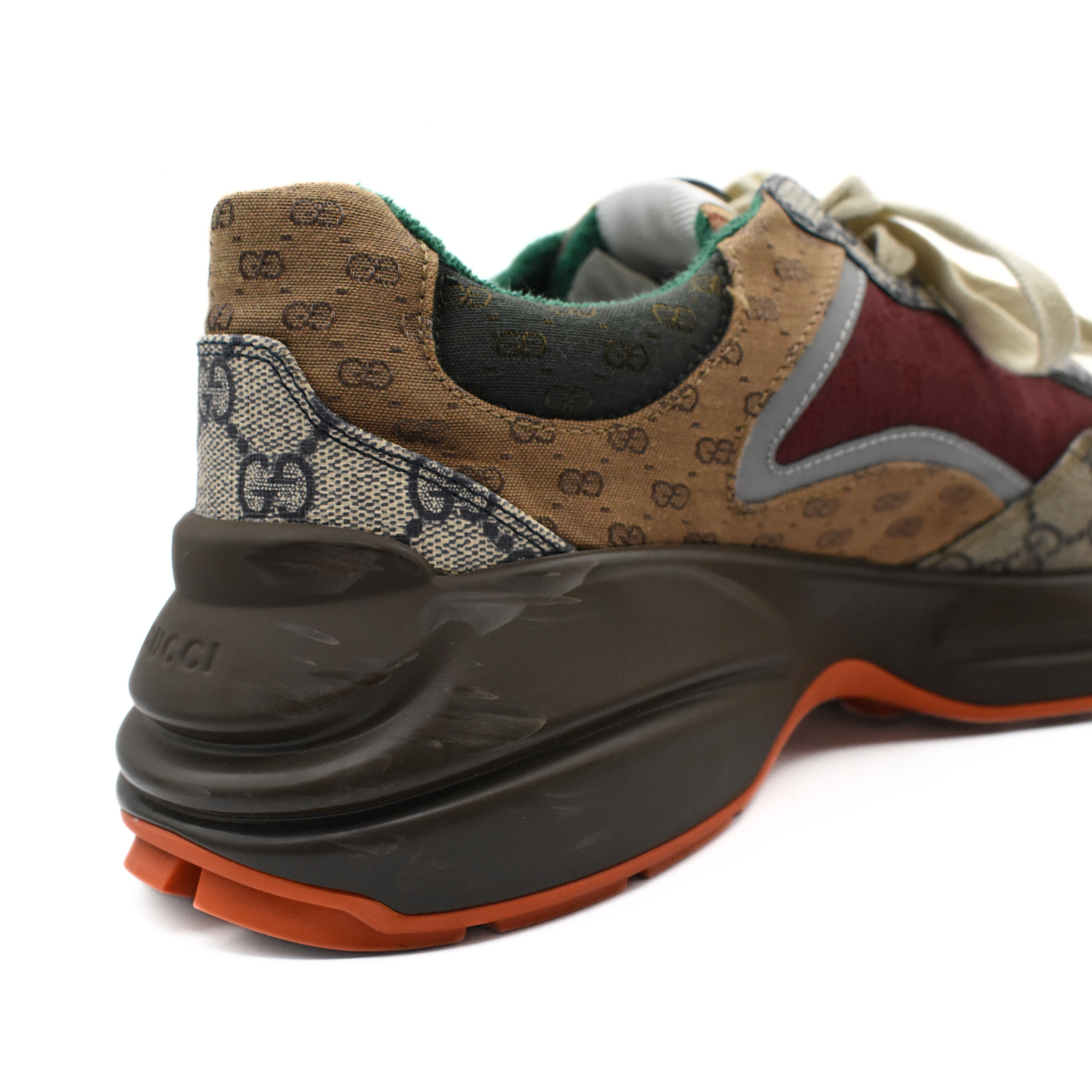Gucci 'Rython' Sneakers in multi-Gucci monogram coated canvas colour-way with reflective trim, white lace-up closure and a white logo tab on the tongue. Features a platform brown sole with an orange trim and logo embossed on the heel.