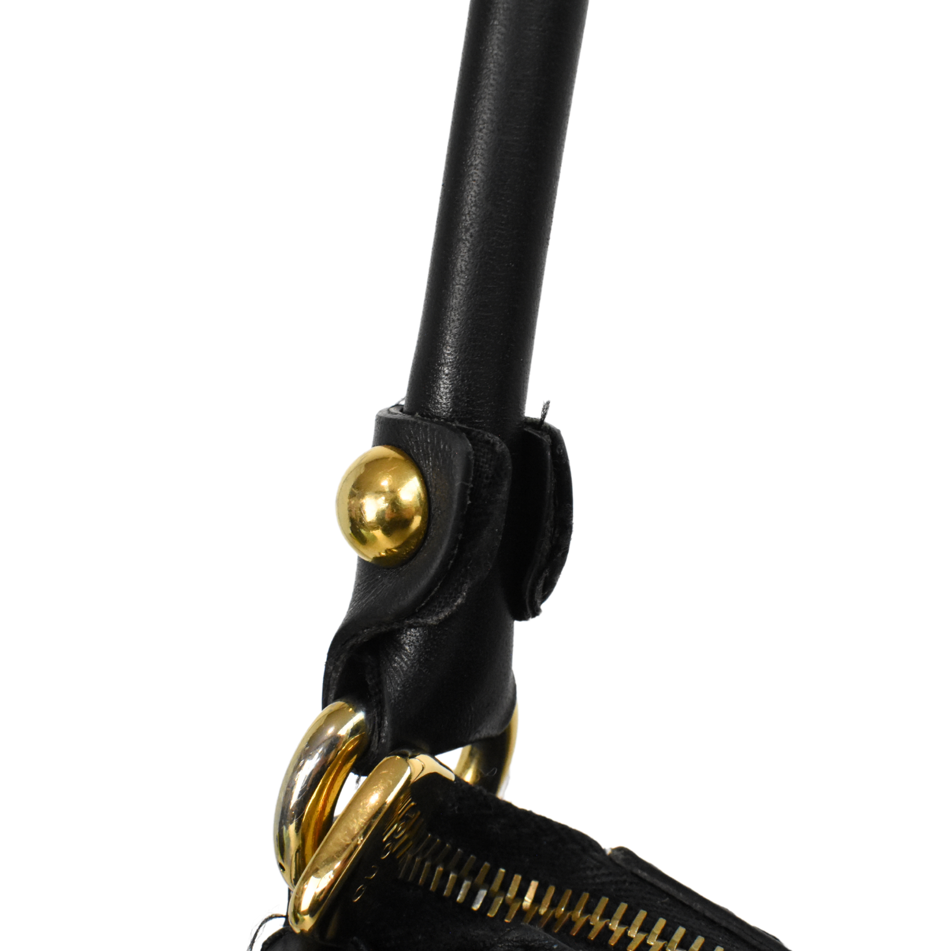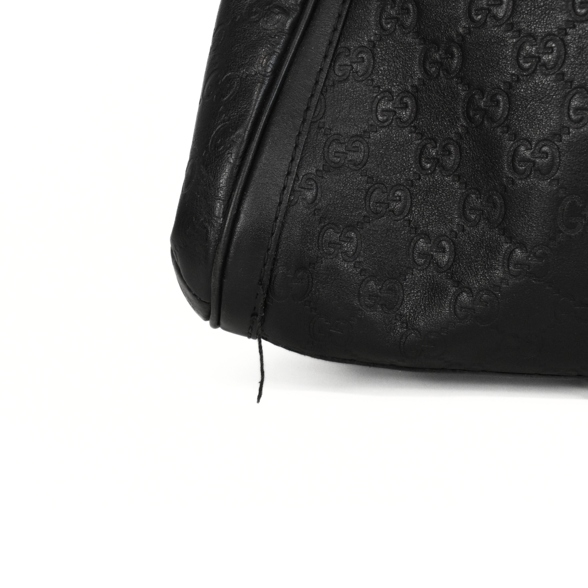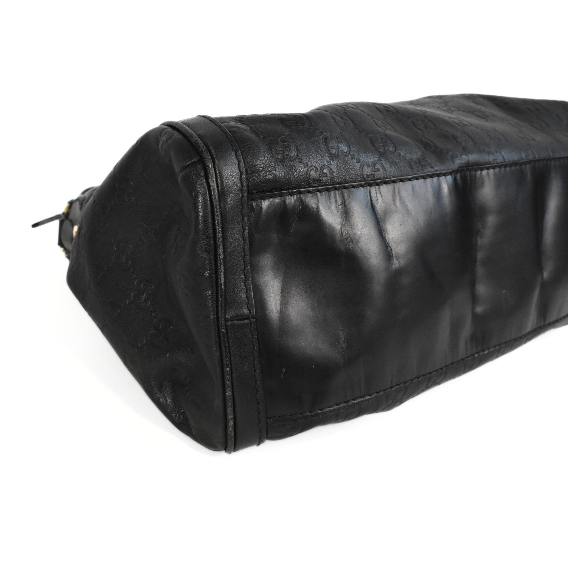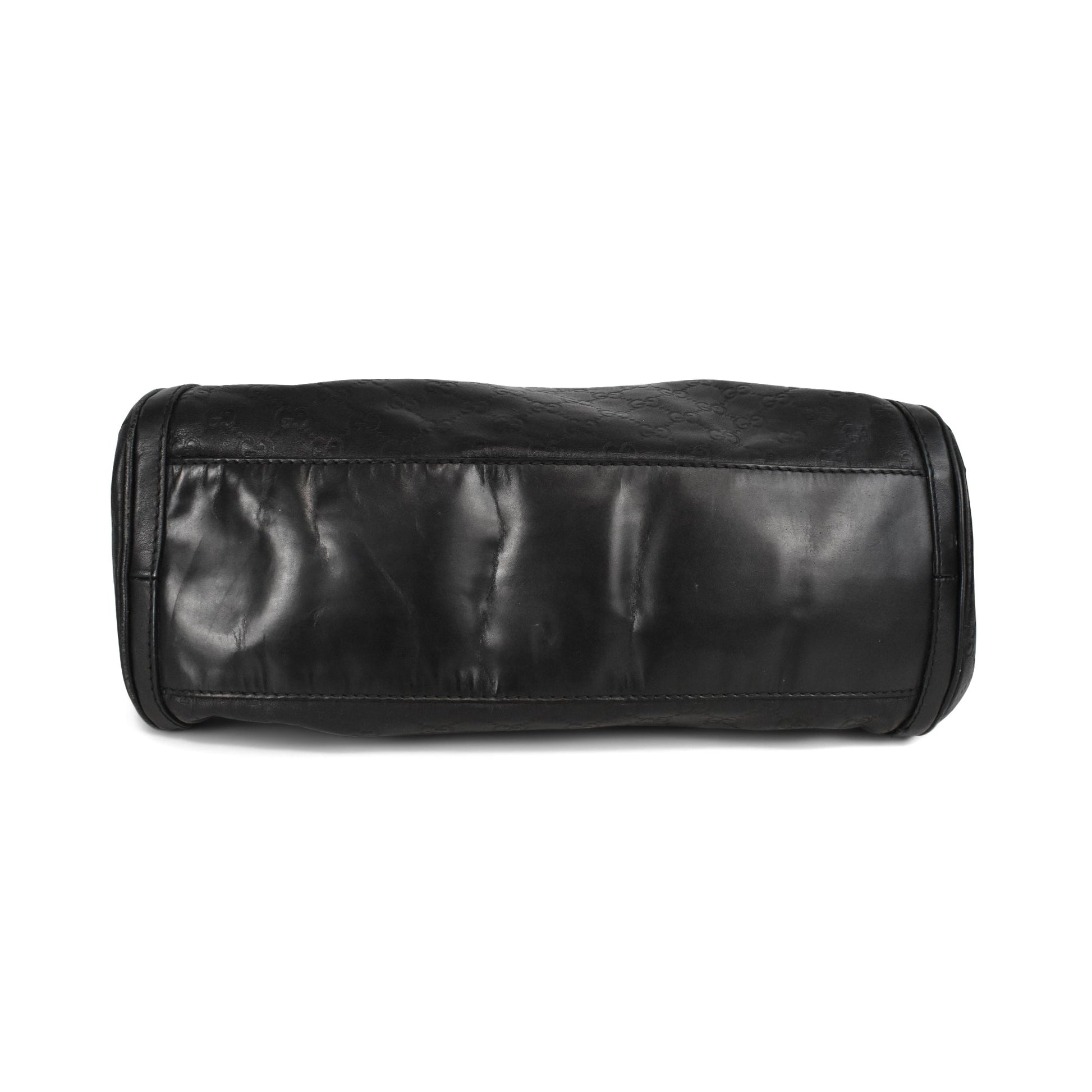 Gucci 'Scarlett' hobo shoulder bag in black Guccissima monogram embossed leather with gold hardware and interlocking bubble GG logos on the sides. Features a zip pocket with beige canvas lining and interior slip and zip pockets.