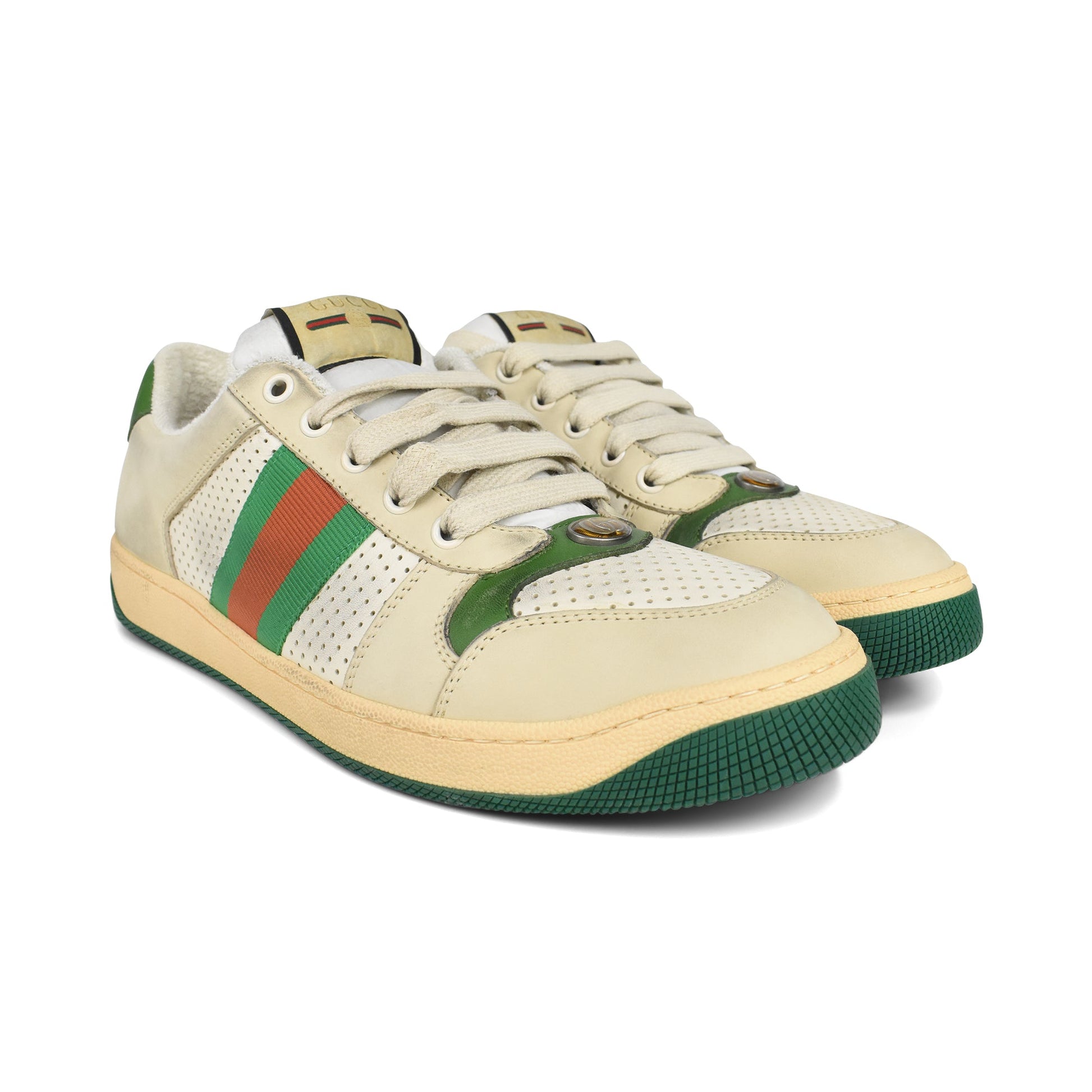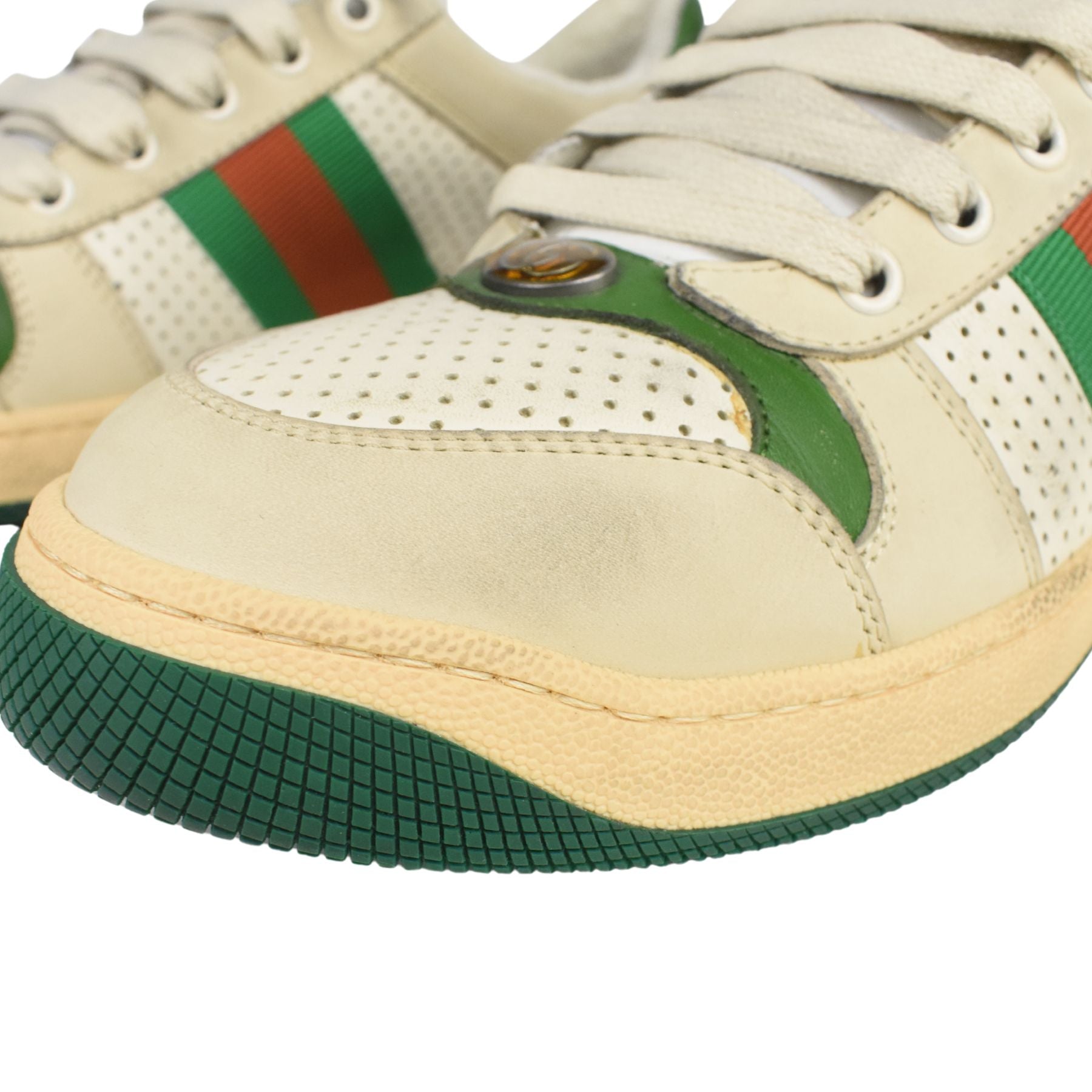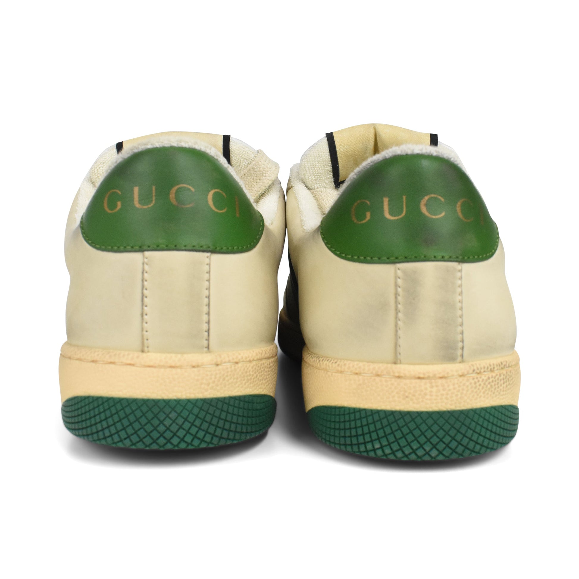 Gucci 'Screener' low-top sneakers in off-white and green leather with a beige and green rubber sole. Features colour distressing throughout shoe, green and red racing canvas racing stripes on the sides, gold and silver enamel filled logo on the toe, wide flat cream laces, gold foil logo on the heels, logo tab on the tongue, and white terry-cloth lined interior.
