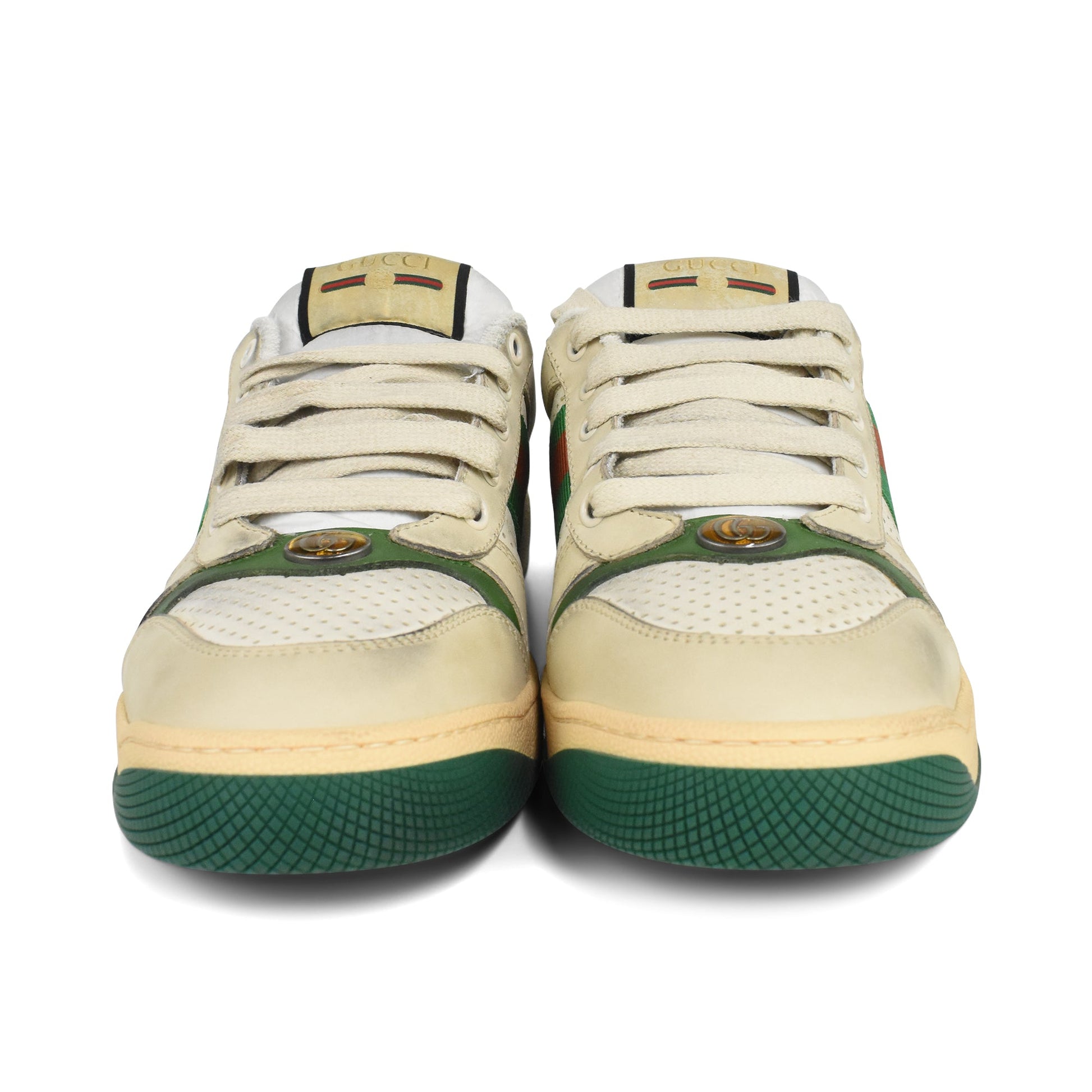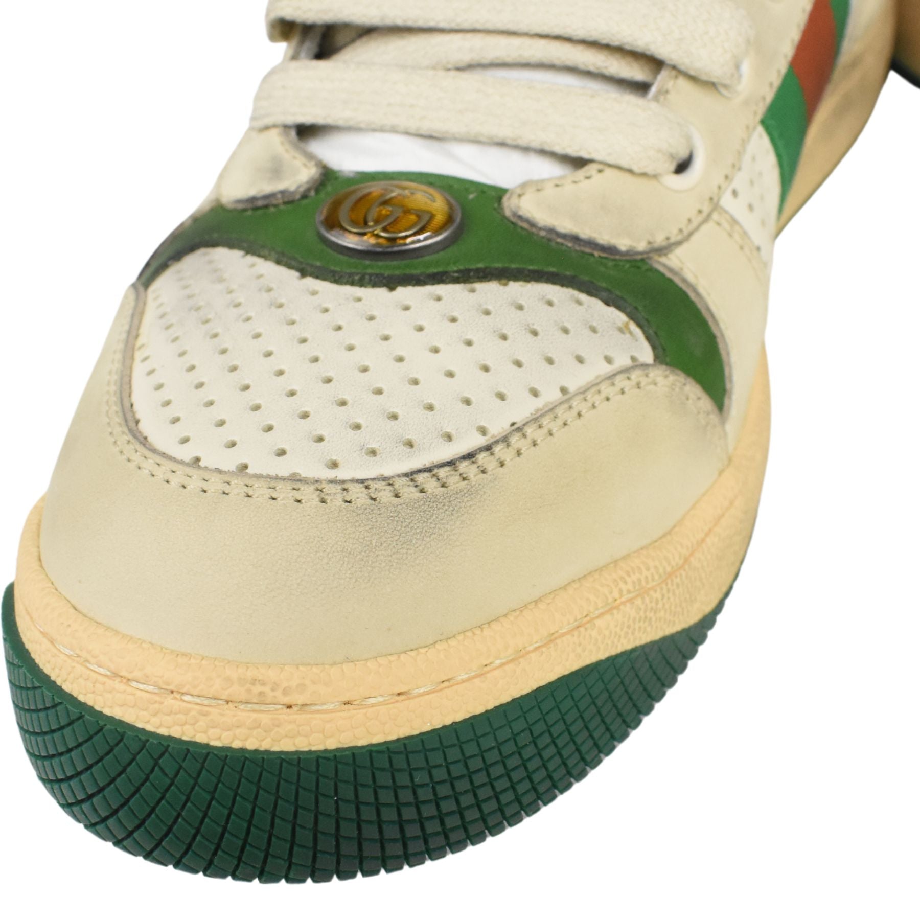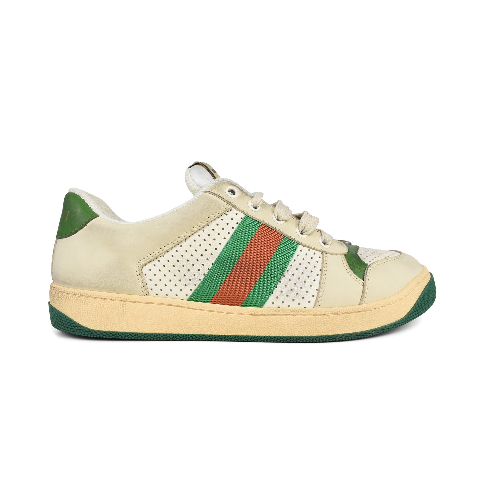 Gucci 'Screener' low-top sneakers in off-white and green leather with a beige and green rubber sole. Features colour distressing throughout shoe, green and red racing canvas racing stripes on the sides, gold and silver enamel filled logo on the toe, wide flat cream laces, gold foil logo on the heels, logo tab on the tongue, and white terry-cloth lined interior.