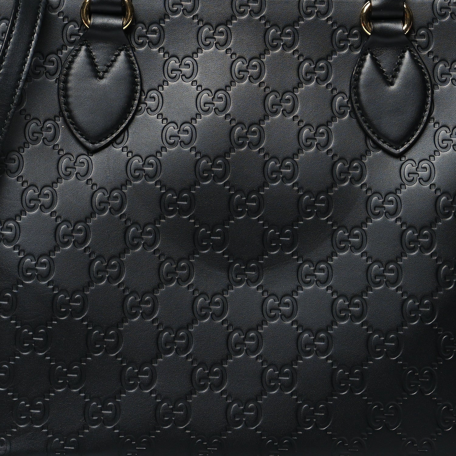 This Gucci Signature Convertible Tote Guccissima Leather crafted from black Guccissima leather, features dual-rolled leather handles, an optional strap and brass hardware, protective base studs, and gold-tone hardware. Its zip closure opens to a neutral microfiber interior with a zip pocket.