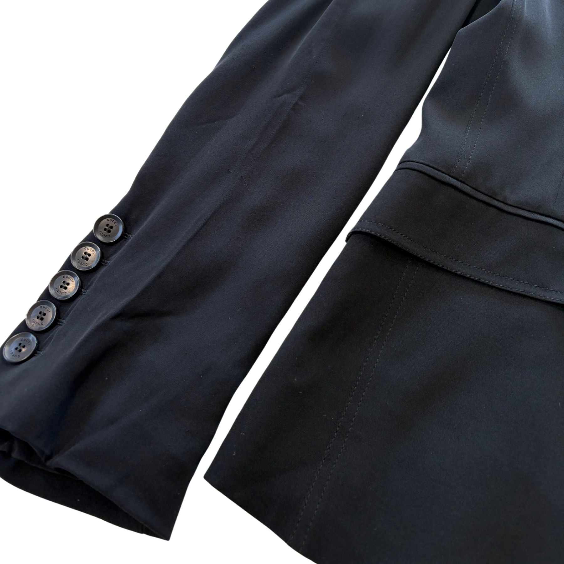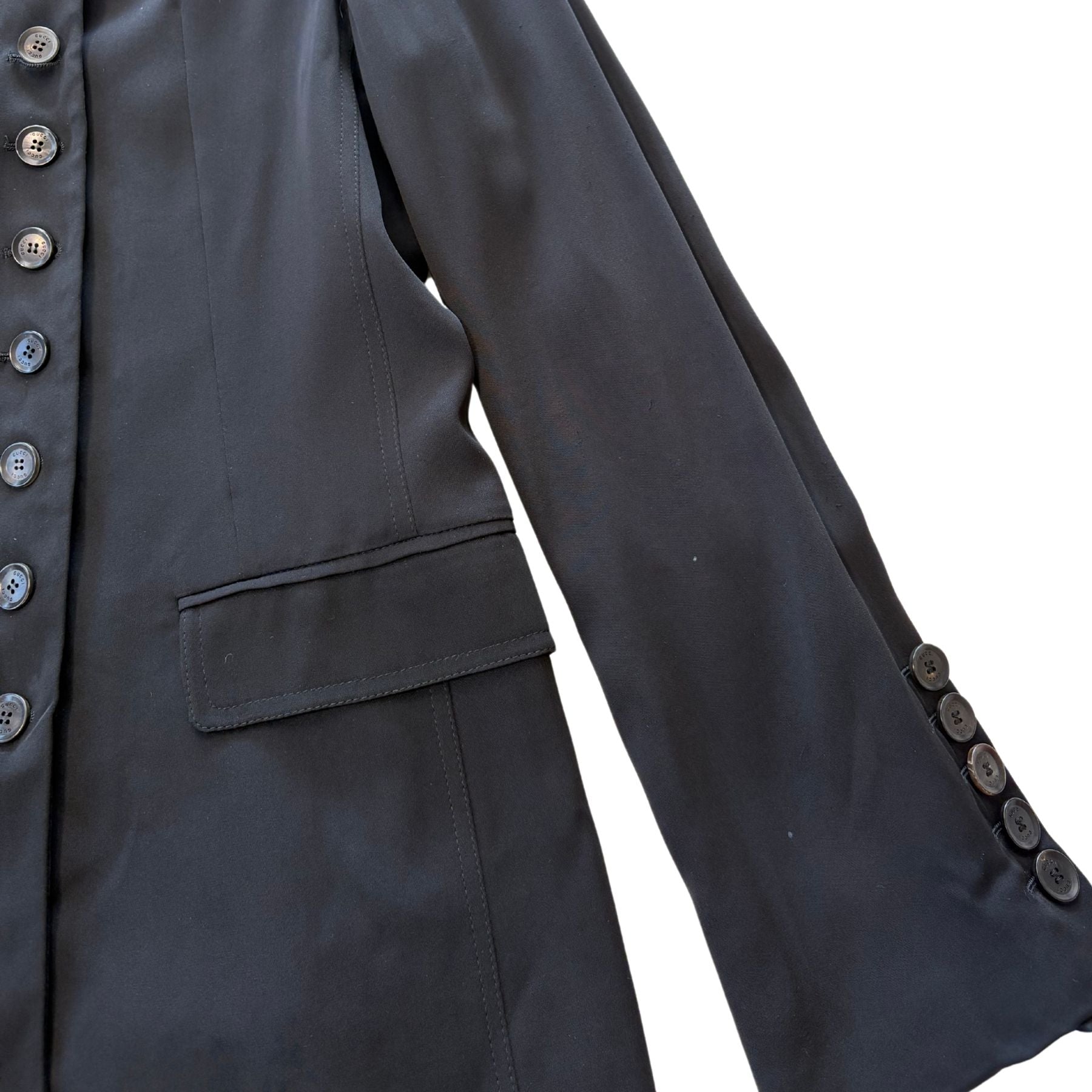 Gucci light-weight blazer in black silk with a military style double breasted button closure, faux front pockets, padded shoulders, and a raised collar.