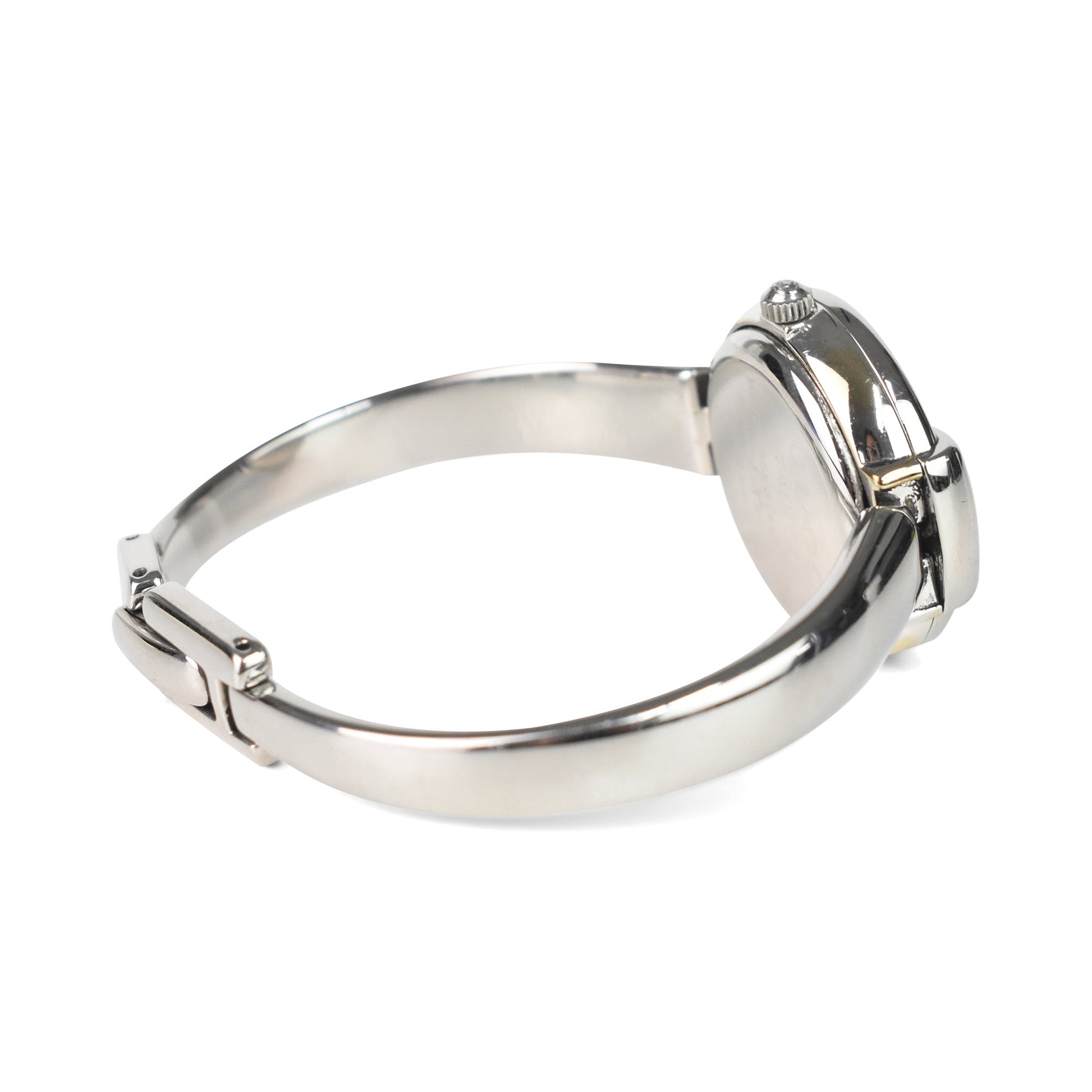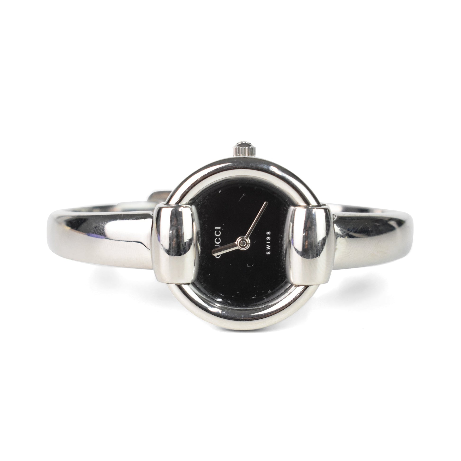 Gucci Vintage Watch with a round black face, silver dial and a horse-bit detail band. Features a clasp closure.