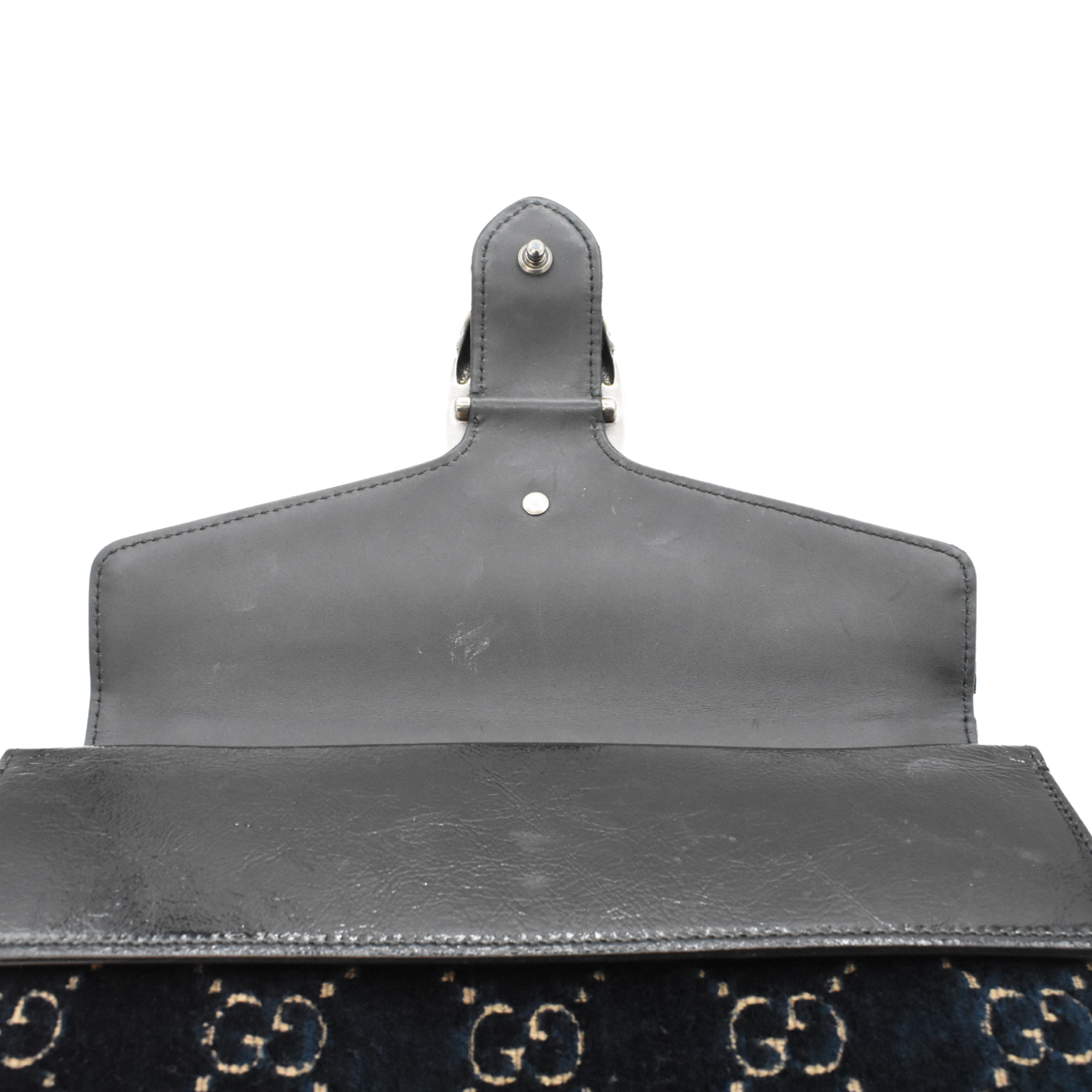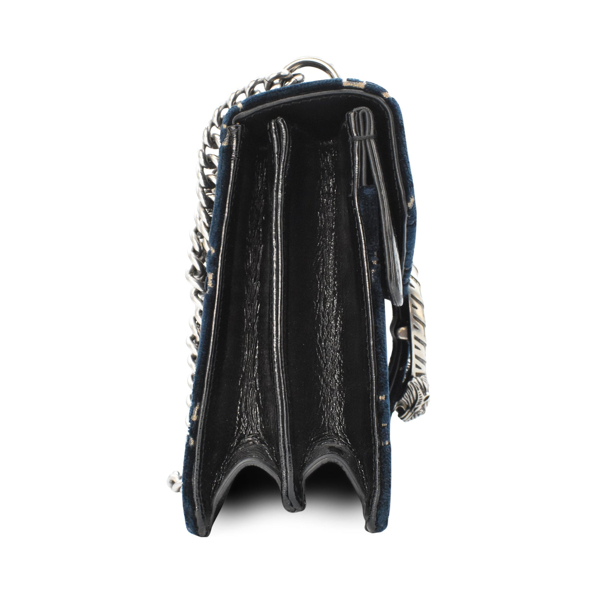 Gucci 'Small Dionysus Velvet' flap bag in navy blue velour with gold GG Supreme monogram embroidery and glazed black leather accents. Features a horseshoe buckle with dragon heads in aged silver concealing a pushlock closure. The accordion style interior is lined with blush pink suede and divided into two section with a zip pocket.