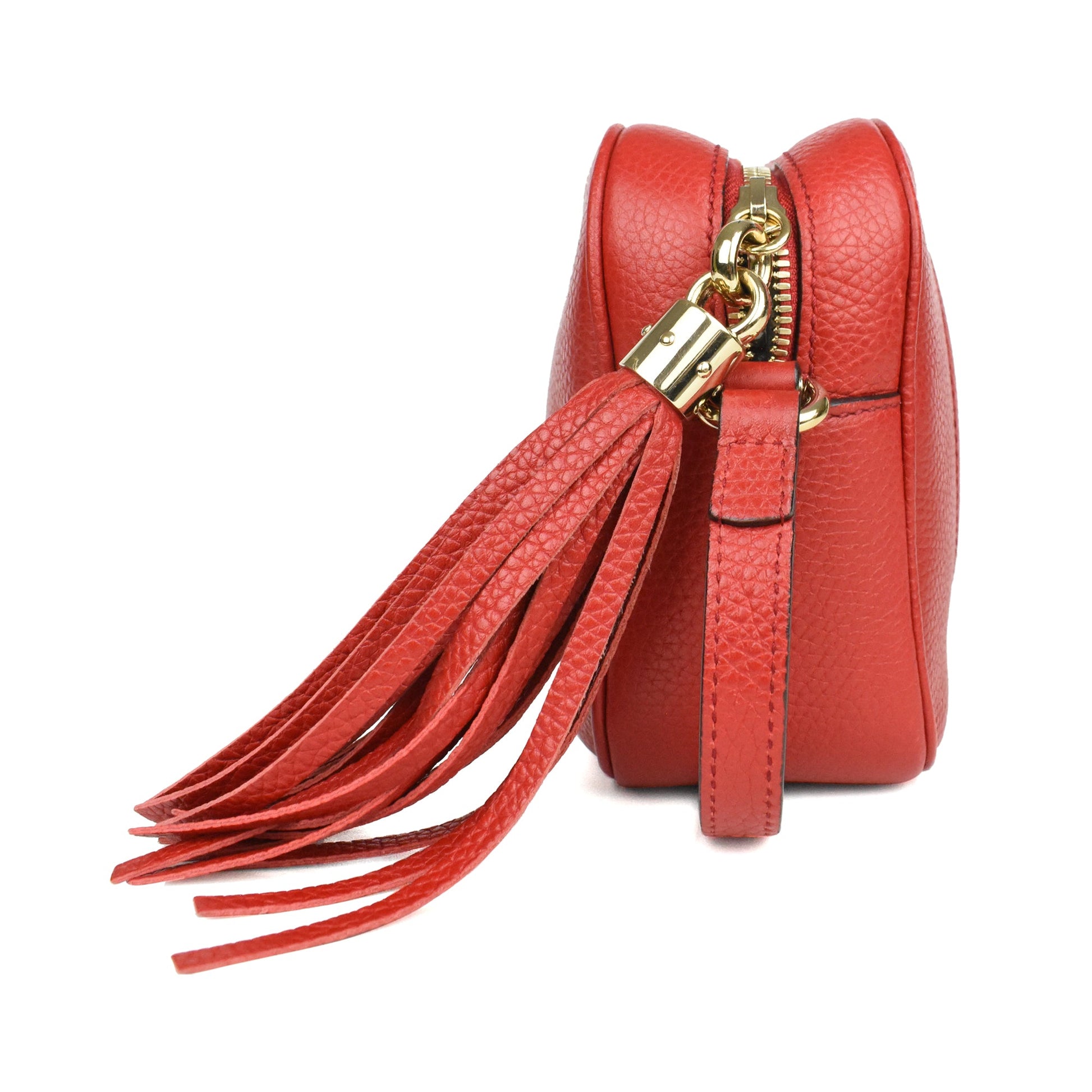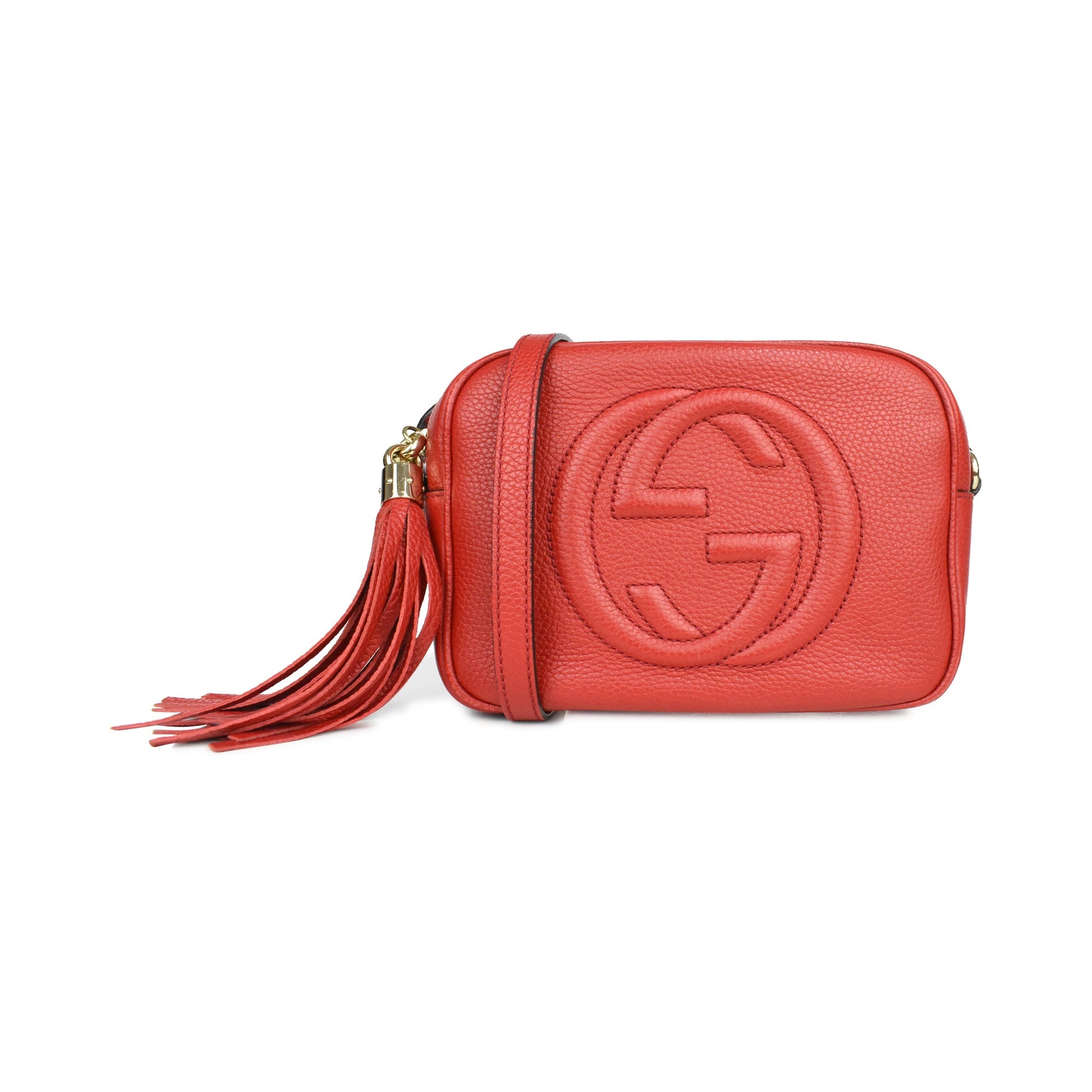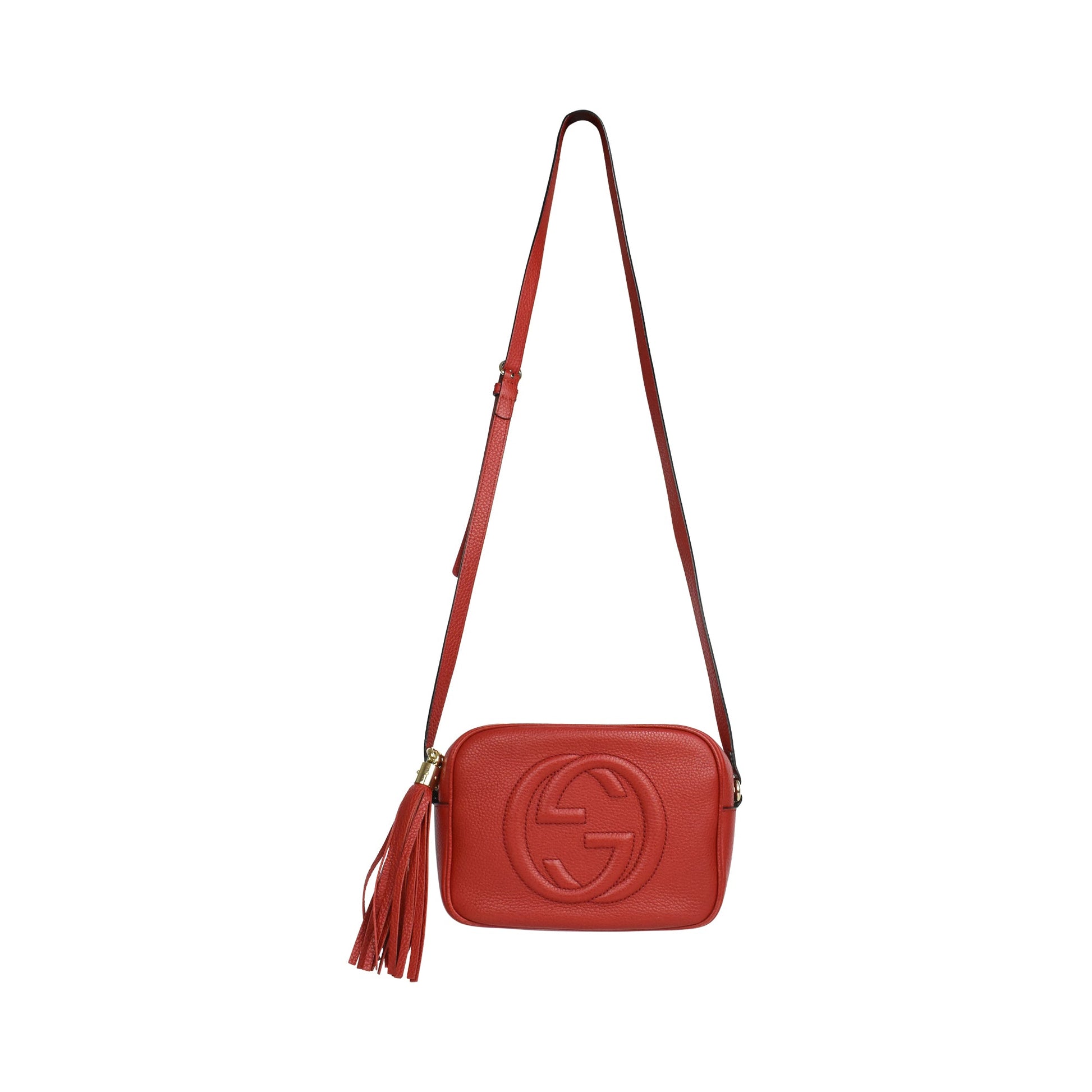 Gucci 'Soho' camera bag in red pebbled leather with soft gold hardware. Features a large GG logo on the front, an adjustable leather long strap, a top zip closure, and large tassel zipper pull. The interior is canvas-lined and has a slip pocket.