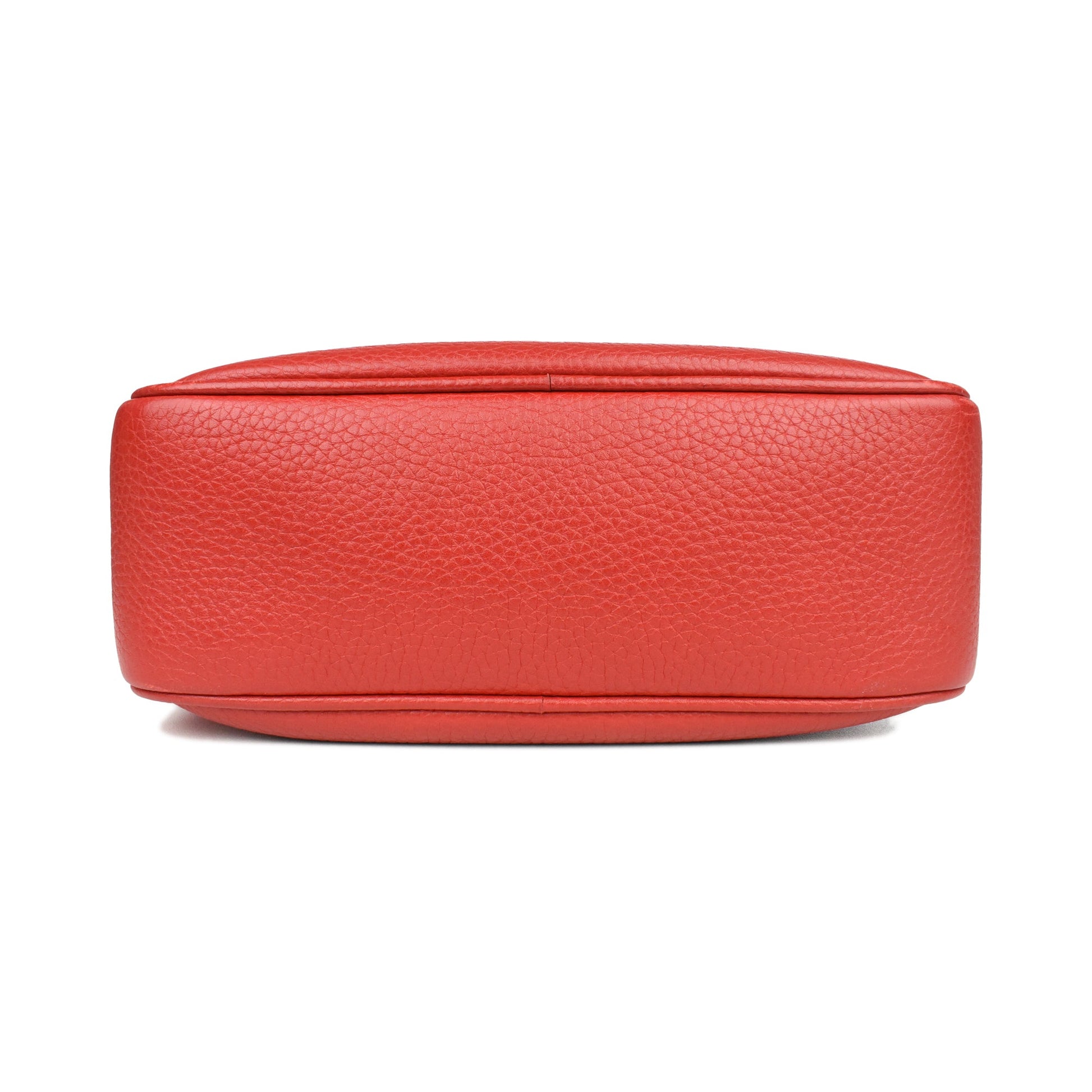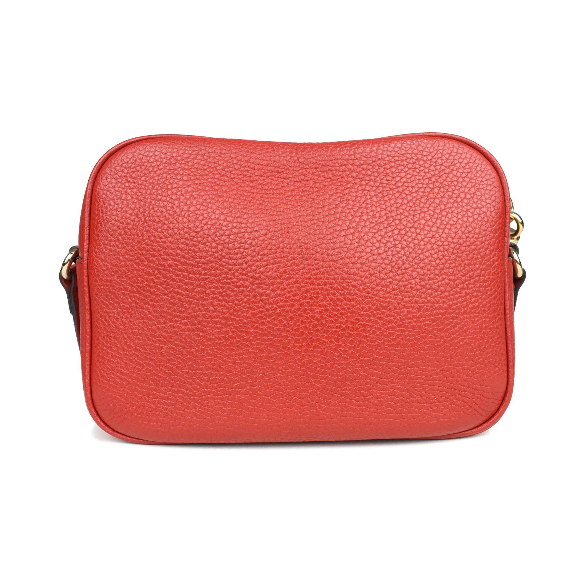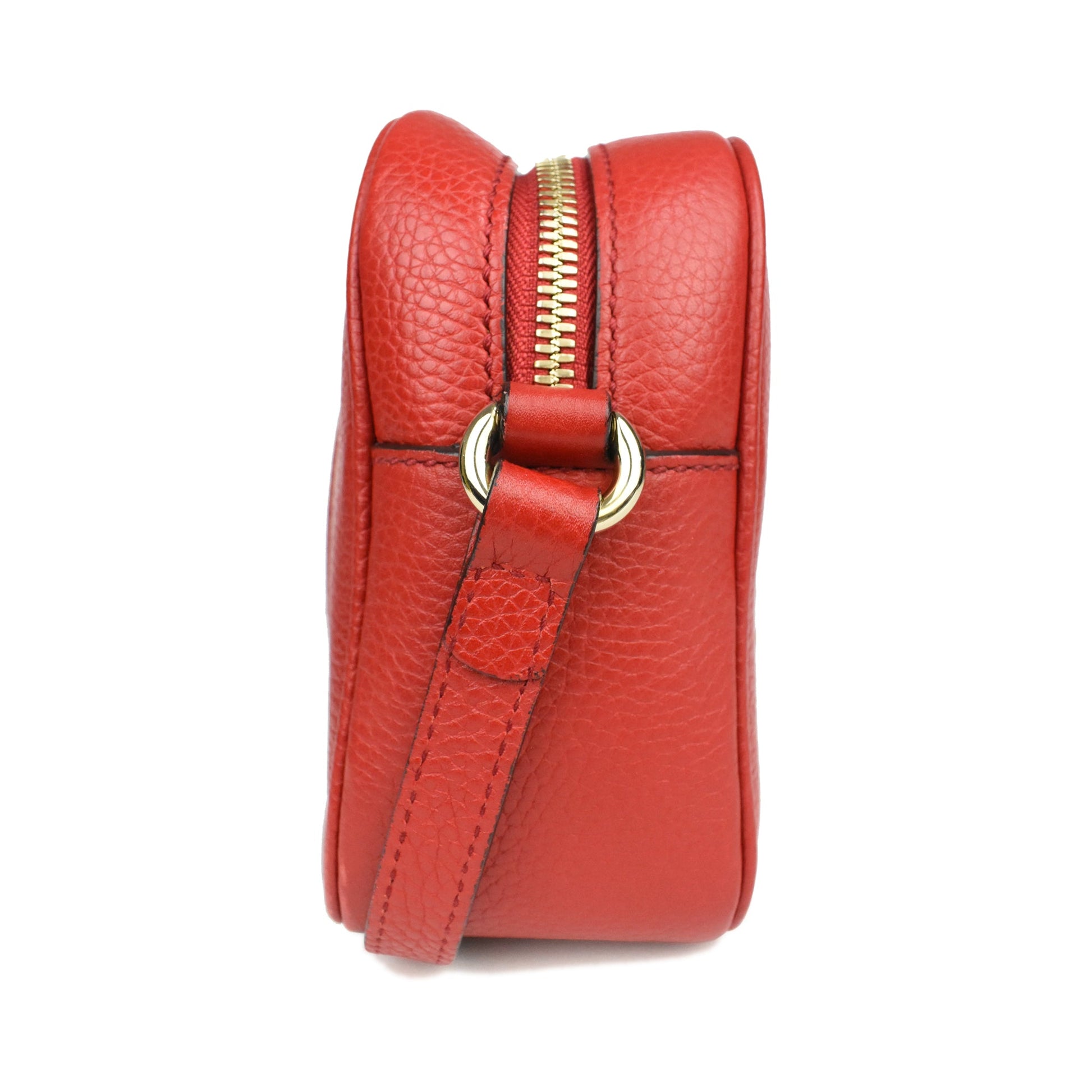 Gucci 'Soho' camera bag in red pebbled leather with soft gold hardware. Features a large GG logo on the front, an adjustable leather long strap, a top zip closure, and large tassel zipper pull. The interior is canvas-lined and has a slip pocket.