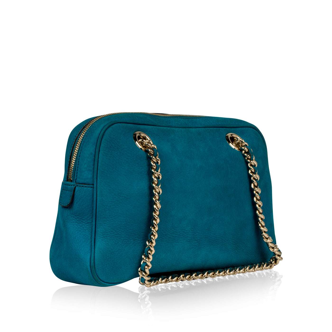 Carefully crafted from bright teal nubuck leather, the Gucci Soho chain tote is the ideal accessory for the modern woman with a love for luxury. If you're looking for an every day bag with a hint of glamour, look no further. This bag is sleek, sophisticated and luxurious but playful and fun at the same time given its bright hue. Embossed with Gucci's GG stitched logo and interwoven chain / leather strap, the Soho tote is the perfect accessory to accompany you throughout your day. Featuring a fringe leather tassel for added detail, the Soho can hold all your every day essentials in style. Wear this piece with jeans and a basic tee for casual days running errands, or glam it up with a pair of black trousers and a silk blouse for smarter occasions. Wherever your day might take you, you'll know that you'll always remain chic with your trusted Soho tote by your side.