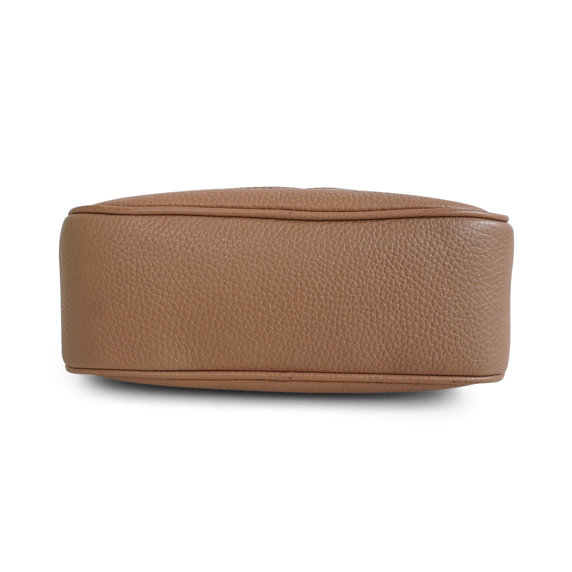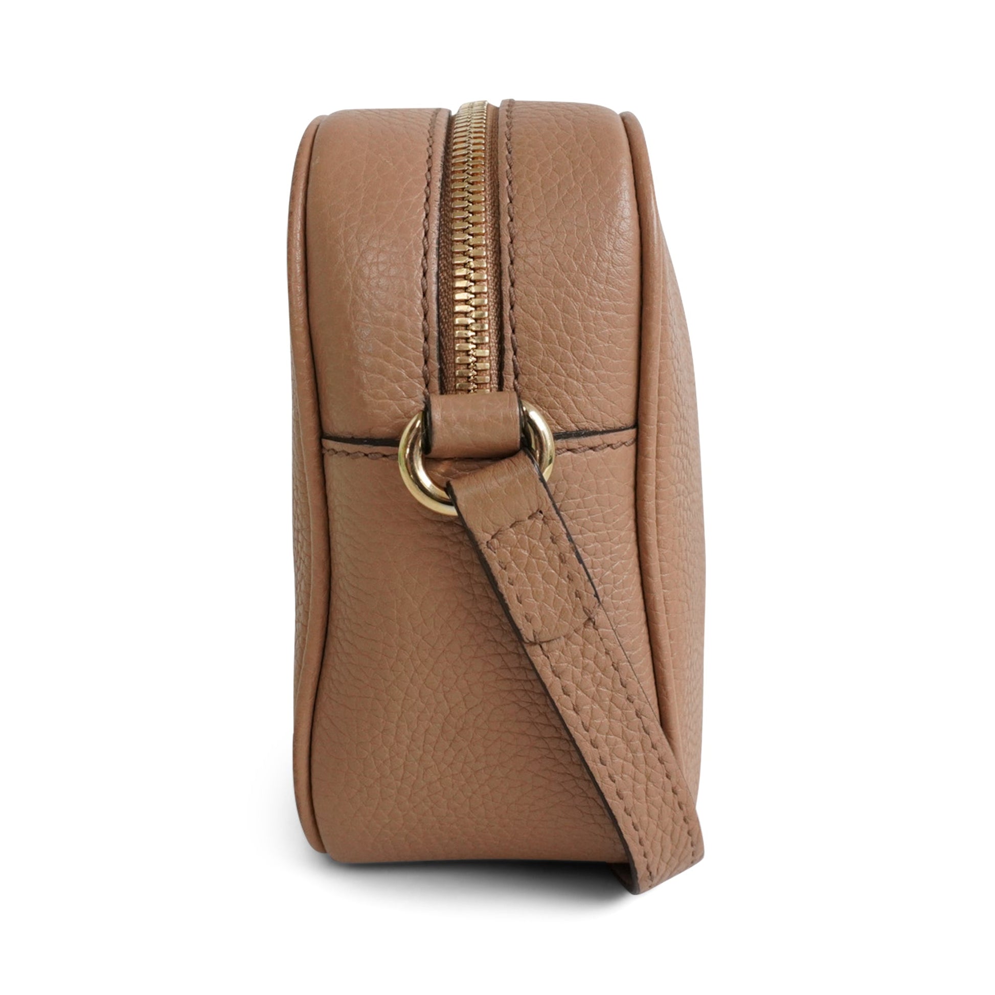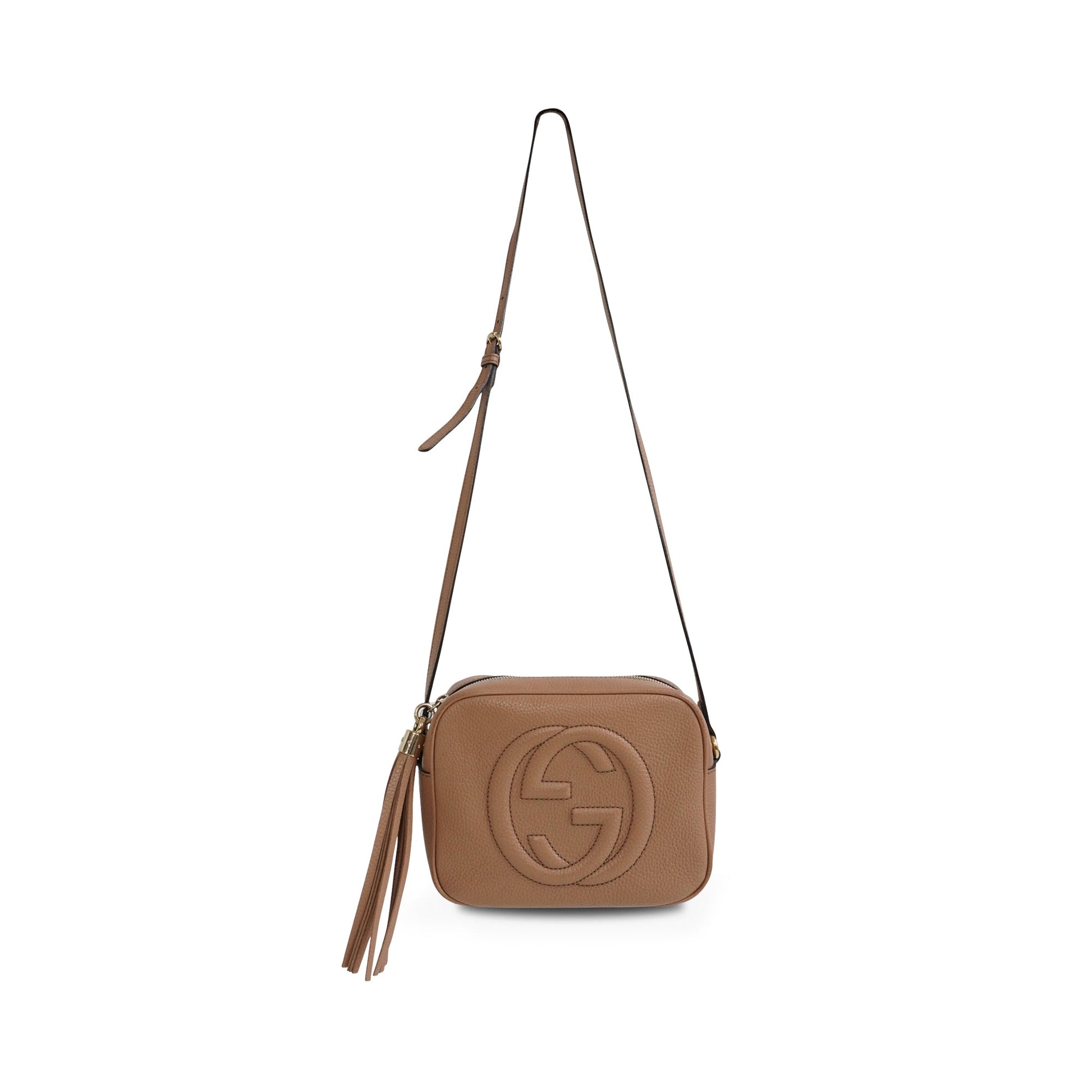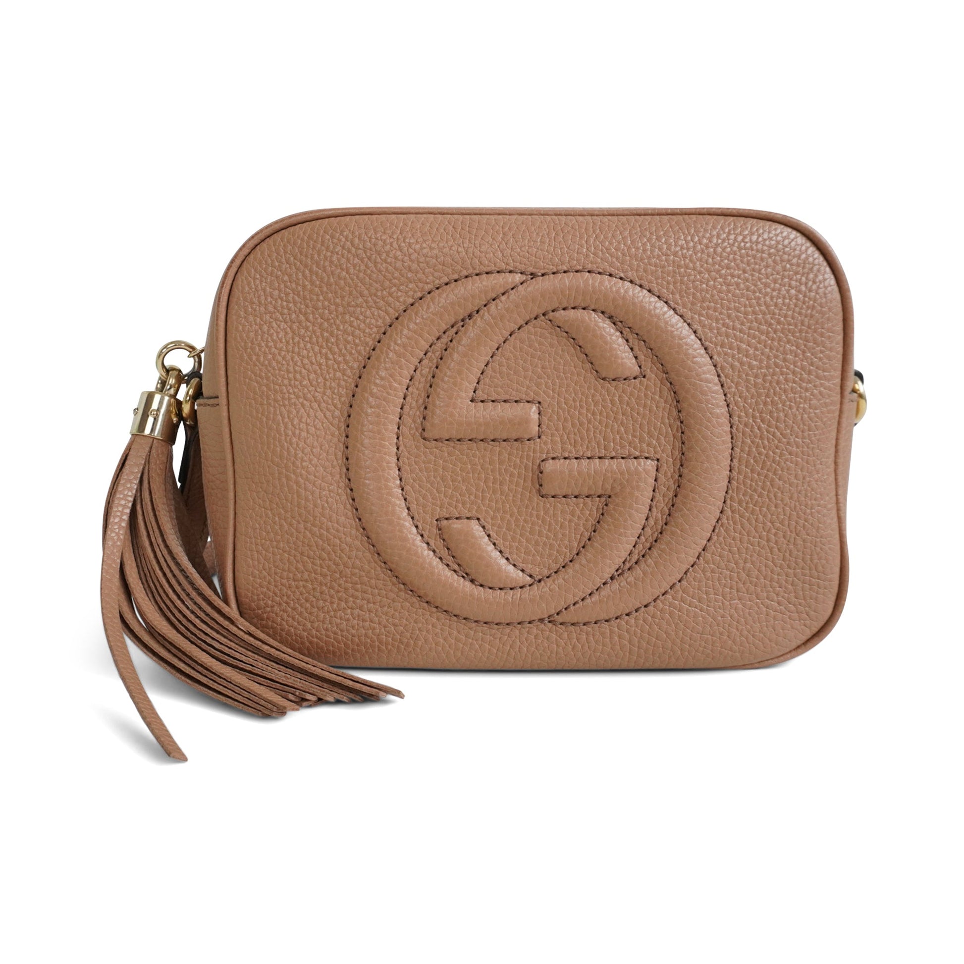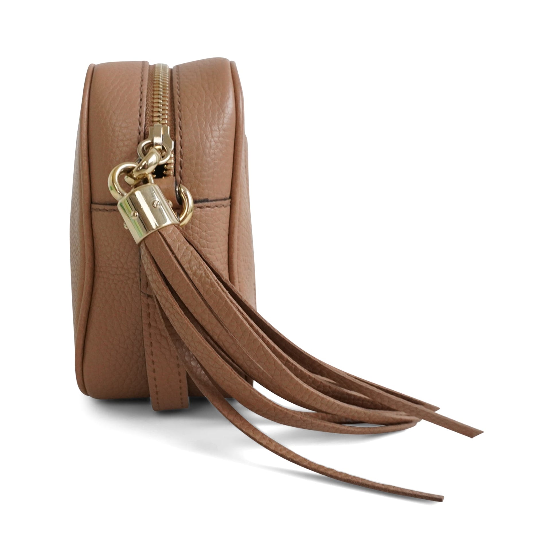 Gucci 'Soho Disco' crossbody camera bag in tan grained leather with interlocking GG logo embroidery on the front and gold hardware. Features a single zip pocket with large tassel zipper pull. The bag is lined with cream canvas and has two slip pockets.