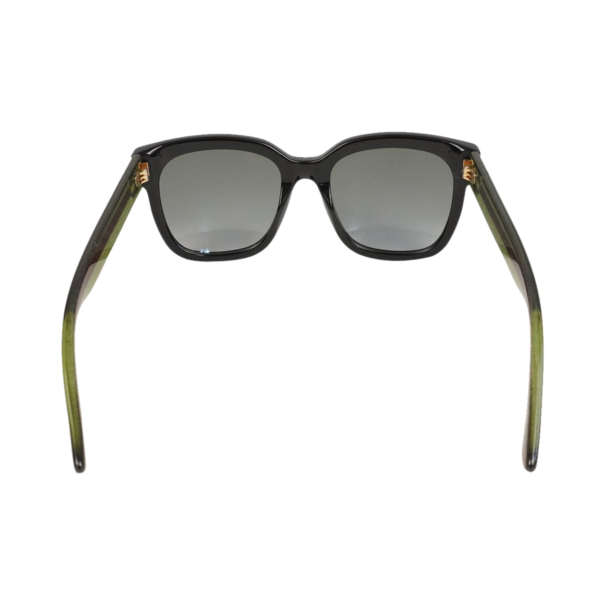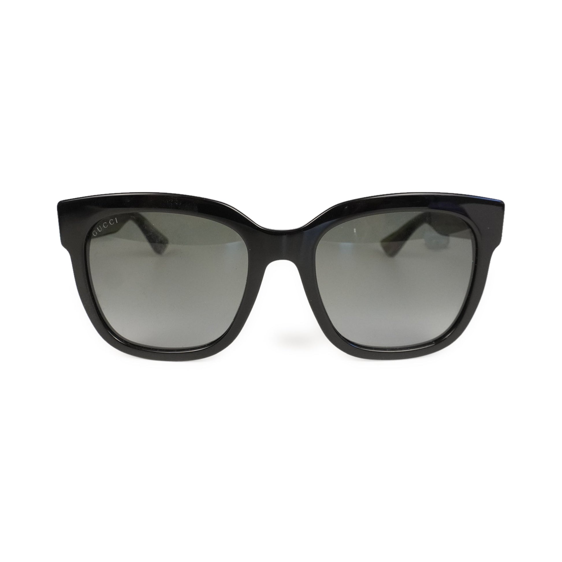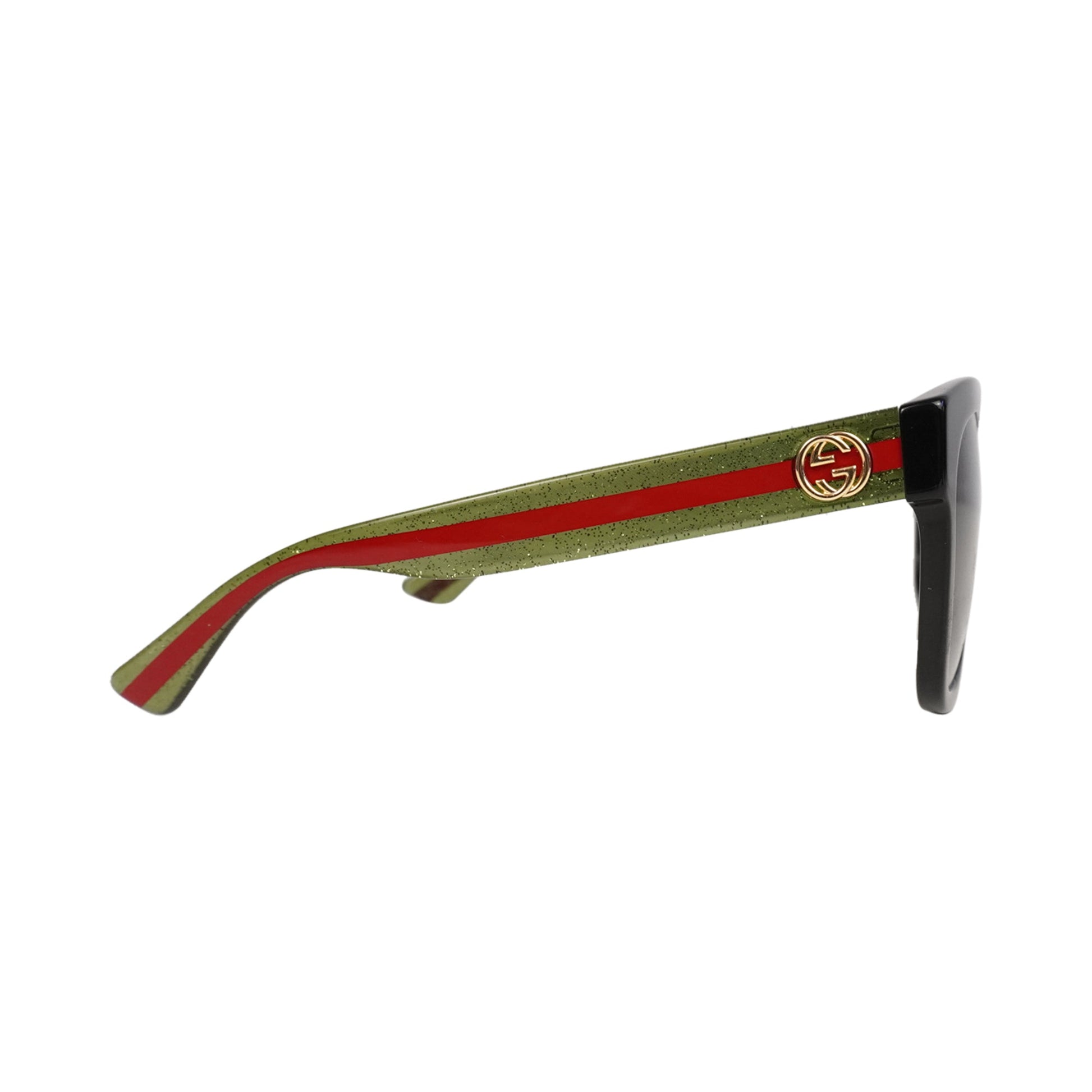 Gucci square sunglasses in black acetate frames with dark lenses. Features green and red sparkly racing stripe arms with gold hardware logos.