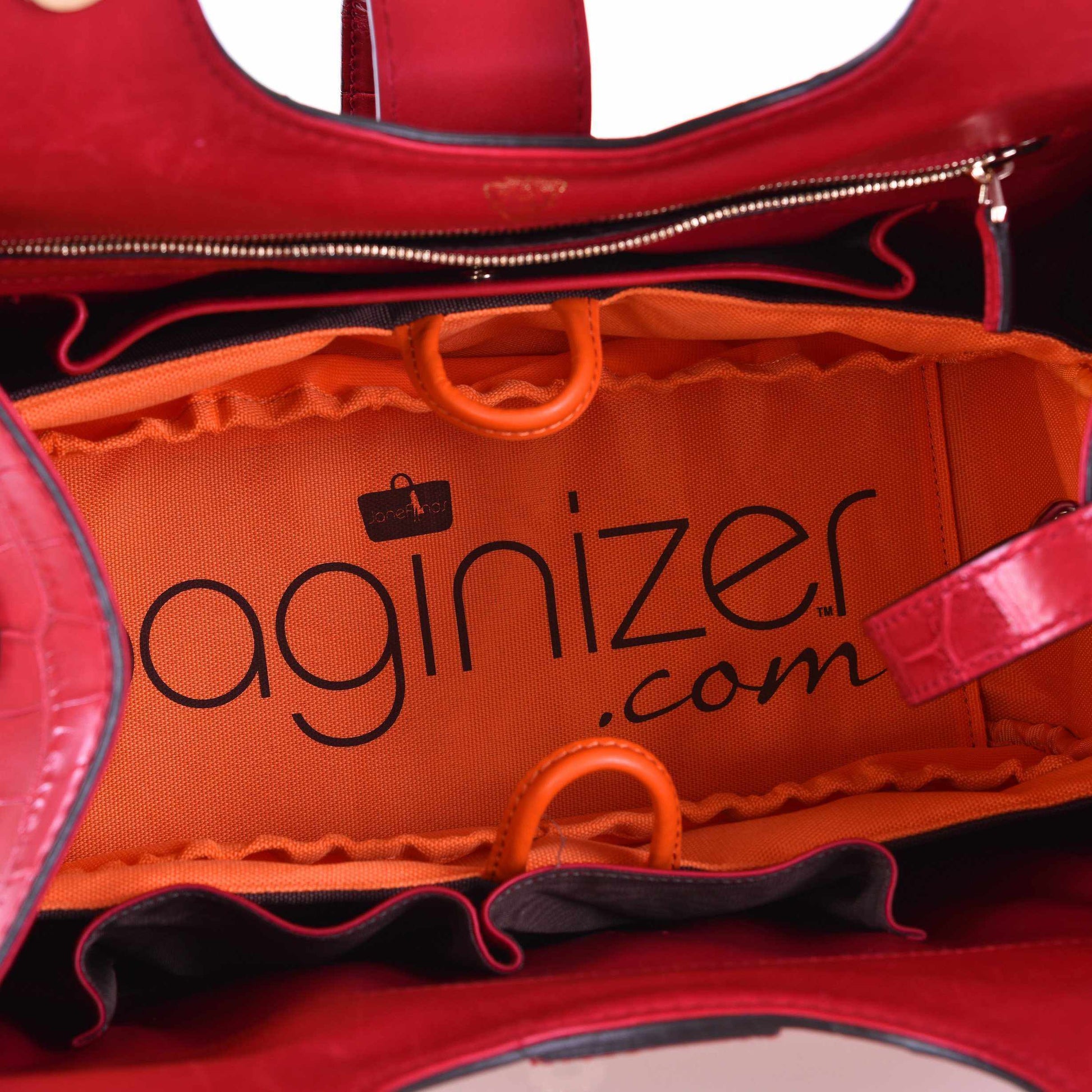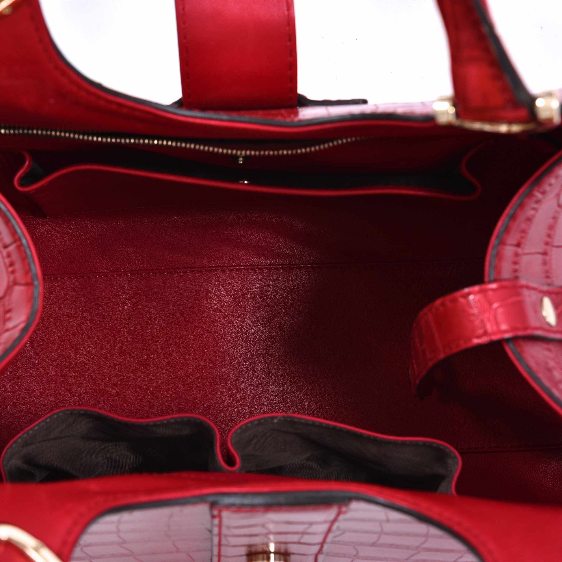 The design features a double-handle structure in the same striking red crocodile leather, offering a 5" drop, ensuring comfortable carriage. The handles are accented with small spur hardware, providing an additional touch of luxury.