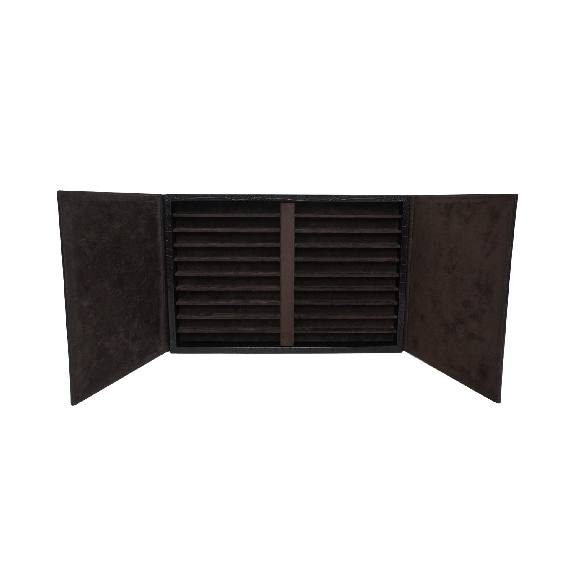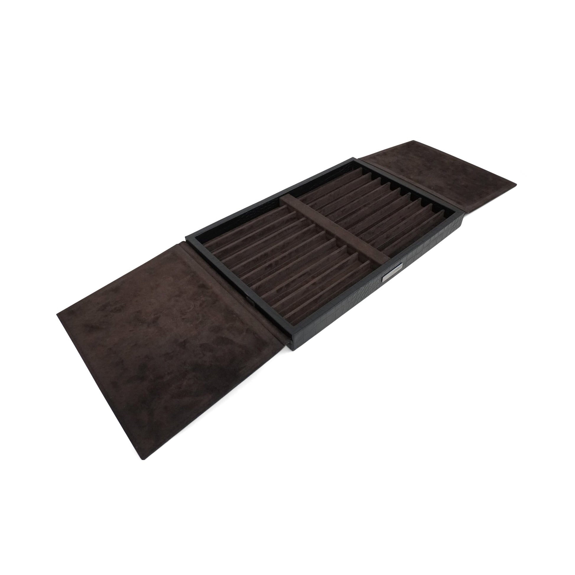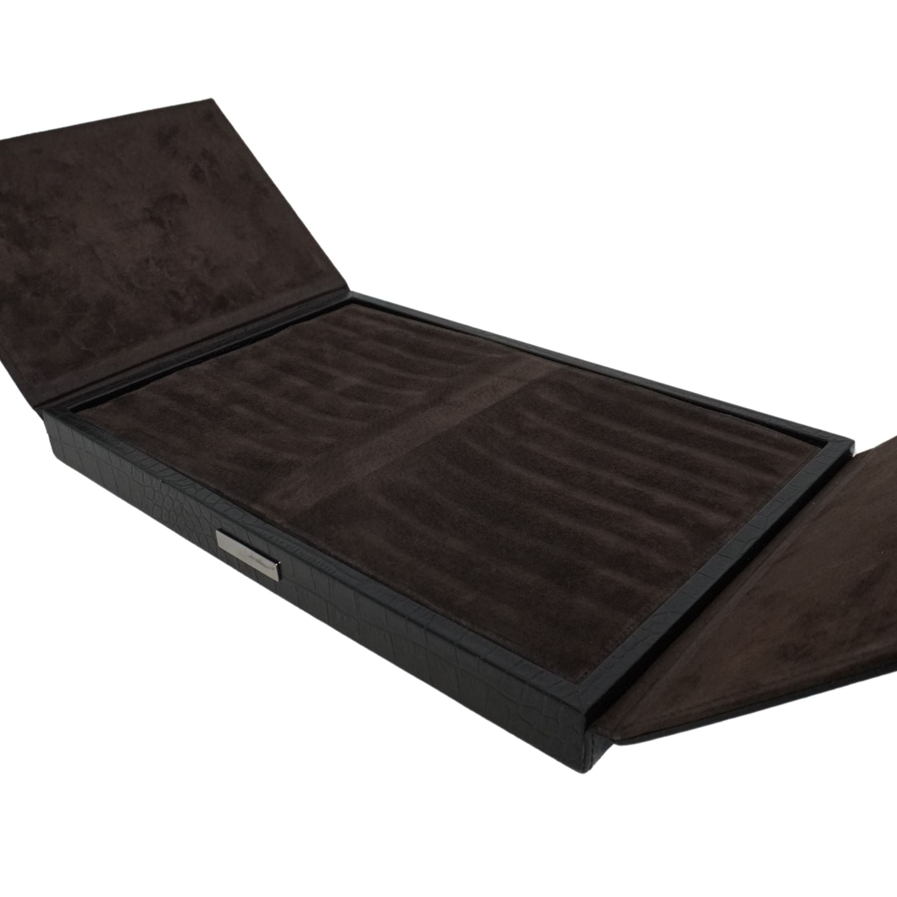 Gucci storage case in dark brown croc-embossed leather with a brown suede interior and individual narrow storage slots. Perfect for storing jewelry like necklaces or bracelets.