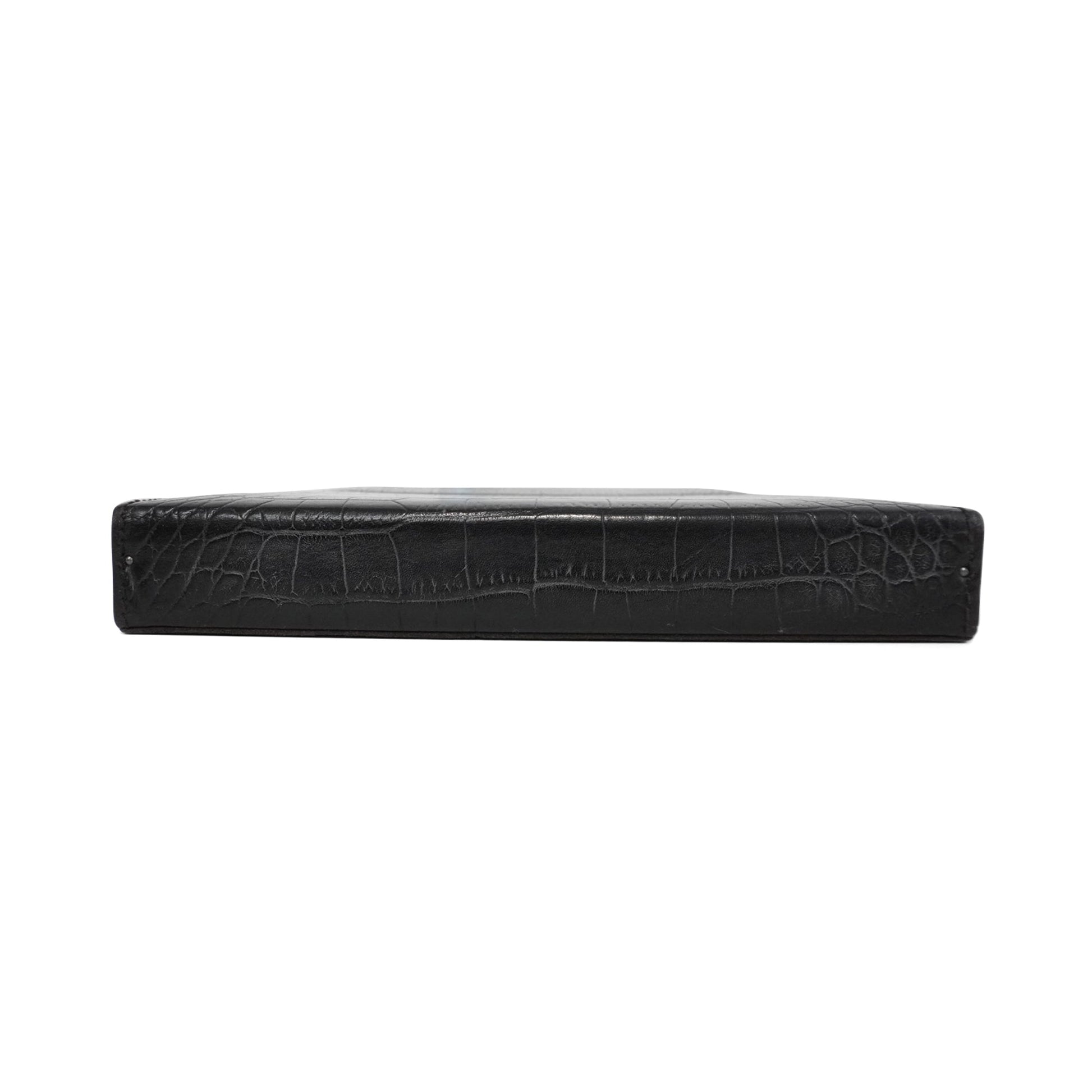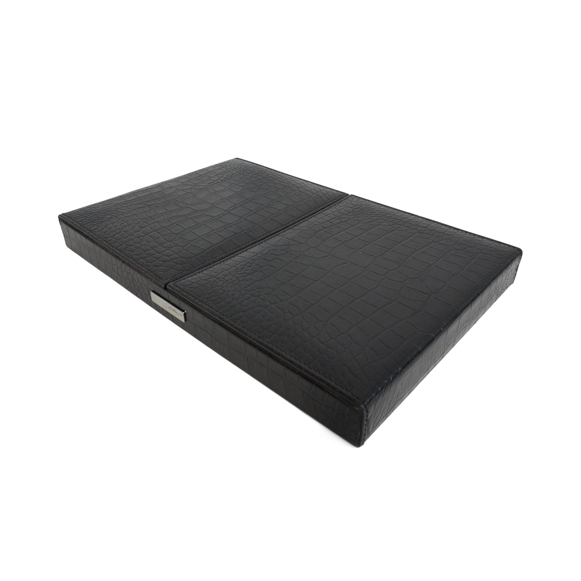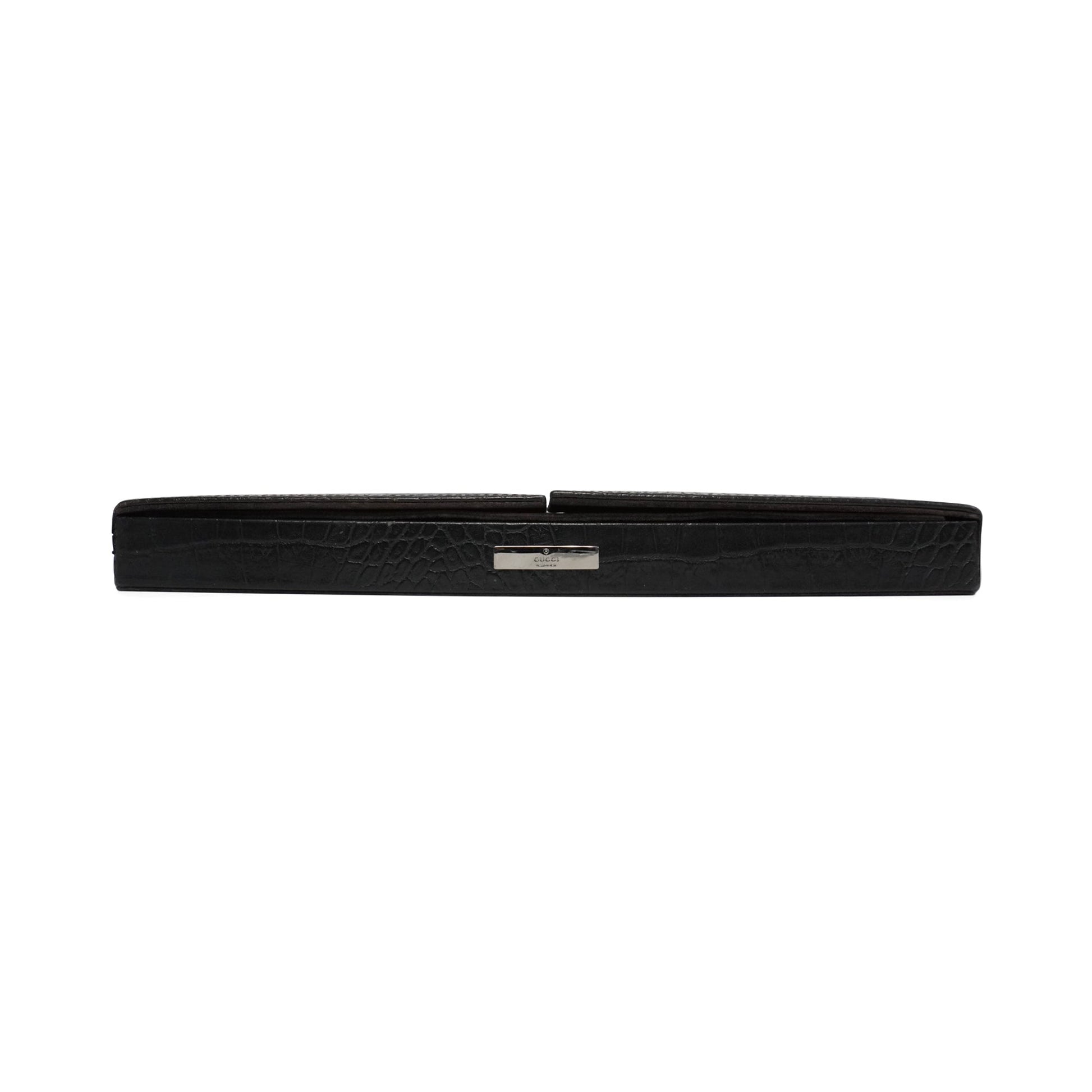 Gucci storage case in dark brown croc-embossed leather with a brown suede interior and individual narrow storage slots. Perfect for storing jewelry like necklaces or bracelets.